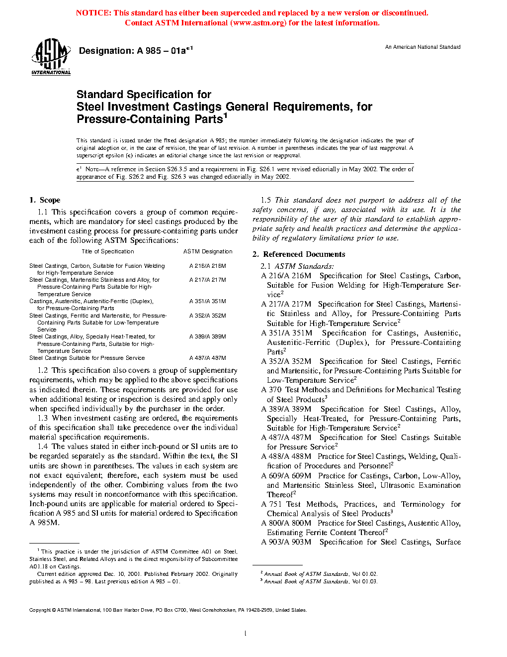 1.1 This specification covers a group of common requirements, which are mandatory for steel castings produced by the investment casting process for pressure-containing parts under each of the following ASTM Specifications: