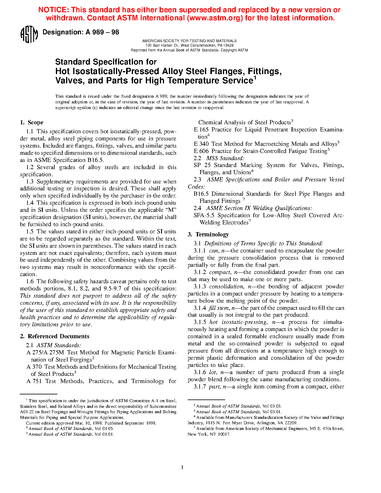 1.1 This specification covers hot isostatically-pressed, powder metal, alloy steel piping components for use in pressure systems. Included are flanges, fittings, valves, and similar parts made to specified dimensions or to dimensional standards, such as in ASME Specification B16.5.