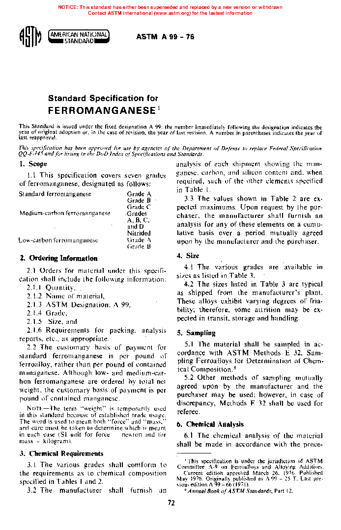 This specification covers standards for ferromanganese (Grades A, B, and C), medium-carbon ferromanganese (Grades A, B, C, D, and nitrided) and low-carbon ferromanganese (Grades A and B). The ferroalloys shall conform to manganese, carbon, silicon, phosphorus, sulfur, and nitrogen contents specific to different material grades. Materials shall also adhere to content limits of arsenic, tin, lead and chromium. The material shall be available in standard sizes, tolerances, and friability ratings.