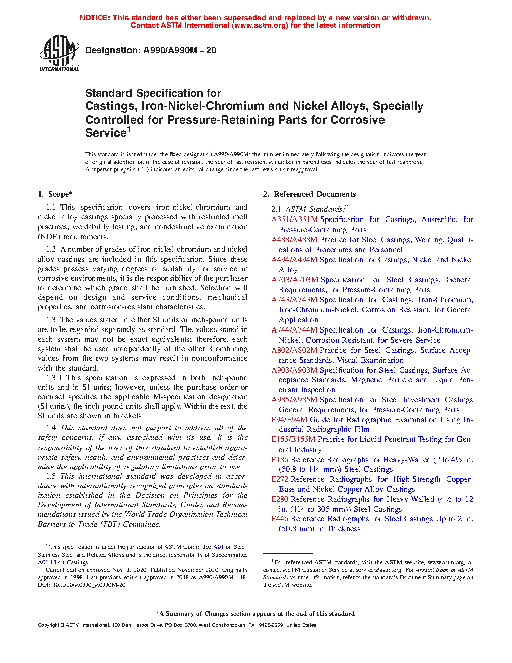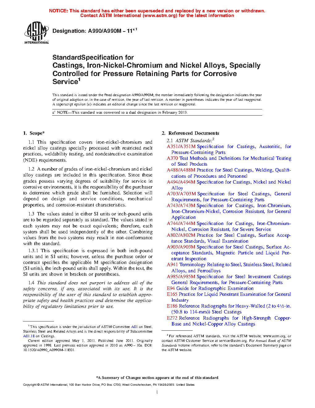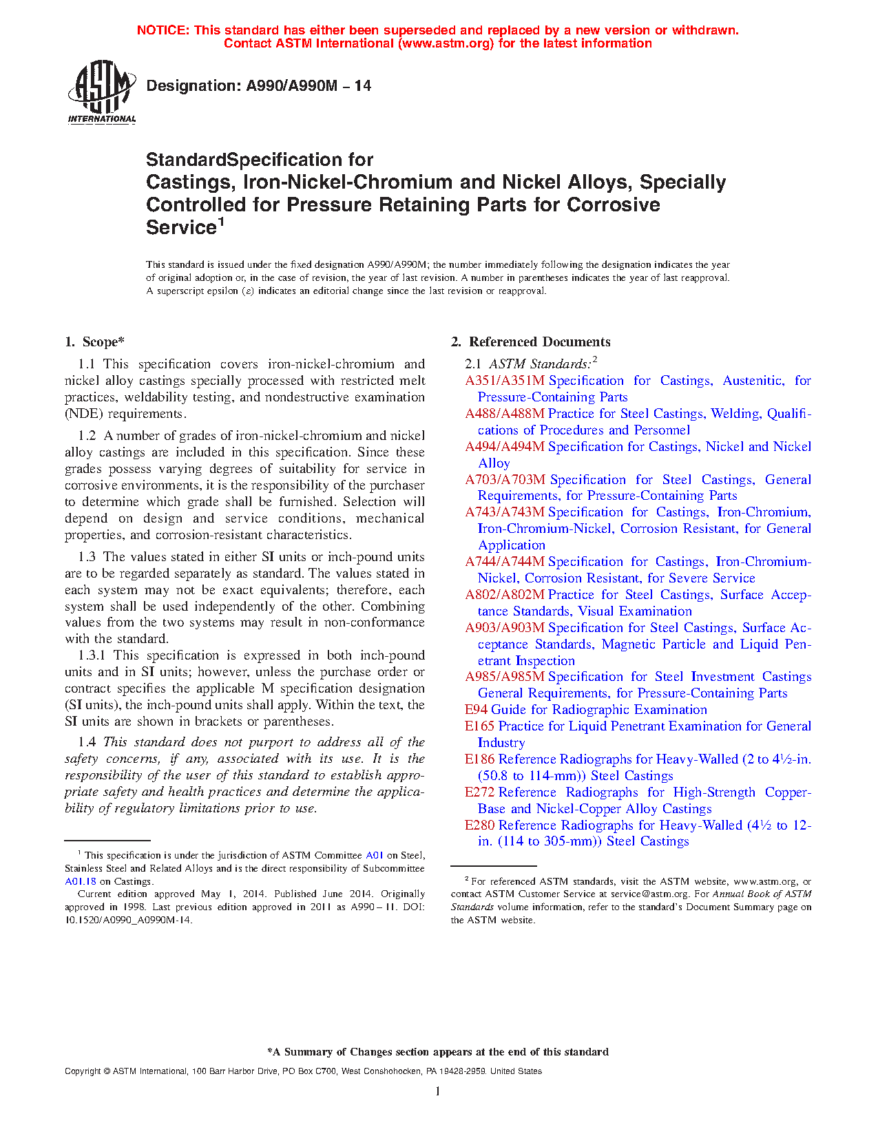 1.1 This specification covers iron-nickel-chromium and nickel alloy castings specially processed with restricted melt practices, weldability testing, and nondestructive examination (NDE) requirements.
