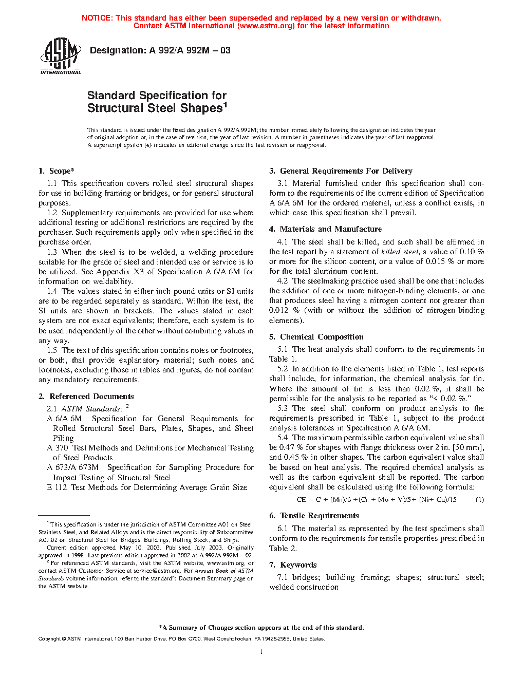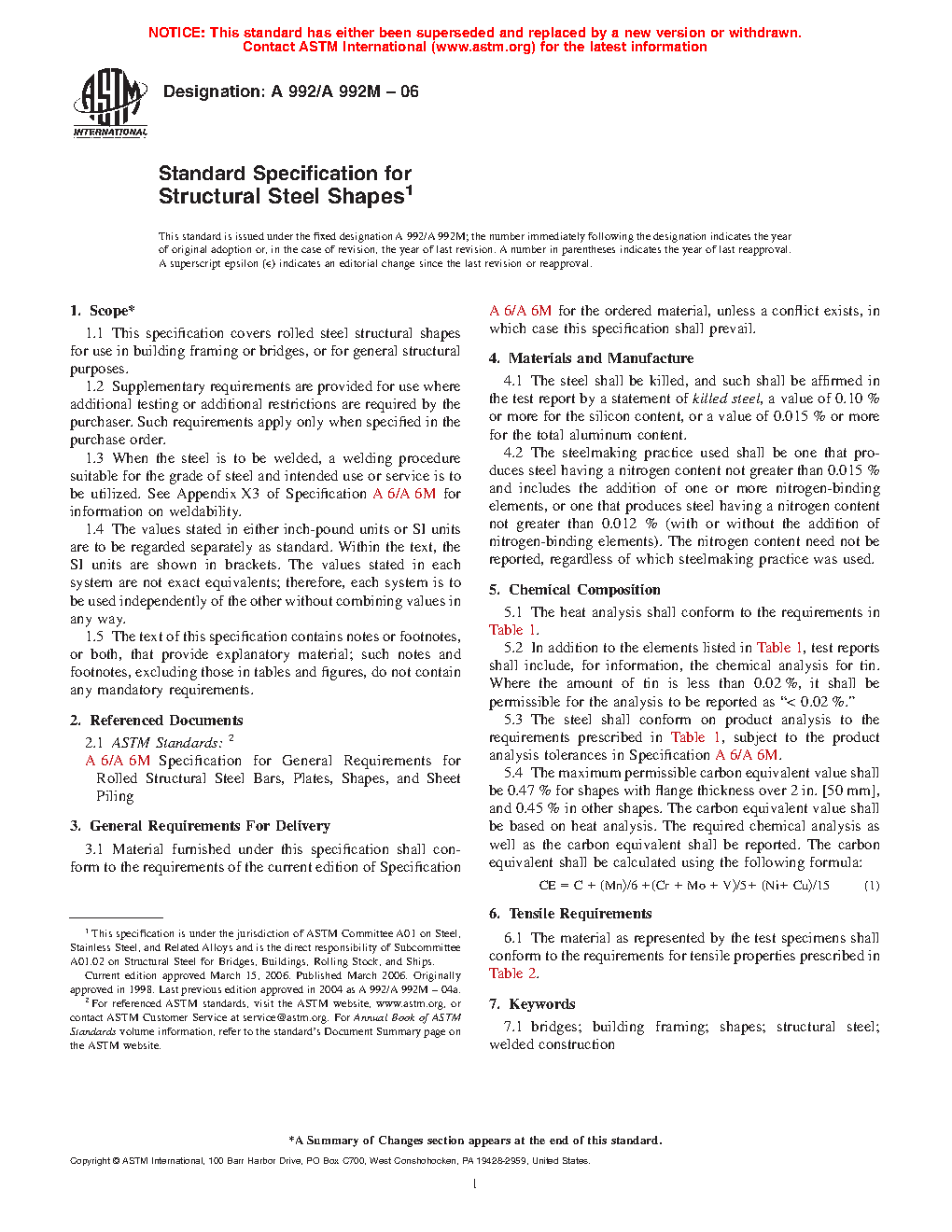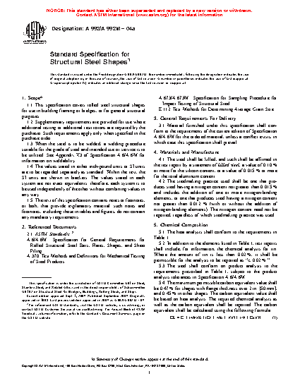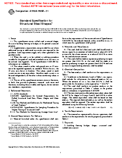 This specification covers rolled steel structural shapes for use in building framing or bridges, or for general structural purposes. Heat analysis shall be used to determine the percentage of carbon, manganese, phosphorus, sulfur, vanadium, titanium, nickel, chromium, molybdenum, columbium, and copper for the required chemical composition. Tension test shall be used to evaluate the required tensile properties such as tensile strength, yield strength and elongation.