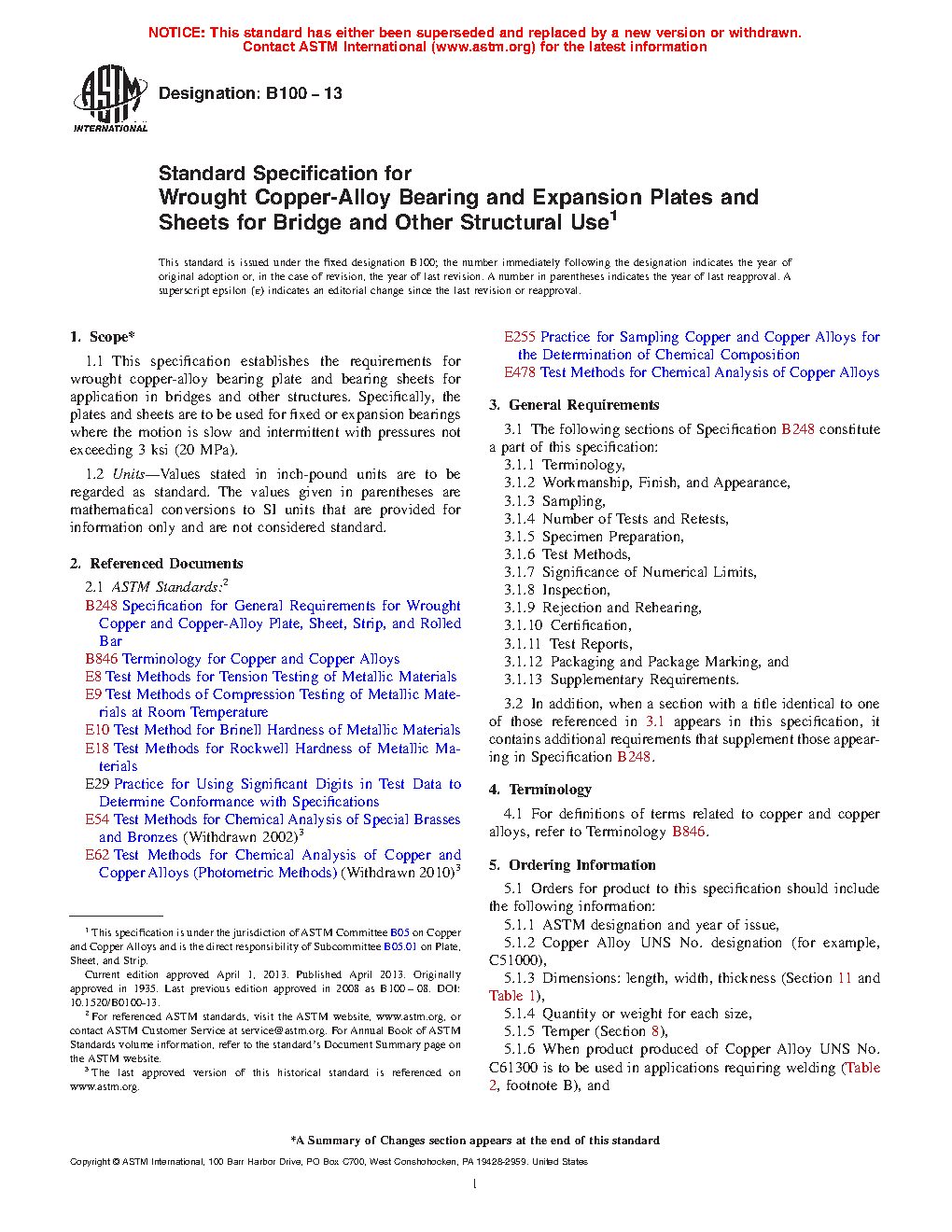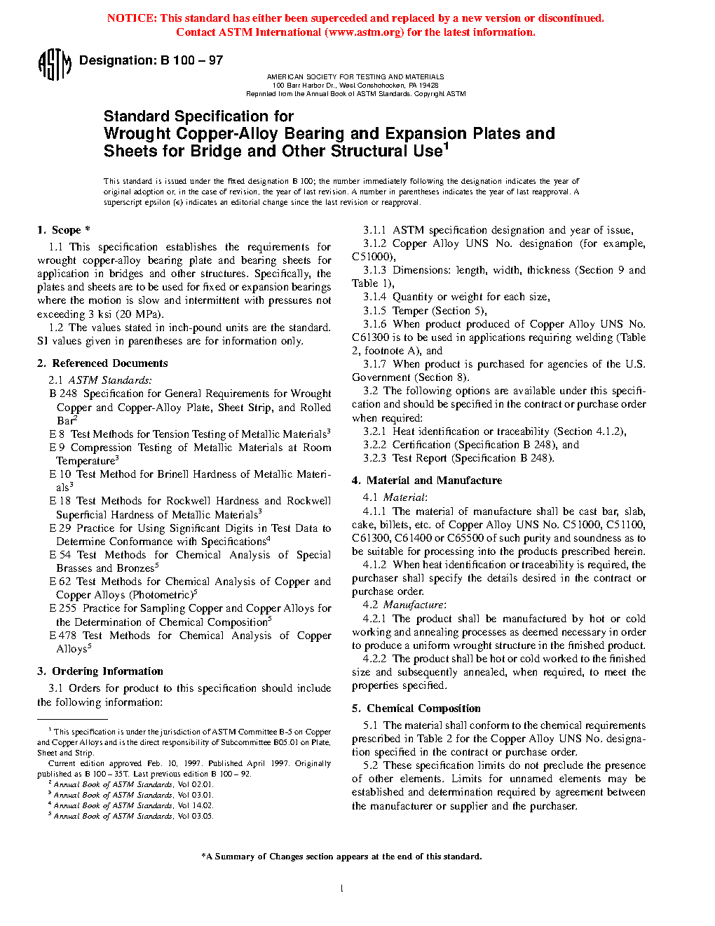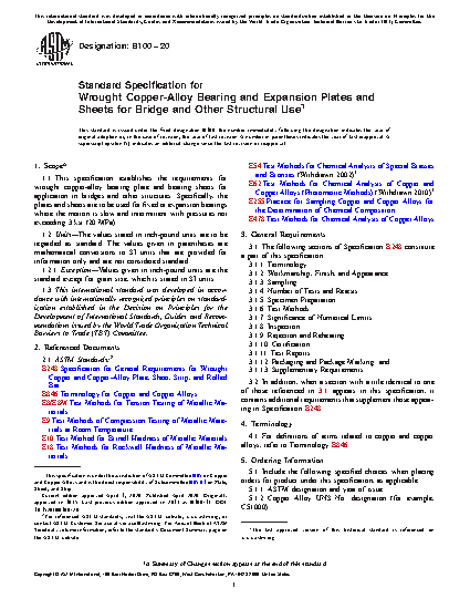 1.1 This specification establishes the requirements for wrought copper-alloy bearing plate and bearing sheets for application in bridges and other structures. Specifically, the plates and sheets are to be used for fixed or expansion bearings where the motion is slow and intermittent with pressures not exceeding 3 ksi (20 MPa).