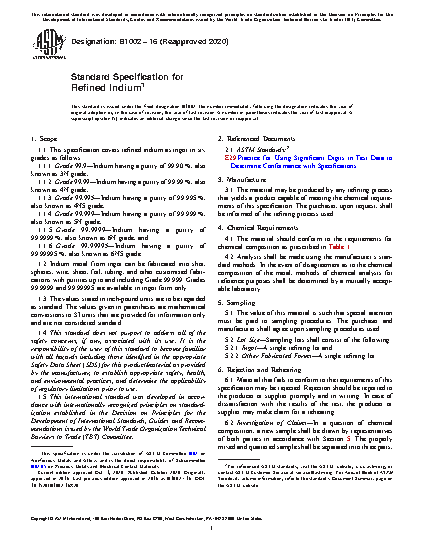 This specification covers requirements for refined indium as ingot in six grades, namely: Grade 99.9 or 3N grade (indium with a purity of 99.90%); Grade 99.99 or 4N grade (indium with a purity of 99.99%); Grade 99.995 or 4N5 grade (indium with a purity of 99.995%); Grade 99.999 or 5N grade (indium with a purity of 99.999%); Grade 99.9999 or 6N grade (indium with a purity of 99.9999%); and Grade 99.99995 or 6N5 grade (indium with a purity of 99.99995%). Indium metal from ingot can be fabricated into shot, spheres, wire, sheet, foil, tubing, and other customized fabrications with purities up to and including Grade 99.999. Grades 99.9999 and 99.99995 are available in ingot form only.