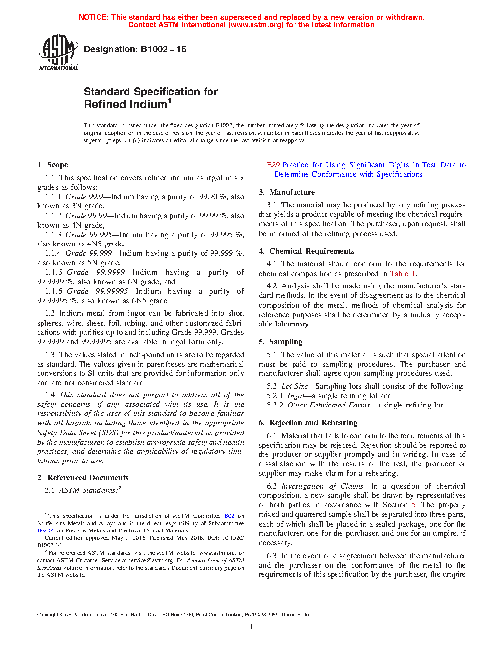 This specification covers requirements for refined indium as ingot in six grades, namely: Grade 99.9 or 3N grade (indium with a purity of 99.90%); Grade 99.99 or 4N grade (indium with a purity of 99.99%); Grade 99.995 or 4N5 grade (indium with a purity of 99.995%); Grade 99.999 or 5N grade (indium with a purity of 99.999%); Grade 99.9999 or 6N grade (indium with a purity of 99.9999%); and Grade 99.99995 or 6N5 grade (indium with a purity of 99.99995%). Indium metal from ingot can be fabricated into shot, spheres, wire, sheet, foil, tubing, and other customized fabrications with purities up to and including Grade 99.999. Grades 99.9999 and 99.99995 are available in ingot form only.