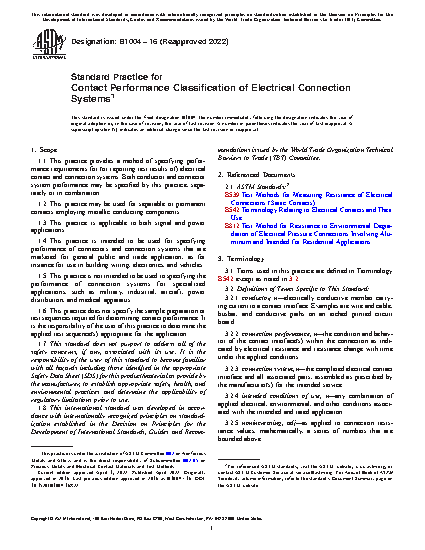 5.1 This practice is based on the use of electrical resistance as an indicator of contact performance. This is the fundamental physical attribute that reflects the condition of the electrical contact interface(s) within a connection. For practical current-carrying electrical connections, resistance may be calculated from potential drop measurements, as described, for example, in Test Method B539 and B812.