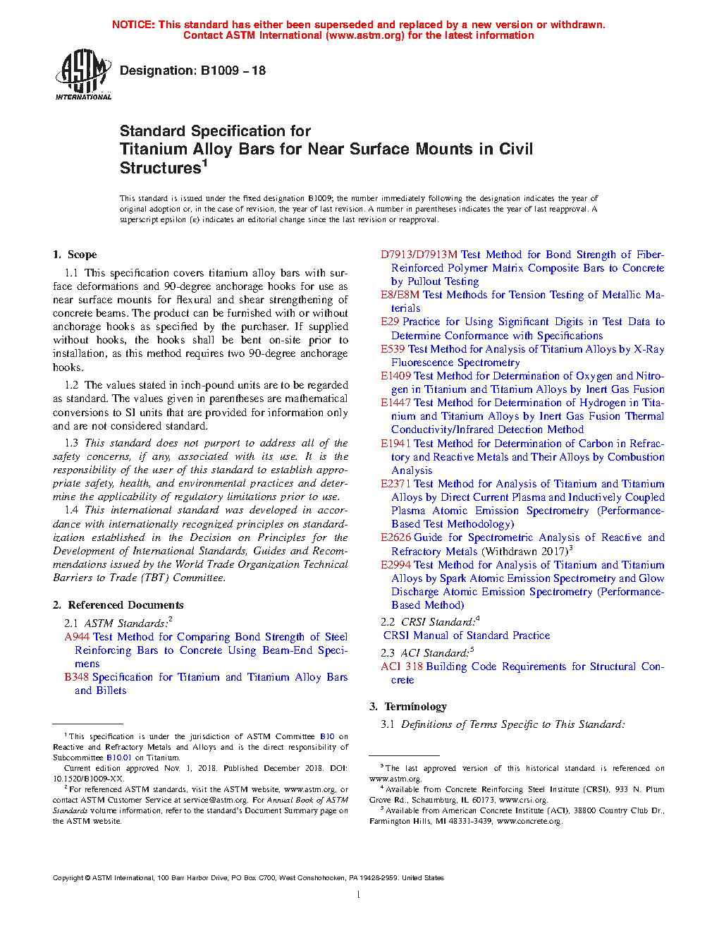 1.1 This specification covers titanium alloy bars with surface deformations and 90-degree anchorage hooks for use as near surface mounts for flexural and shear strengthening of concrete beams. The product can be furnished with or without anchorage hooks as specified by the purchaser. If supplied without hooks, the hooks shall be bent on-site prior to installation, as this method requires two 90-degree anchorage hooks.