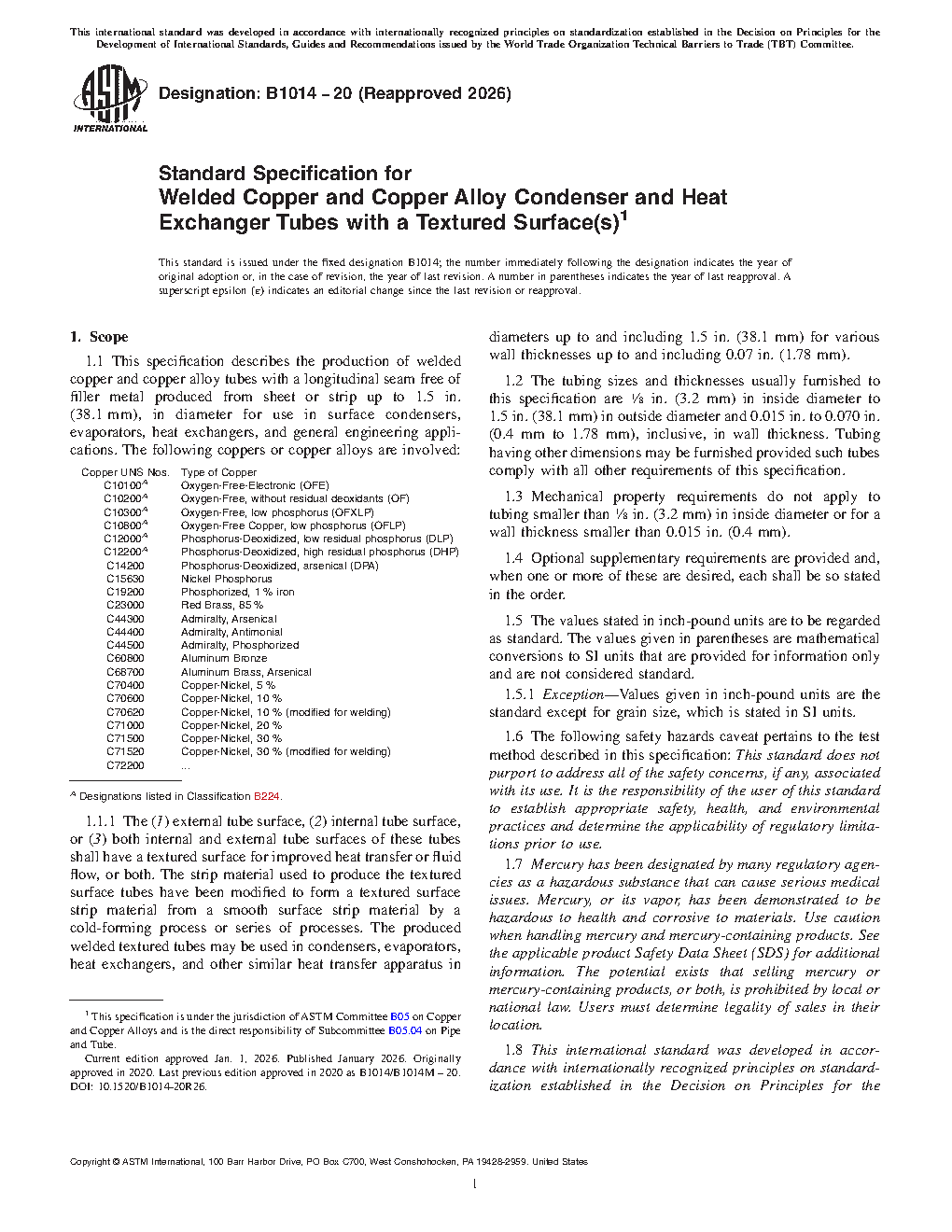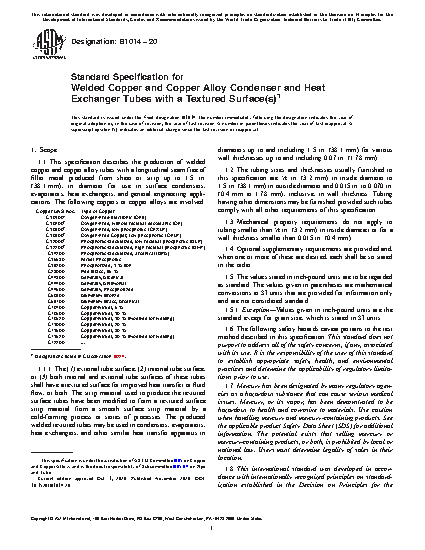1.1.1 The (1) external tube surface, (2) internal tube surface, or (3) both internal and external tube surfaces of these tubes shall have a textured surface for improved heat transfer or fluid flow, or both. The strip material used to produce the textured surface tubes have been modi?ed to form a textured surface strip material from a smooth surface strip material by a cold-forming process or series of processes. The produced welded textured tubes may be used in condensers, evaporators, heat exchangers, and other similar heat transfer apparatus in diameters up to and including 1.5 in. (38.1 mm) for various wall thicknesses up to and including 0.07 in. (1.78 mm).