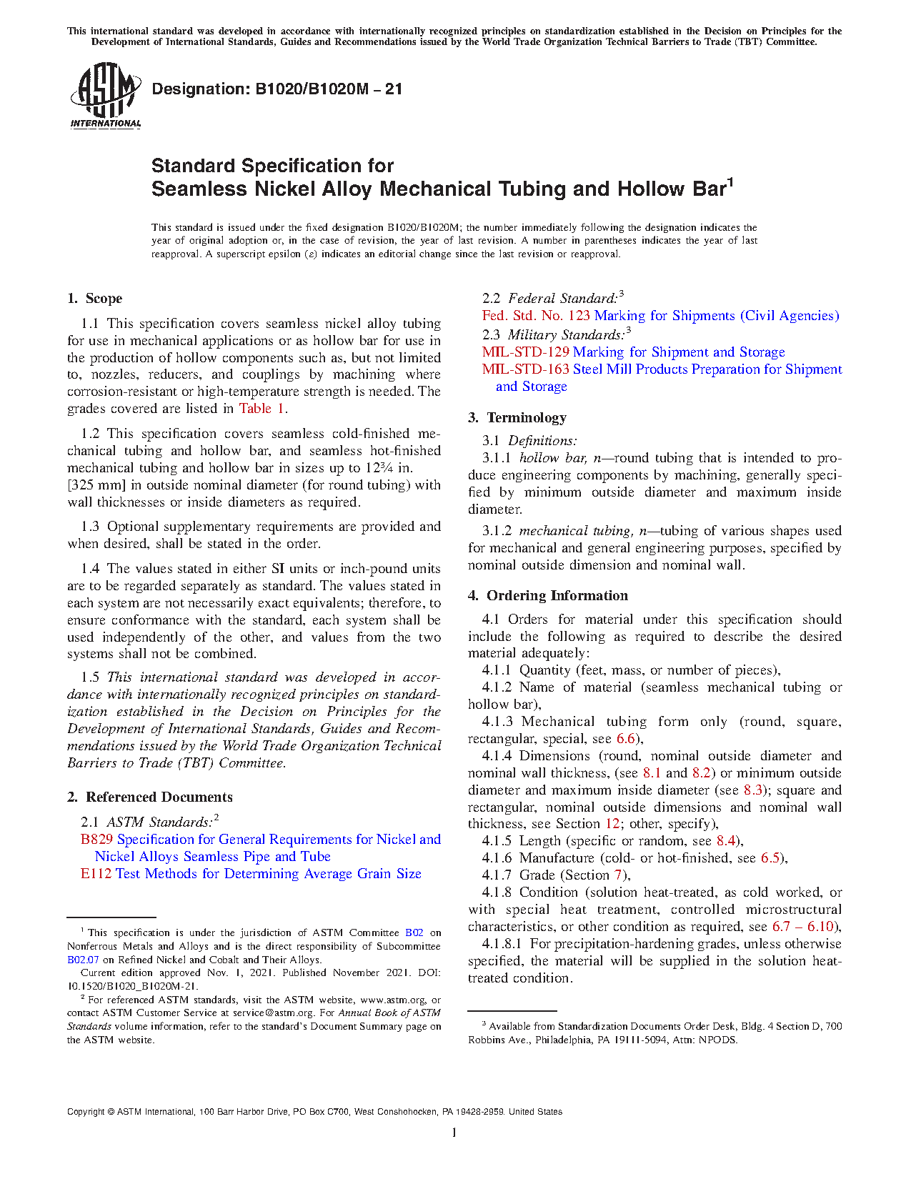 1.1 This specification covers seamless nickel alloy tubing for use in mechanical applications or as hollow bar for use in the production of hollow components such as, but not limited to, nozzles, reducers, and couplings by machining where corrosion-resistant or high-temperature strength is needed. The grades covered are listed in Table 1.