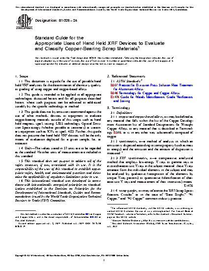 1.1 This document is a guide for the use of portable hand held XRF analyzers for the determination of chemistry, quality, or grading of scrap copper and copper-based alloys.
