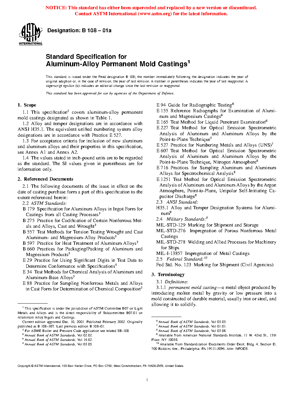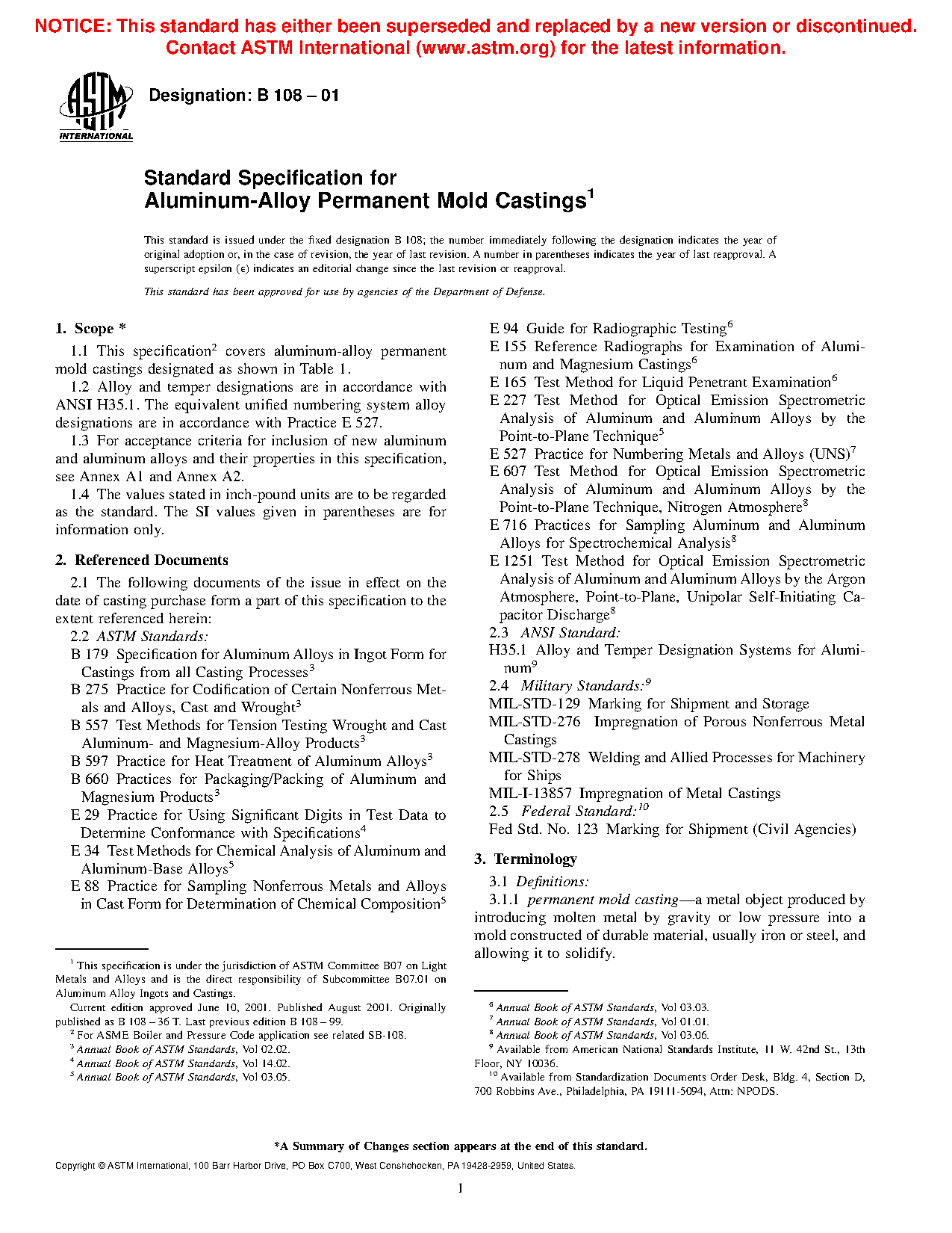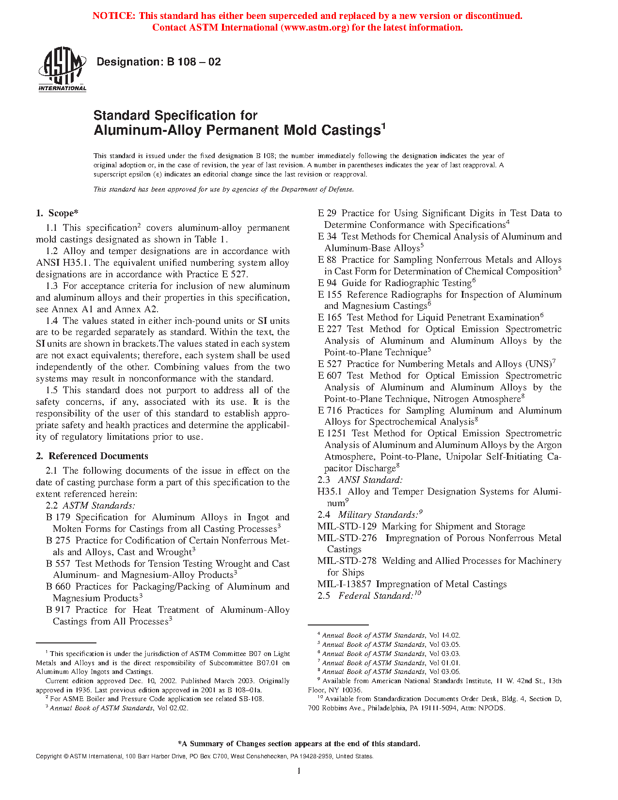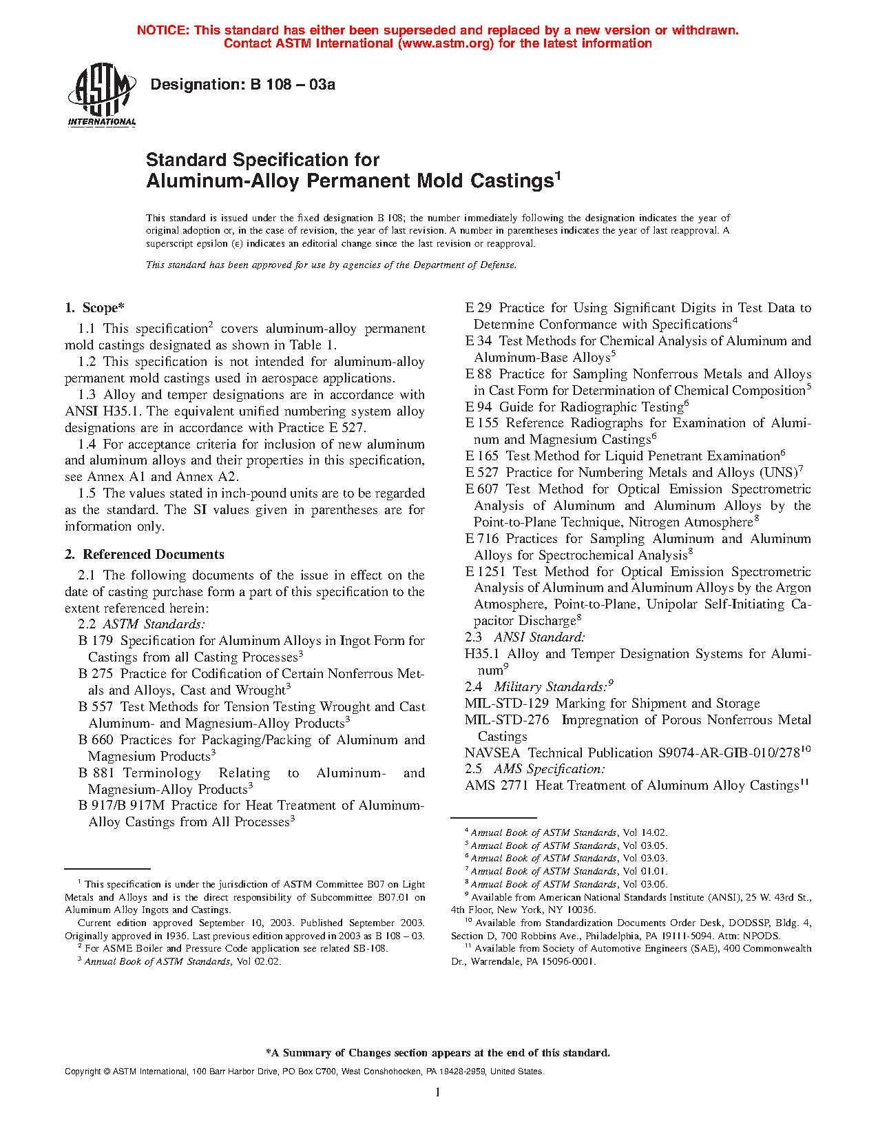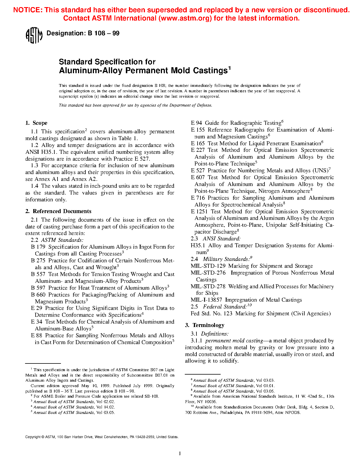 1.2 This specification is not intended for aluminum-alloy permanent mold castings used in aerospace applications.