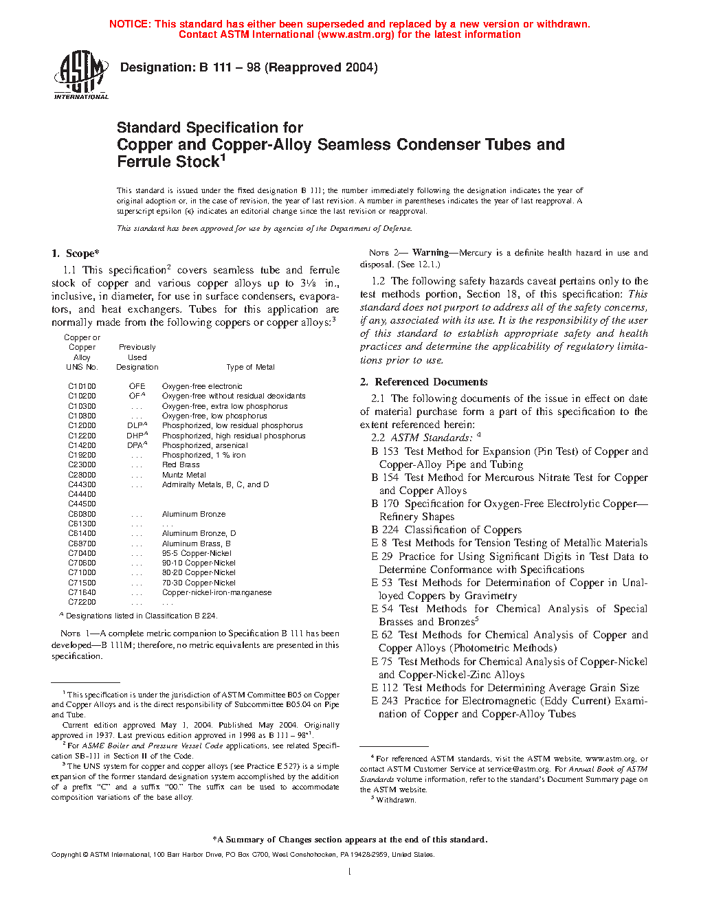 1.1 This specification establishes the requirements for seamless tube and ferrule stock of copper and various copper alloys up to 31/8 in. [80 mm] inclusive, in diameter, for use in surface condensers, evaporators, and heat exchangers. The following coppers and copper alloys are specified: (