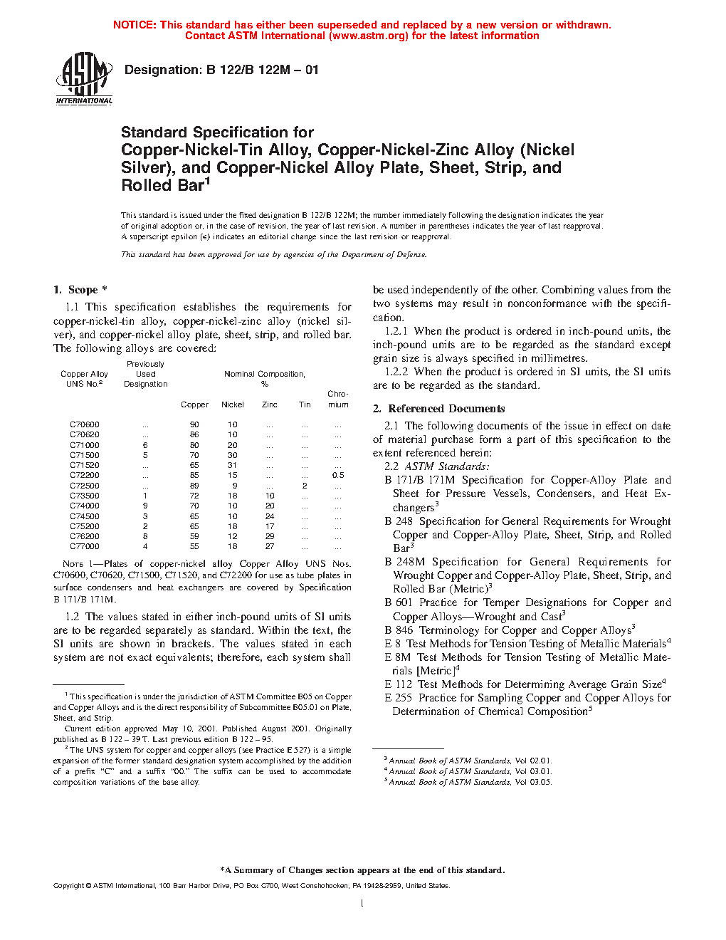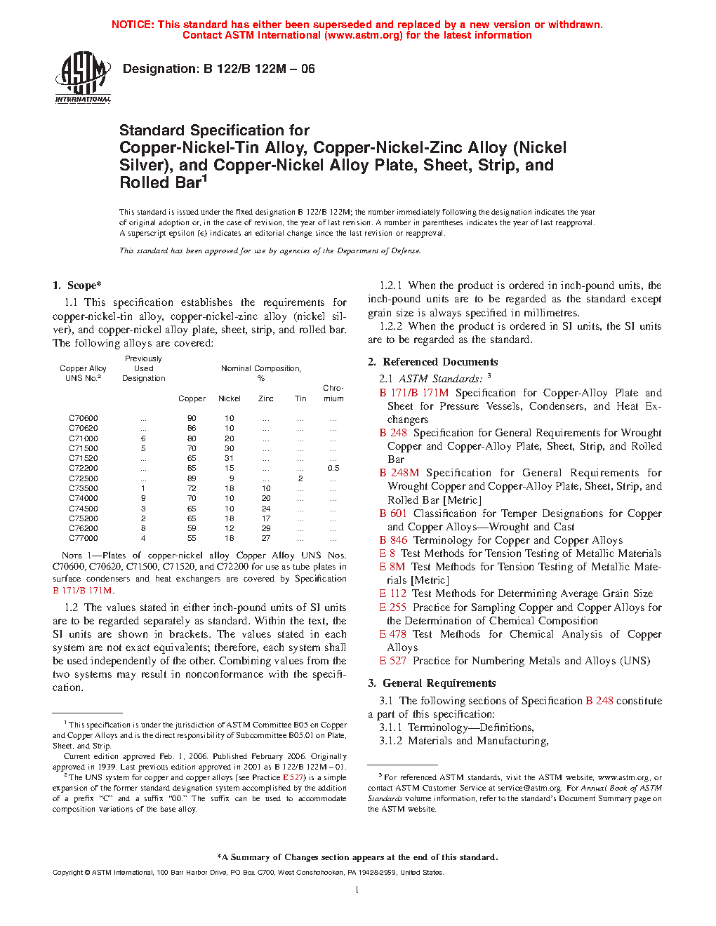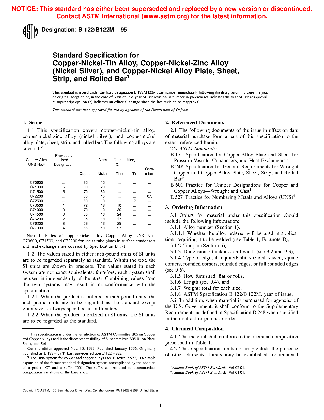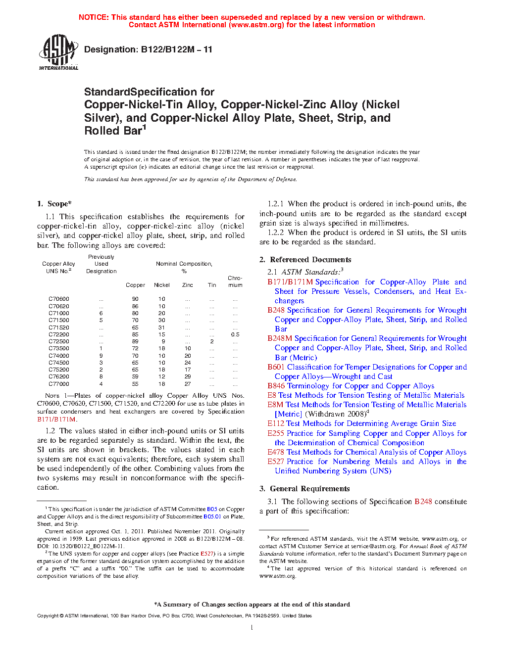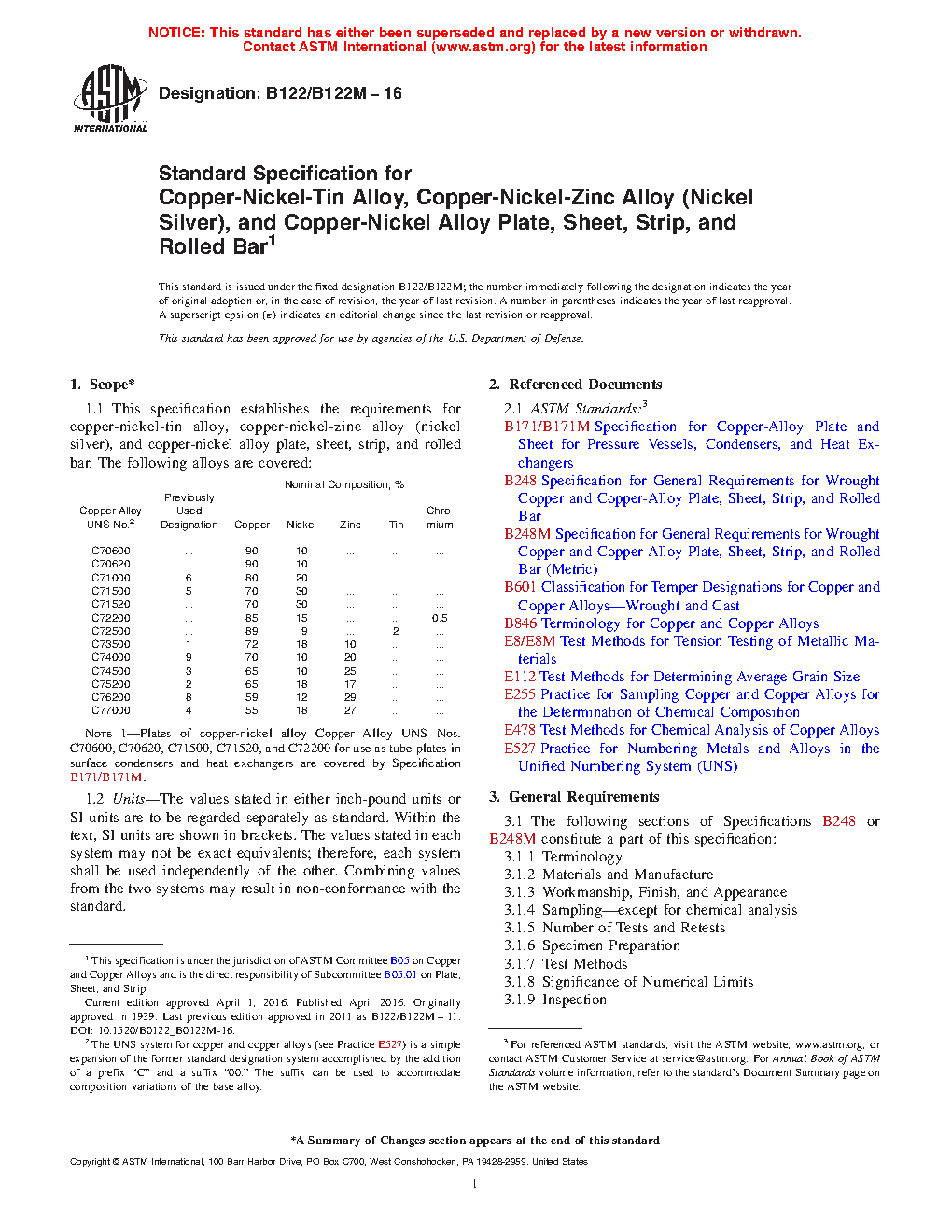 1.1 This specification establishes the requirements for copper-nickel-tin alloy, copper-nickel-zinc alloy (nickel silver), and copper-nickel alloy plate, sheet, strip, and rolled bar. The following alloys are covered: