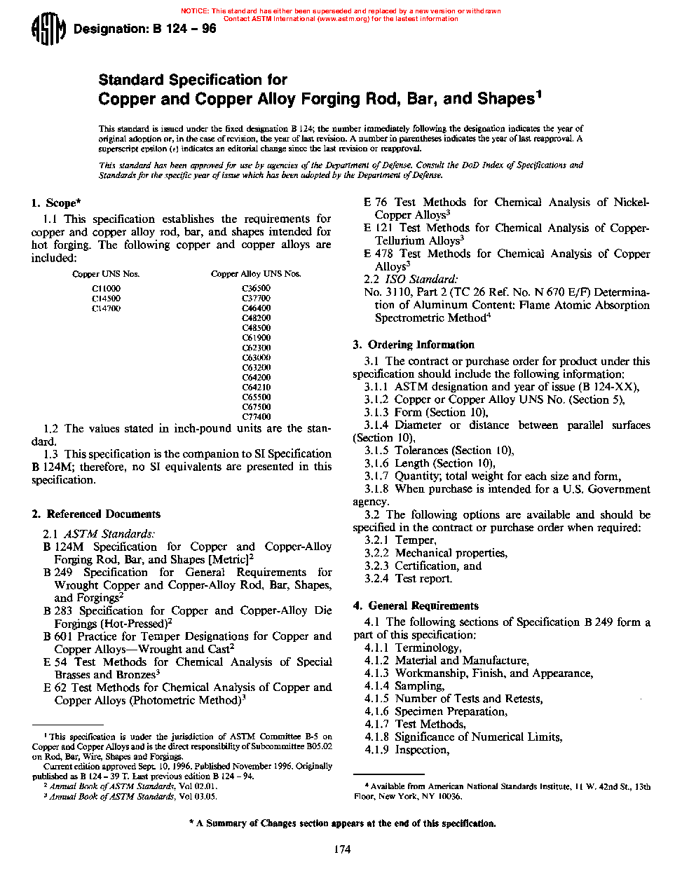 1.1 This specification establishes the requirements for copper and copper alloy rod, bar, and shapes intended for hot forging. The following copper and copper alloys are included: