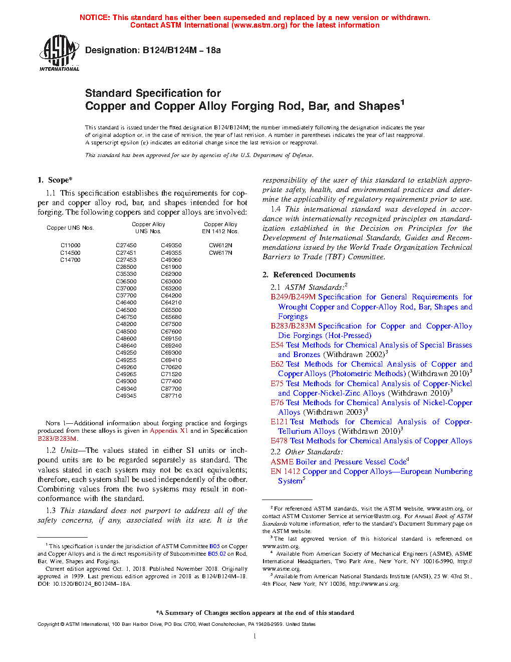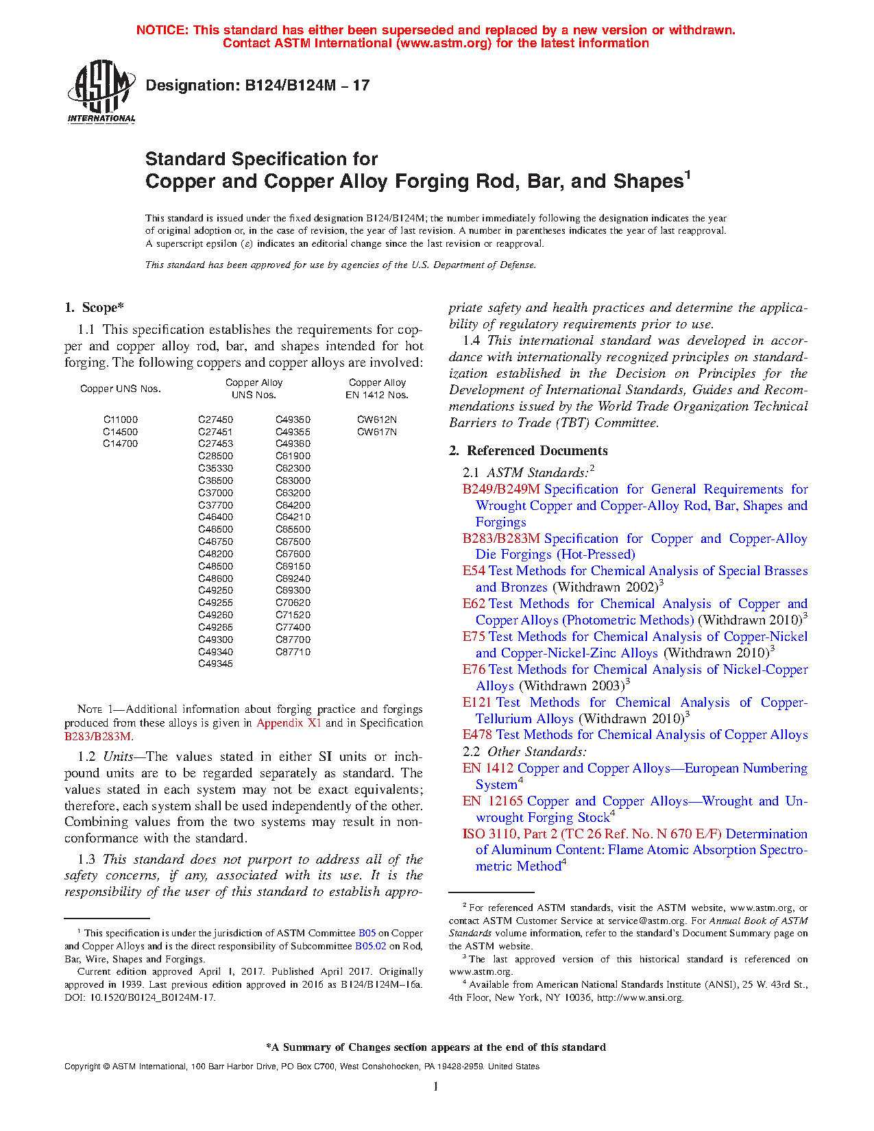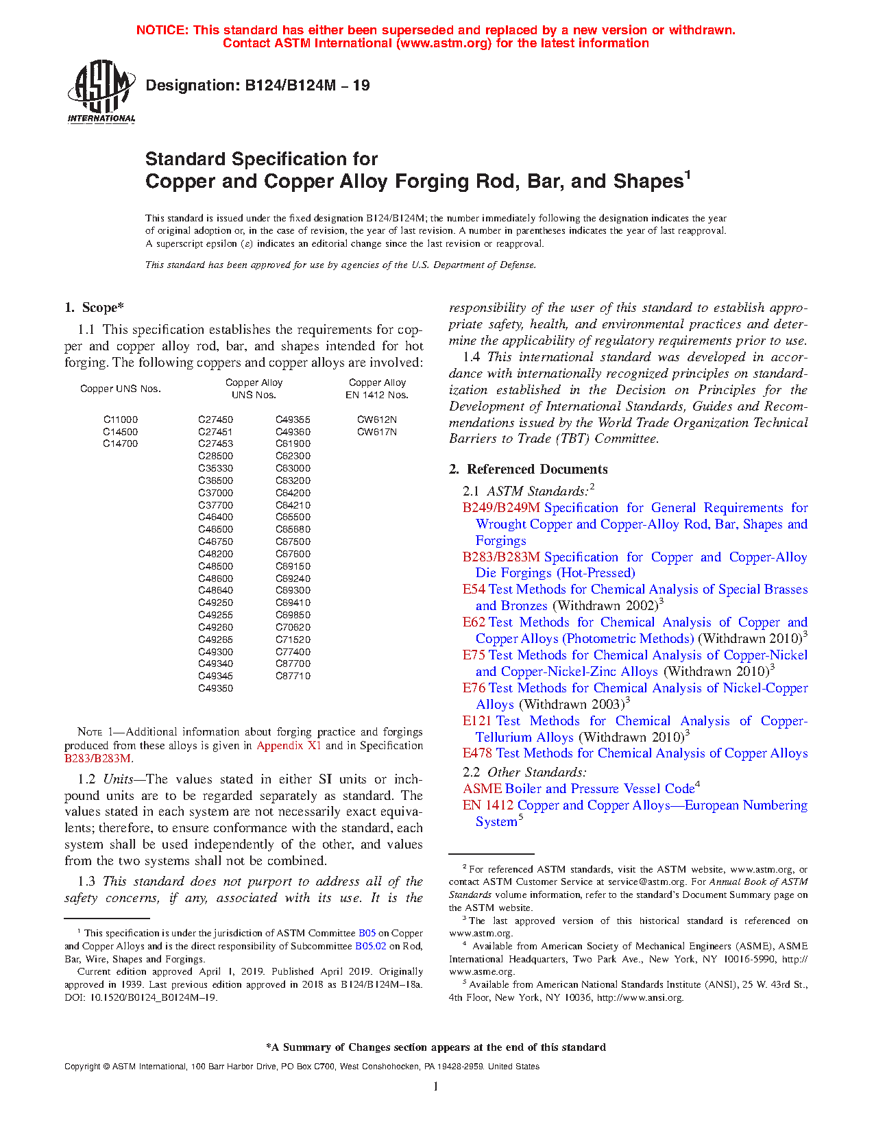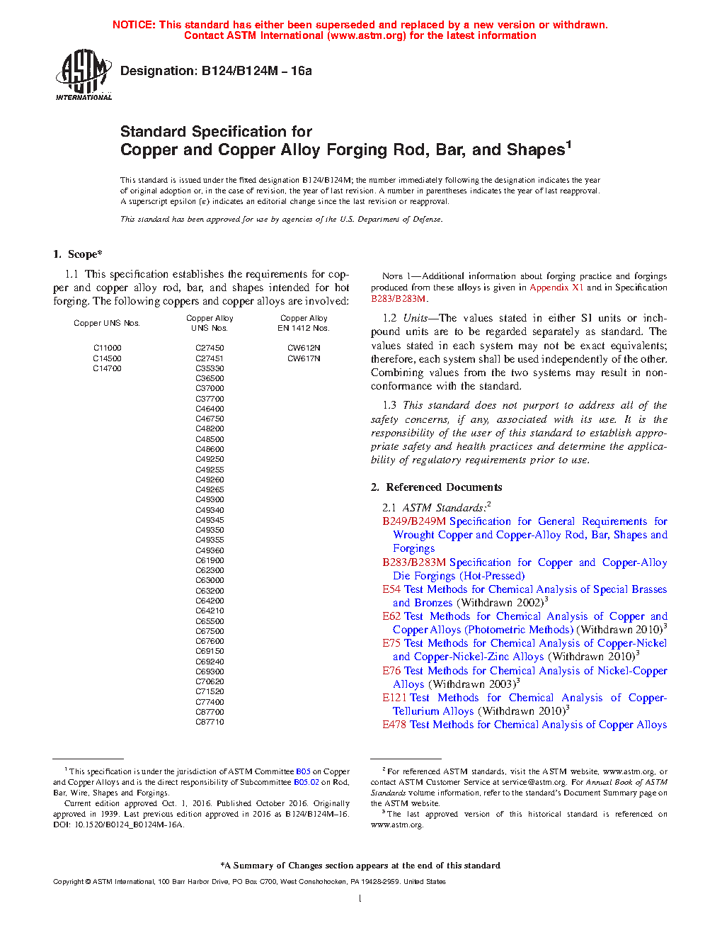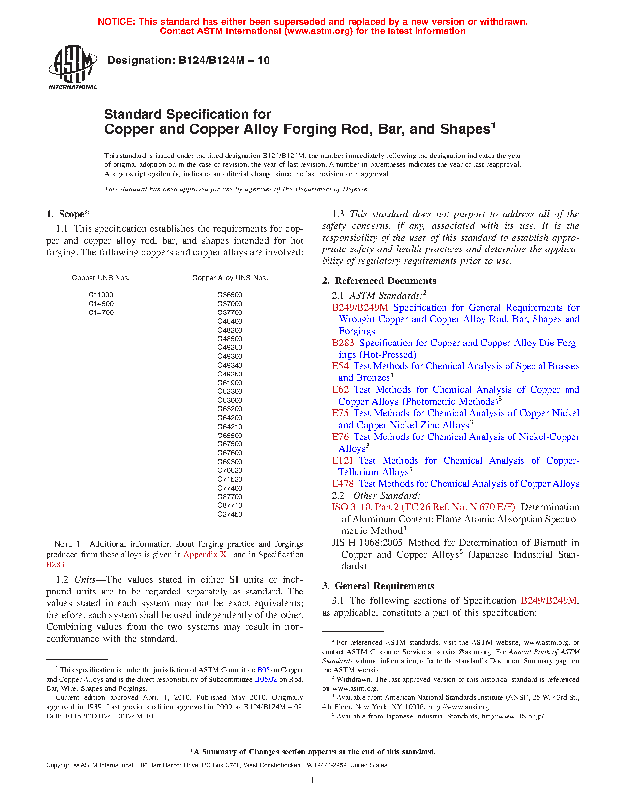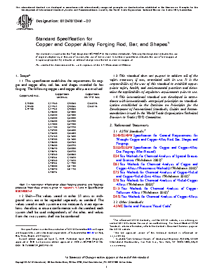1.1 This specification establishes the requirements for copper and copper alloy rod, bar, and shapes intended for hot forging. The following coppers and copper alloys are involved: