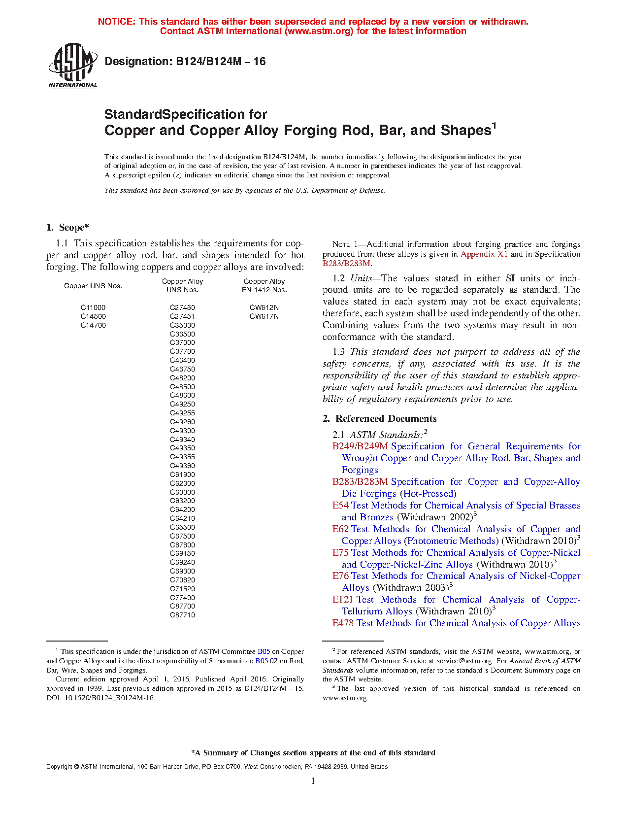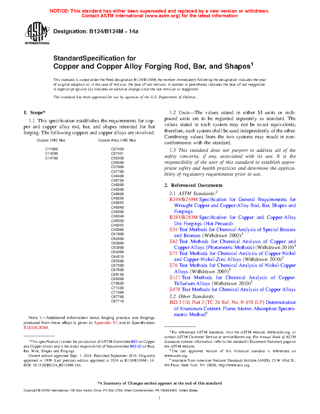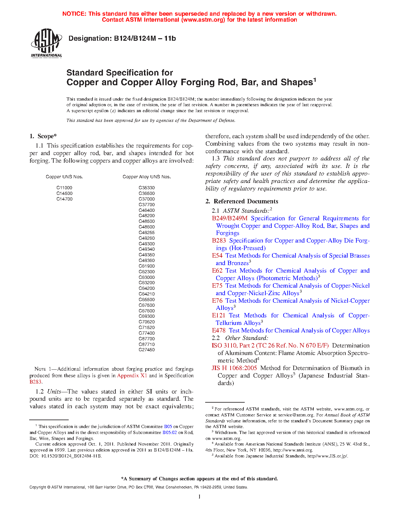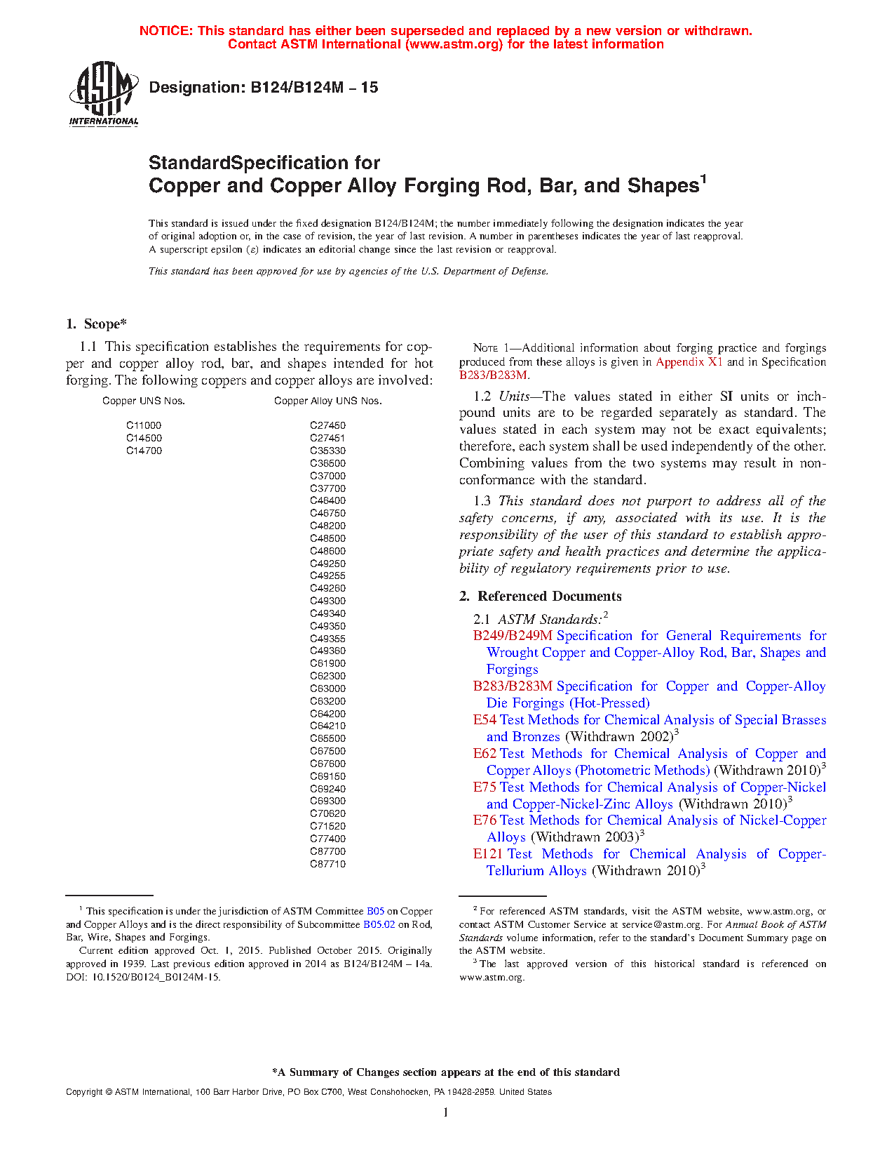 1.1 This specification establishes the requirements for copper and copper alloy rod, bar, and shapes intended for hot forging. The following coppers and copper alloys are involved: