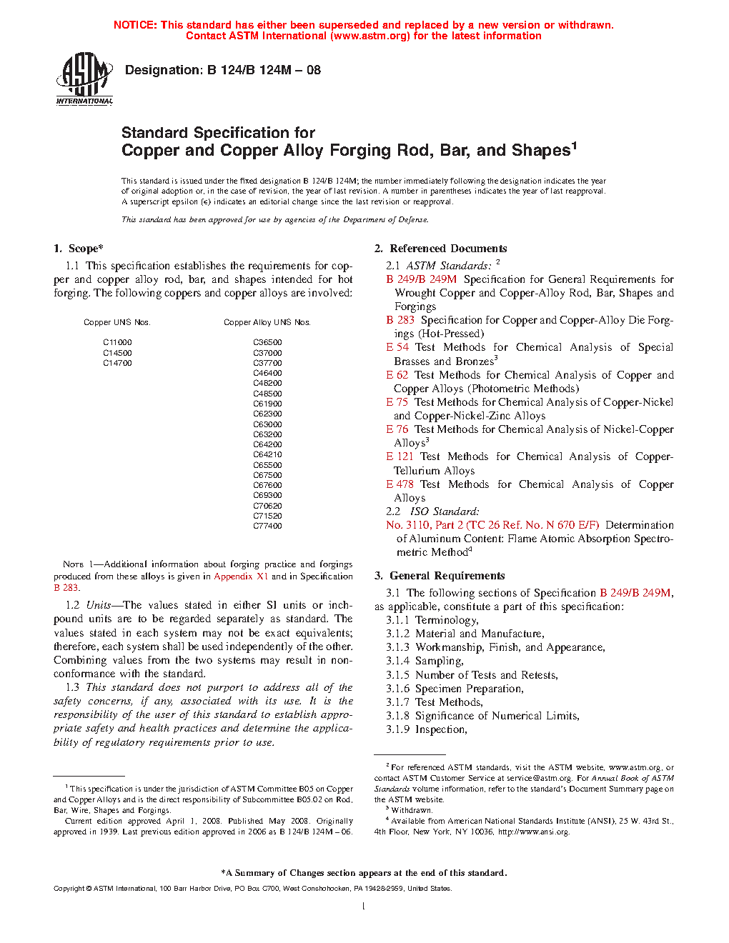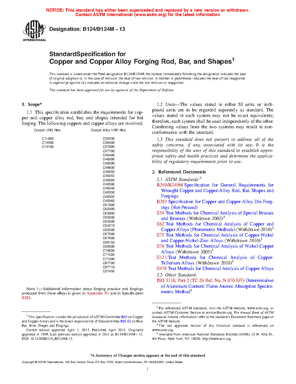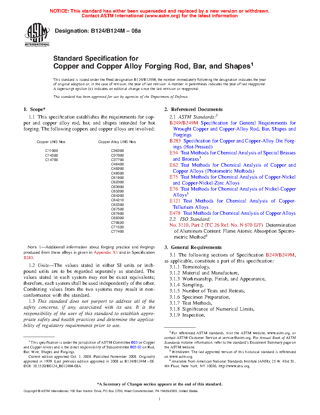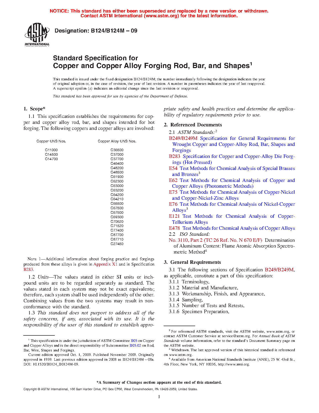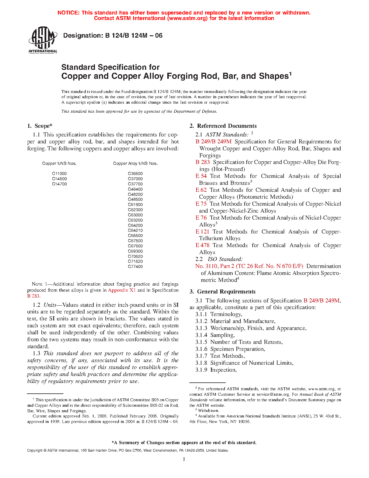 1.1 This specification establishes the requirements for copper and copper alloy rod, bar, and shapes intended for hot forging. The following coppers and copper alloys are involved: