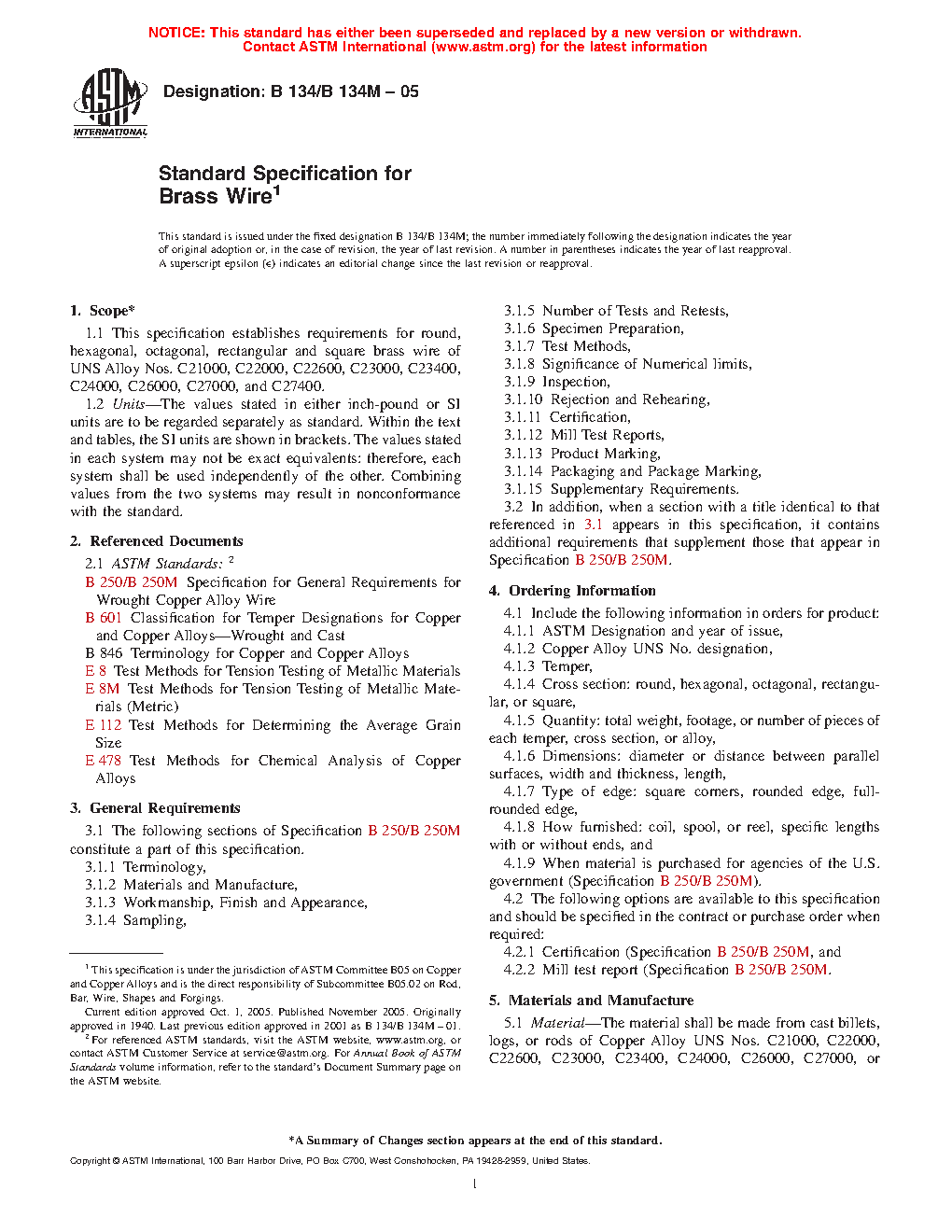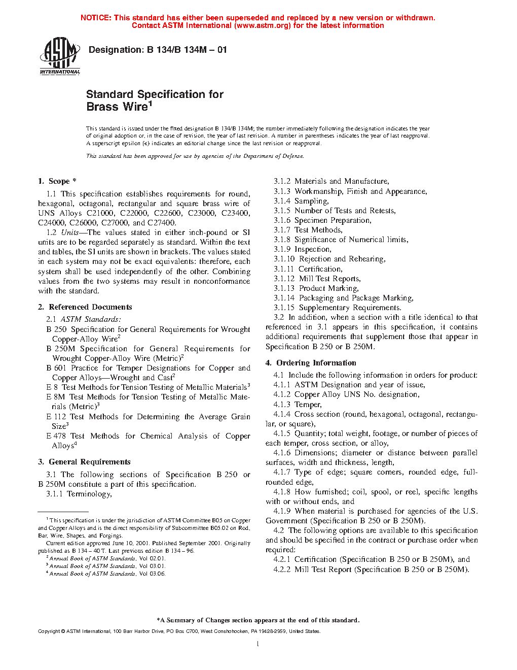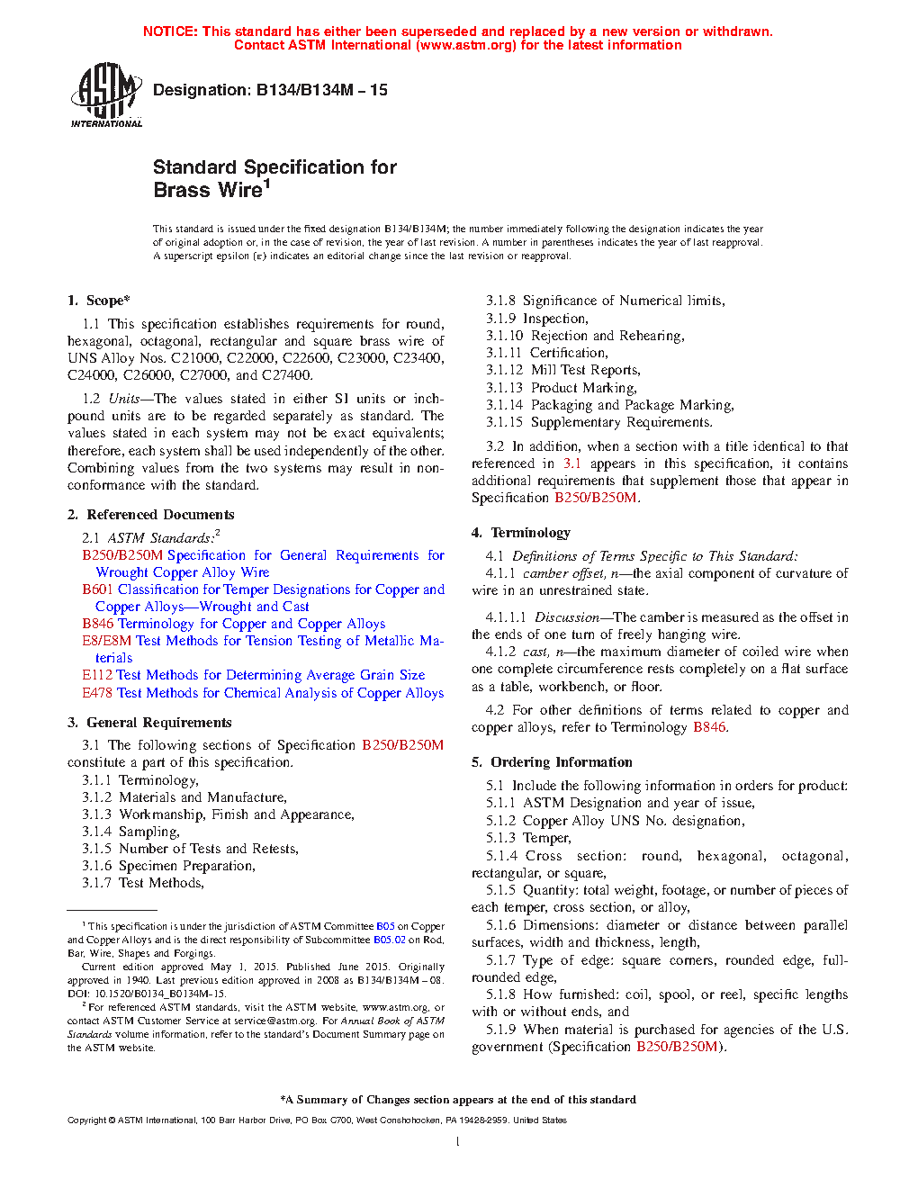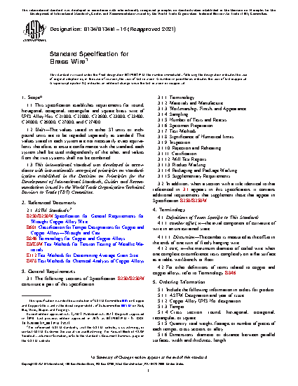 This specification establishes the requirements for round, hexagonal, octagonal, rectangular and square brass wire of UNS Alloy Nos. C21000, C22000, C22600, C23000, C23400, C24000, C26000, C27000, and C27400. The chemical composition, temper, annealed wire grain size, Rockwell hardness, and tensile strength requirements are detailed.