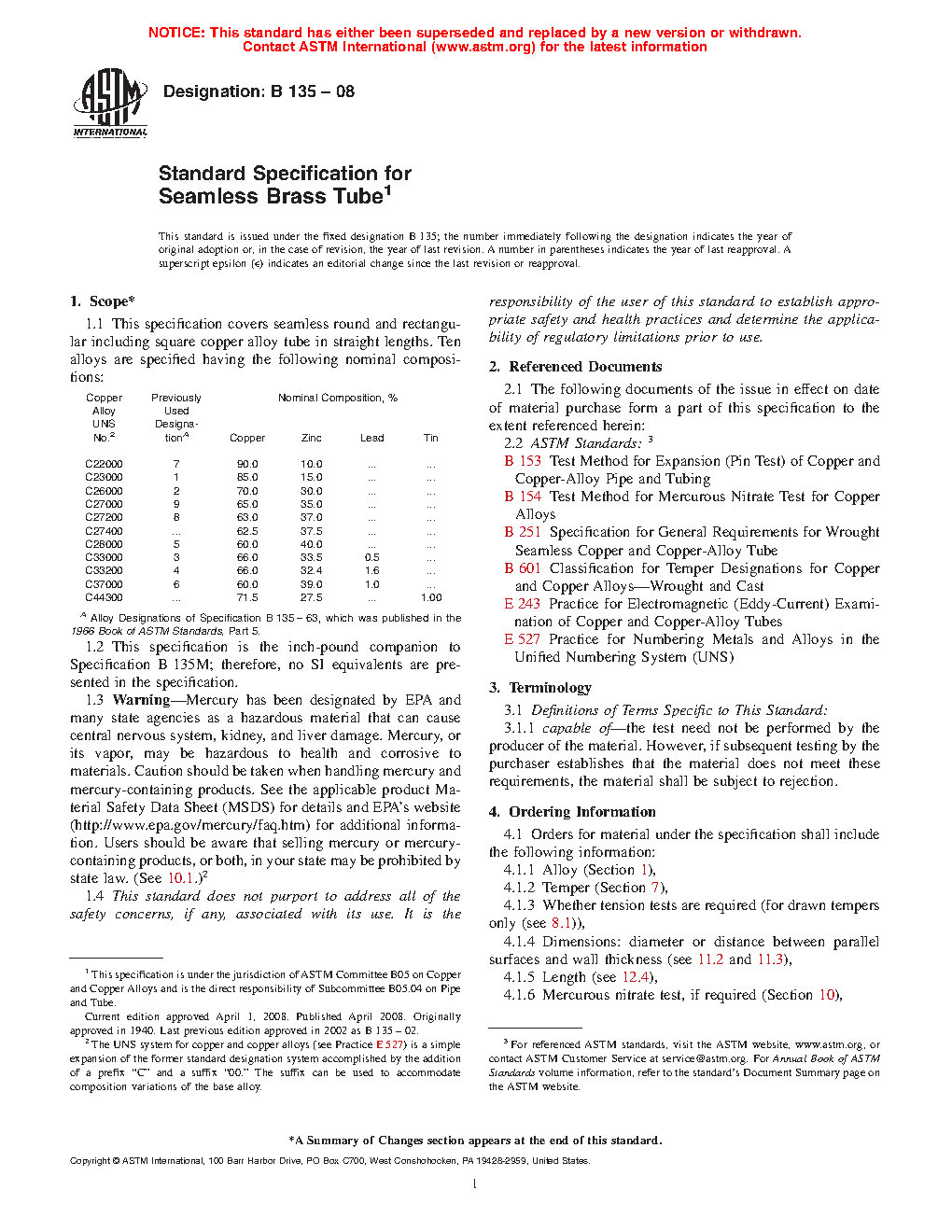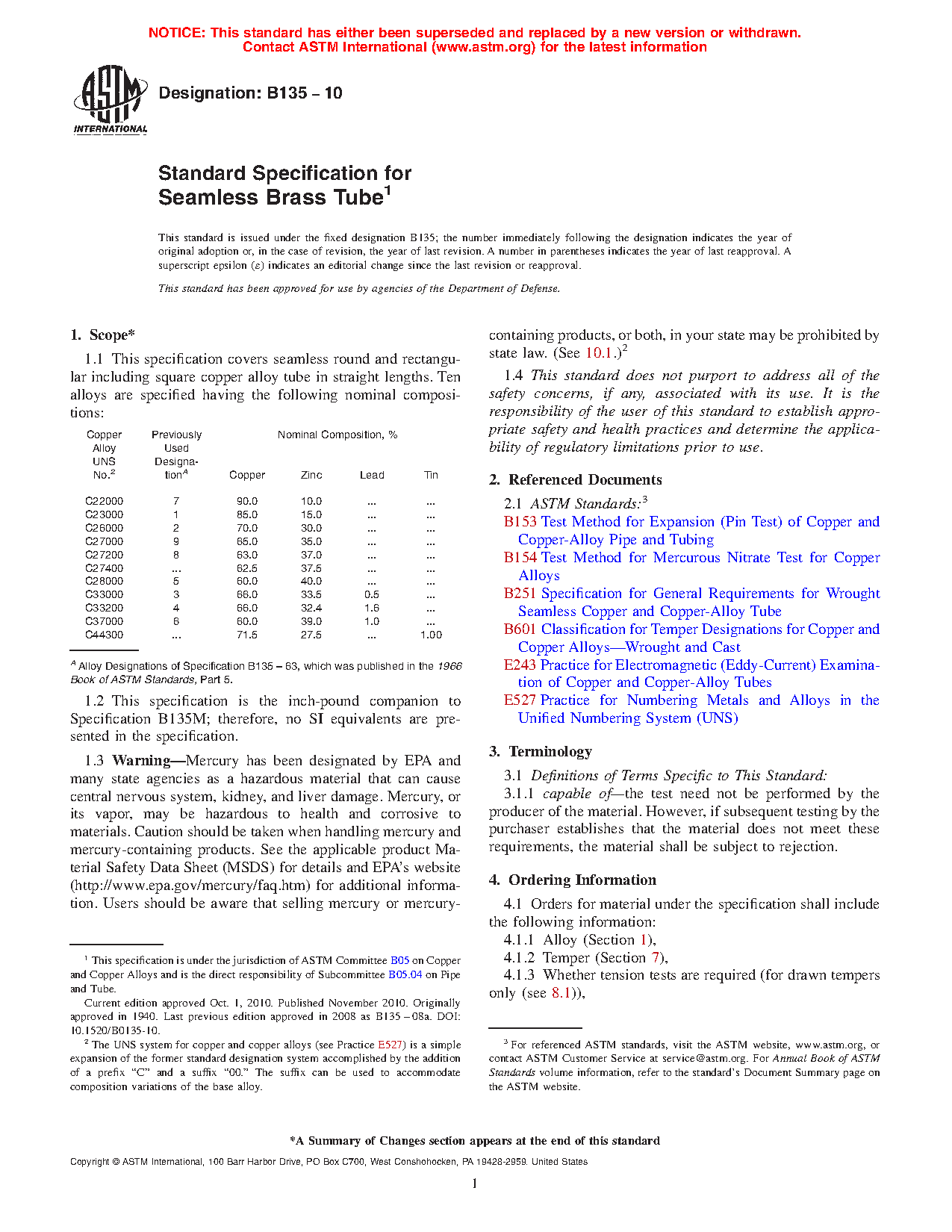 This specification covers seamless round and rectangular including square copper alloy tube in straight lengths. The tempers of drawn tube shall be designated as light-drawn, drawn, and hard-drawn. Light-drawn temper shall be used only when a tube of some stiffness but yet capable of being bent is needed. Drawn temper, which is most commonly used where there is no specific requirement for high strength on the one hand, shall be utilized for general purposes and or for bending qualities on the other. Hard-drawn temper shall be used only where there is need for a tube as strong as is commercially feasible for the sizes indicated. For any combination of diameter and wall thickness not covered under hard-drawn temper, the values given for drawn temper shall be used. Expansion test shall be performed on the rounded tube and shall show no cracking or rupture visible to the unaided eye. Both annealed and drawn tempers shall withstand, after proper cleaning, an immersion in standard mercurous nitrate solution for a certain amount of time without cracking. Materials shall then be removed from the solution and shall be wiped free of excess mercury and shall then be examined for cracks. The specimen shall undergo the eddy-current testing which is the standard nondestructive test. The specimen shall undergo the pneumatic test which subjects the tube to an internal air pressure making sure that it must not show evidence of leakage. The test method used shall provide for easy visual detection of any leakage, such as by immersion of the tube under water or by the pressure differential method. Annealed tube shall be either bright annealed or acid cleaned after final annealing operations.