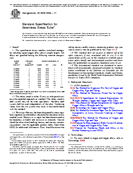 1.1 This specification covers seamless round and rectangular including square copper alloy tube in straight lengths. Ten alloys are specified having the following nominal compositions: