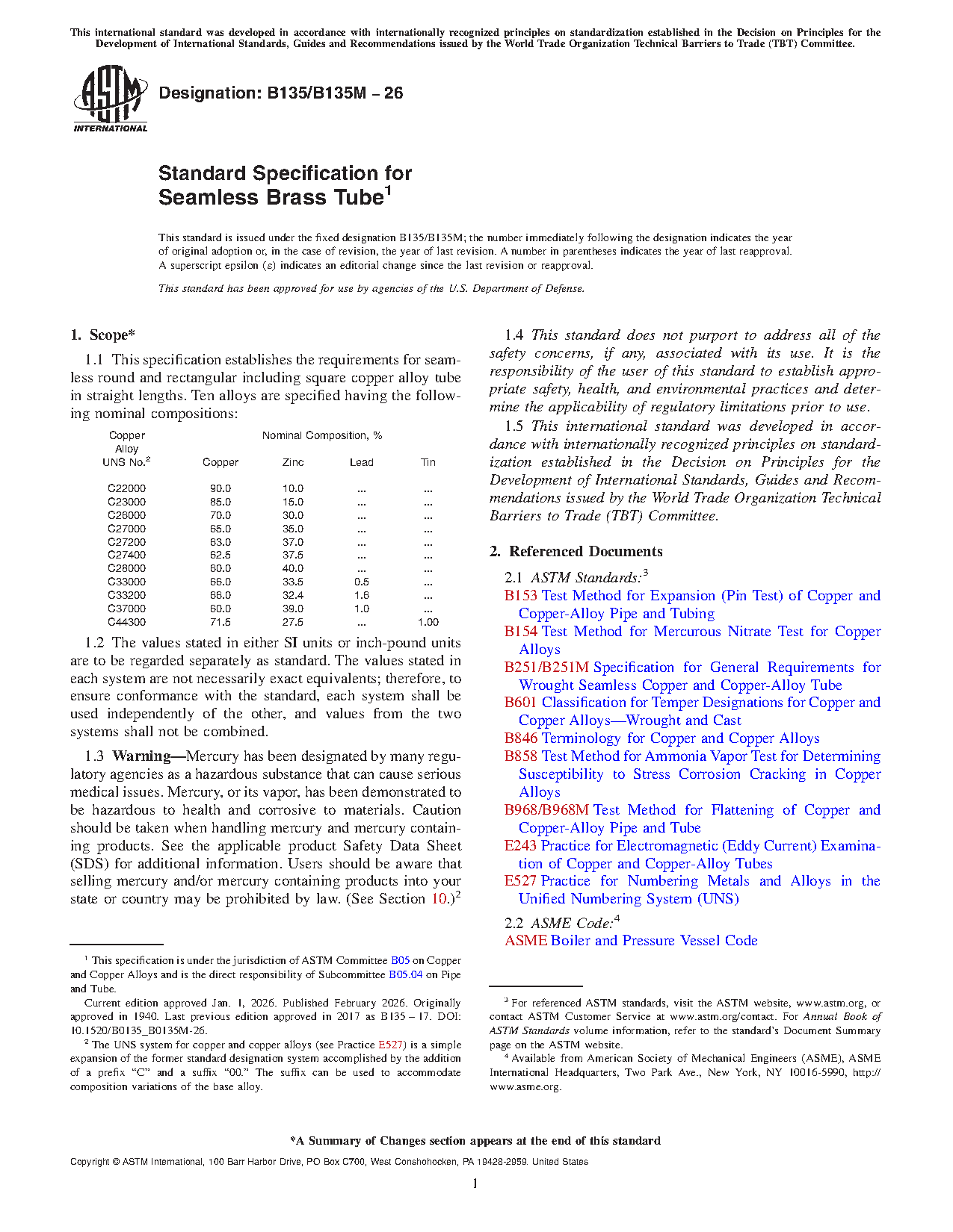 This specification covers seamless round and rectangular including square copper alloy tube in straight lengths. The following copper alloys are specified and classified according to their nominal compositions: UNS No. C22000, UNS No. C23000, UNS No. C26000, UNS No. C27000, UNS No. C27200, UNS No. C27400, UNS No. C28000, UNS No. C33000, UNS No. C33200, UNS No. C37000, and UNS No. C44300. The tempers of drawn tube shall be designated as light-drawn (H55), drawn (H58), and hard-drawn (H80). Light-drawn (bending) temper is used only when a tube of some stiffness but yet capable of being bent is needed. Drawn temper is for general purposes and is most commonly used where there is no specific requirement for high strength on the one hand or for bending qualities on the other. Hard-drawn temper is used only where there is need for a tube as strong as is commercially feasible for the sizes indicated. For any combination of diameter and wall thickness not covered under hard-drawn temper, the values given for drawn temper shall be used. The tempers of annealed tube shall be designated as light anneal (O50) and soft anneal (O60). The tubes shall undergo mechanical tests such as tension test, Rockwell hardness test, and expansion test in order to determine certain properties such as tensile strength and hardness. A mercury nitrate test shall be done to detect and remove mercury vapor. Nondestructive tests such as eddy-current test, hydrostatic test, and pneumatic test shall be done as well.