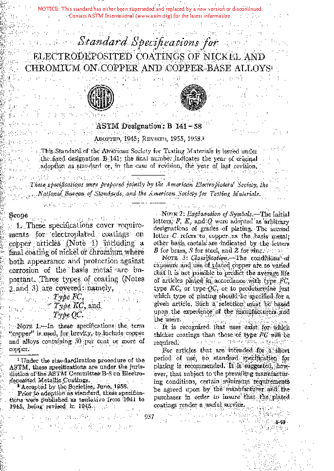 Specification for Electrodeposited Coatings of Nickel and Chromium on Copper and Copper-Base Alloys (Withdrawn 1966)