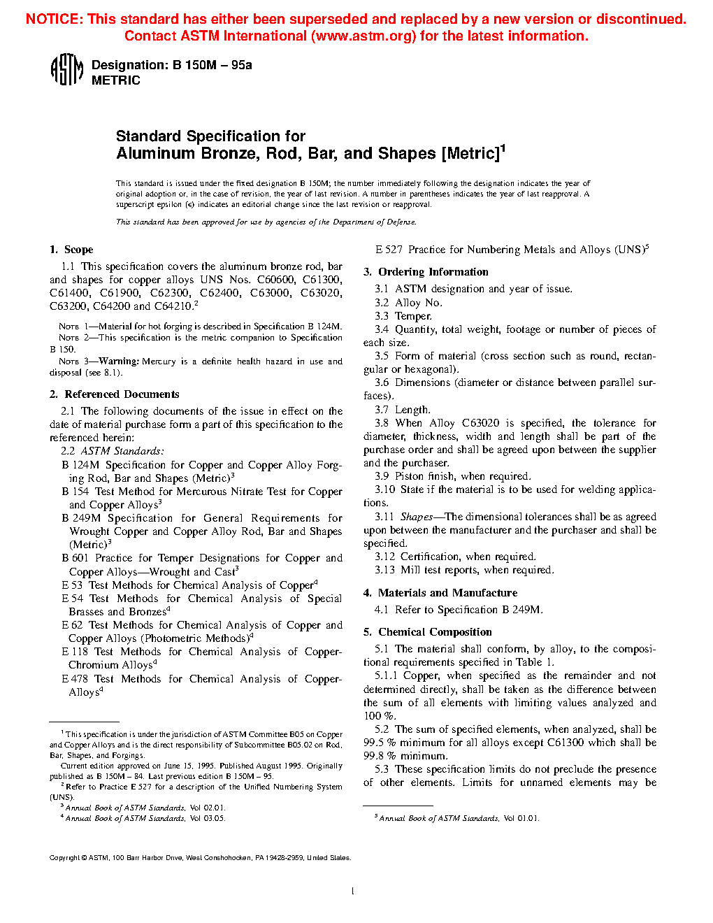 Note 1-Material for hot forging is described in Specification B124M. Note 2-This specification is the metric companion to Specification B150. Note 3: Warning-Mercury is a definite health hazard in use and disposal (see 9.1).Technical characteristics