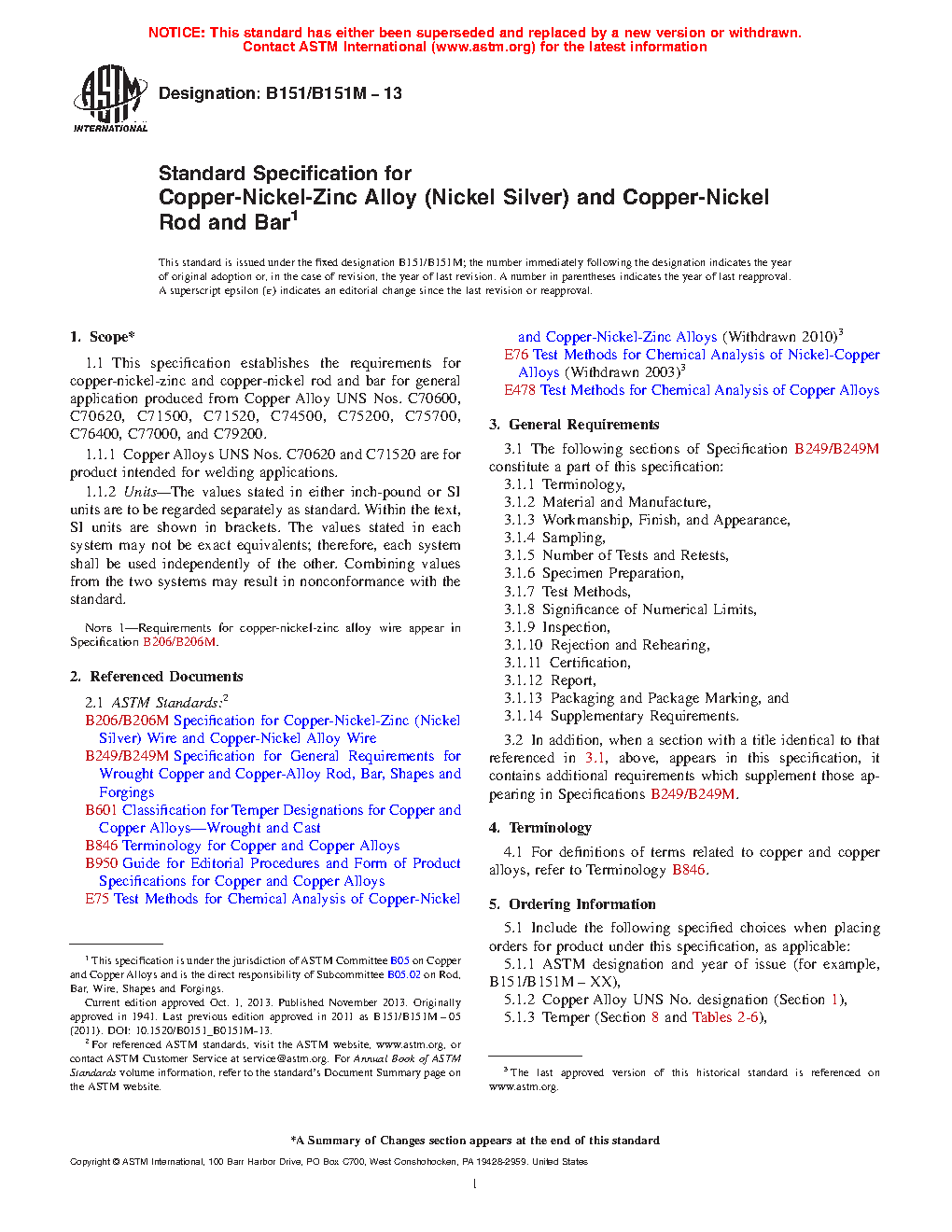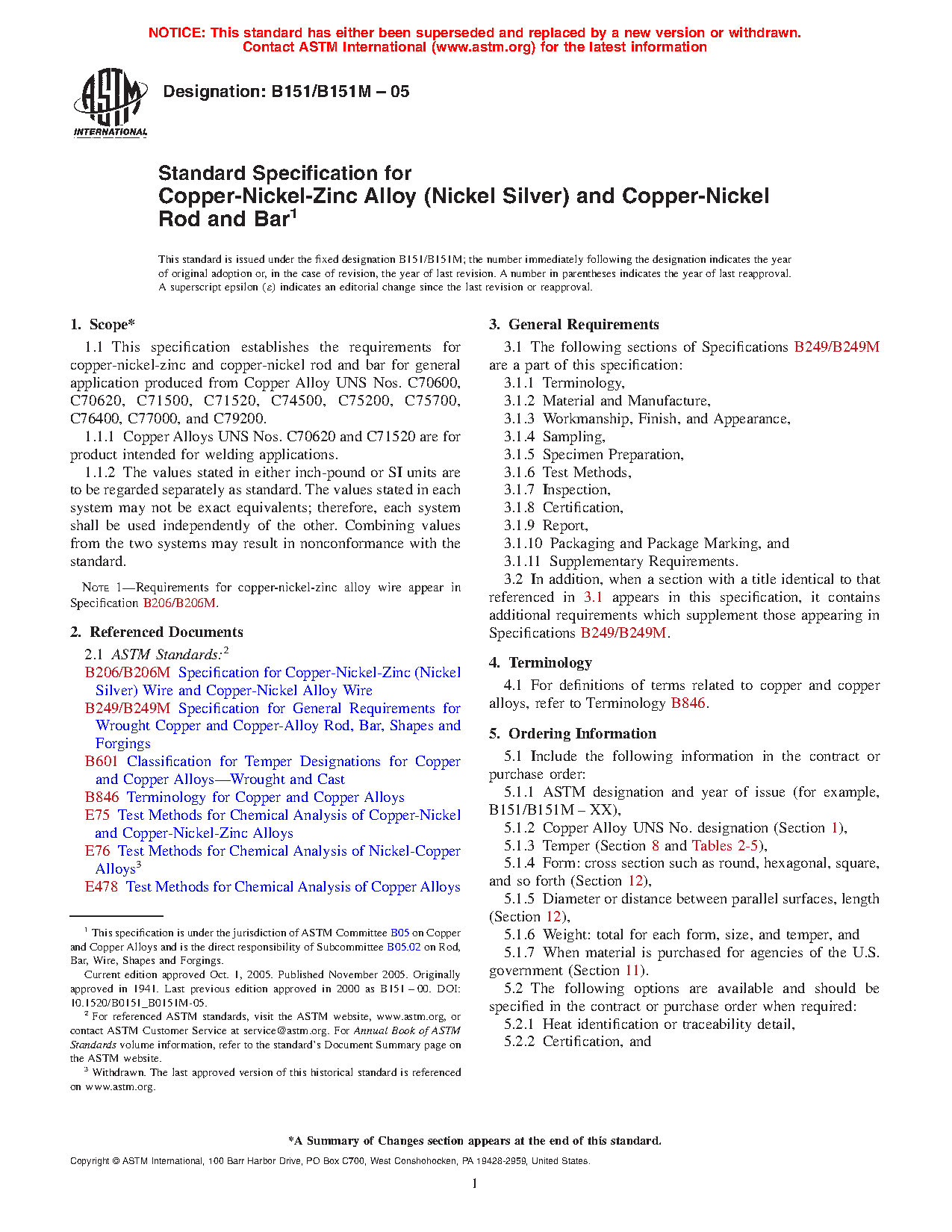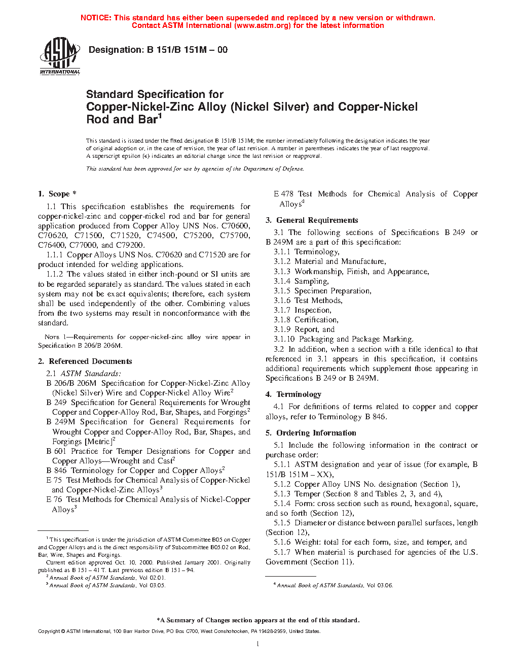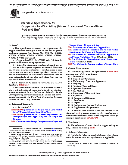 This specification establishes the requirements for copper-nickel-zinc and copper-nickel rod and bar for general application produced from Copper Alloy UNS Nos. C70600, C70620, C71500, C71520, C74500, C75200, C75700, C76400, C77000, and C79200. The chemical composition, temper, annealed temper grain size, and tensile strength requirements are detailed.