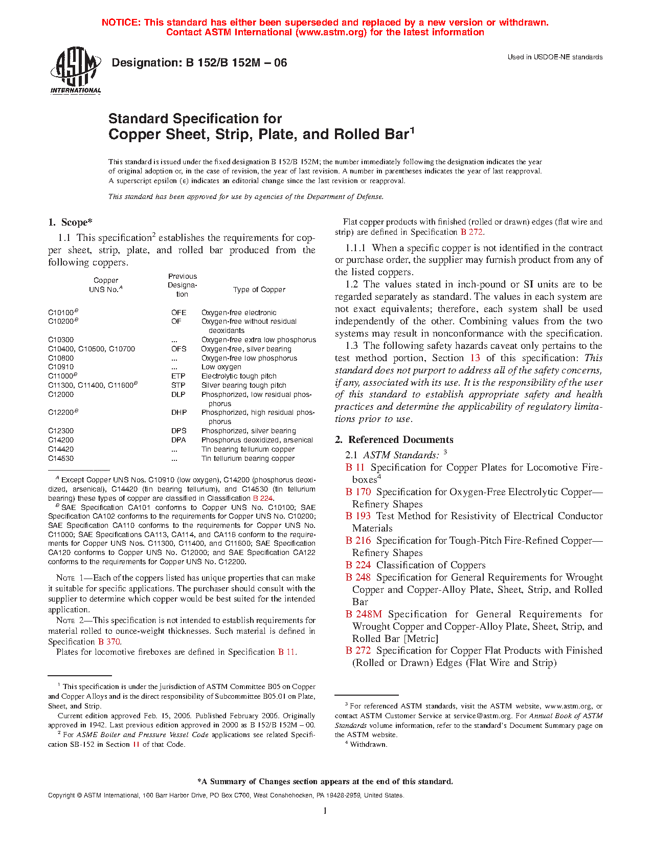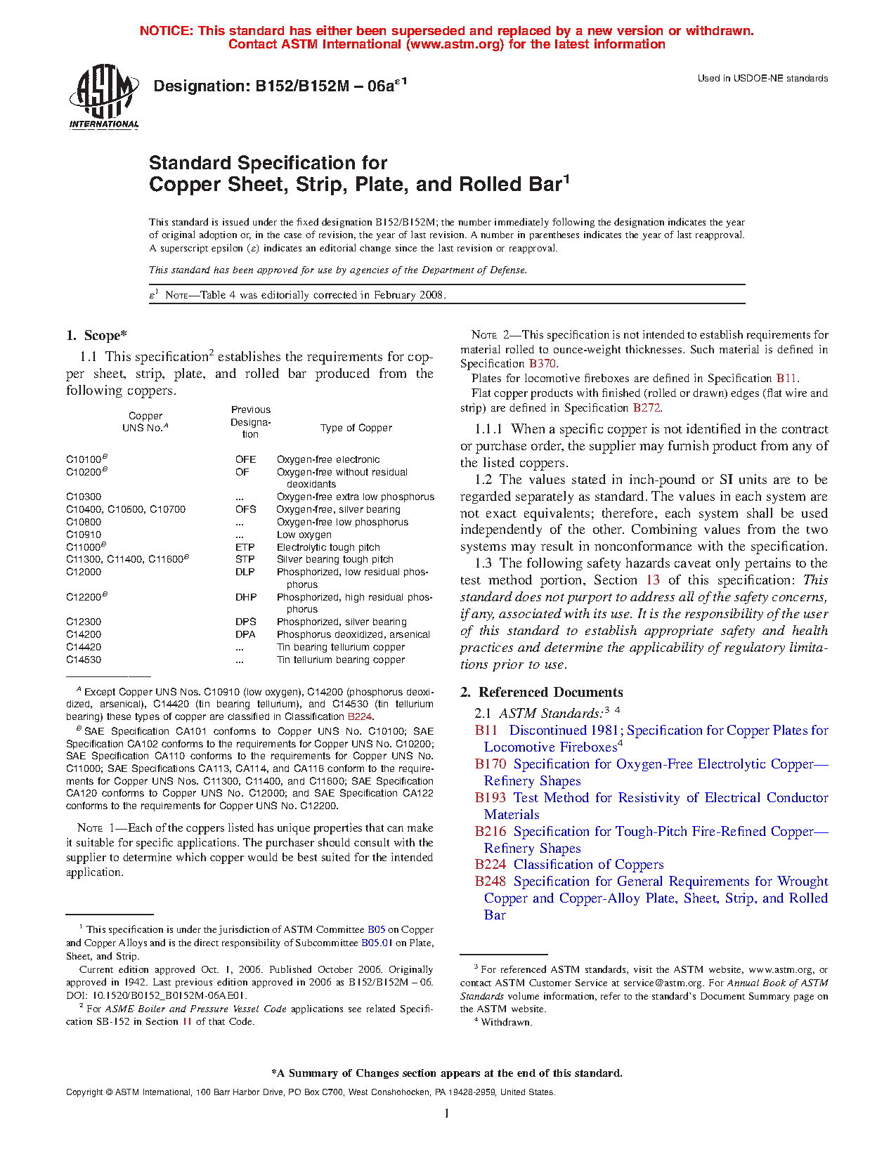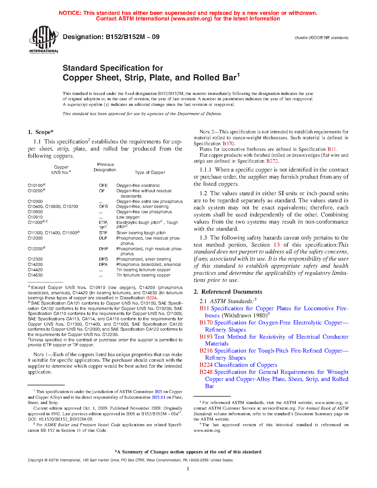 1.1 This specification2 establishes the requirements for copper sheet, strip, plate, and rolled bar produced from the following coppers.