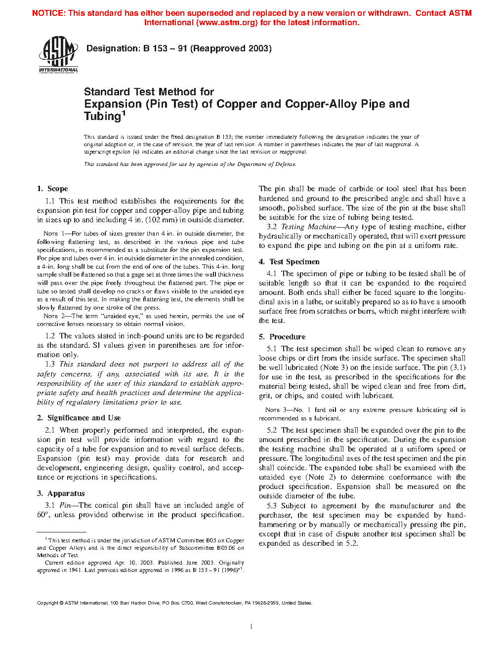 1.1 This test method establishes the requirements for the expansion pin test for copper and copper-alloy pipe and tubing with an inside diameter of 0.125 in. (3.2 mm) and greater or an outside diameter up to and including 4 in. (102 mm).