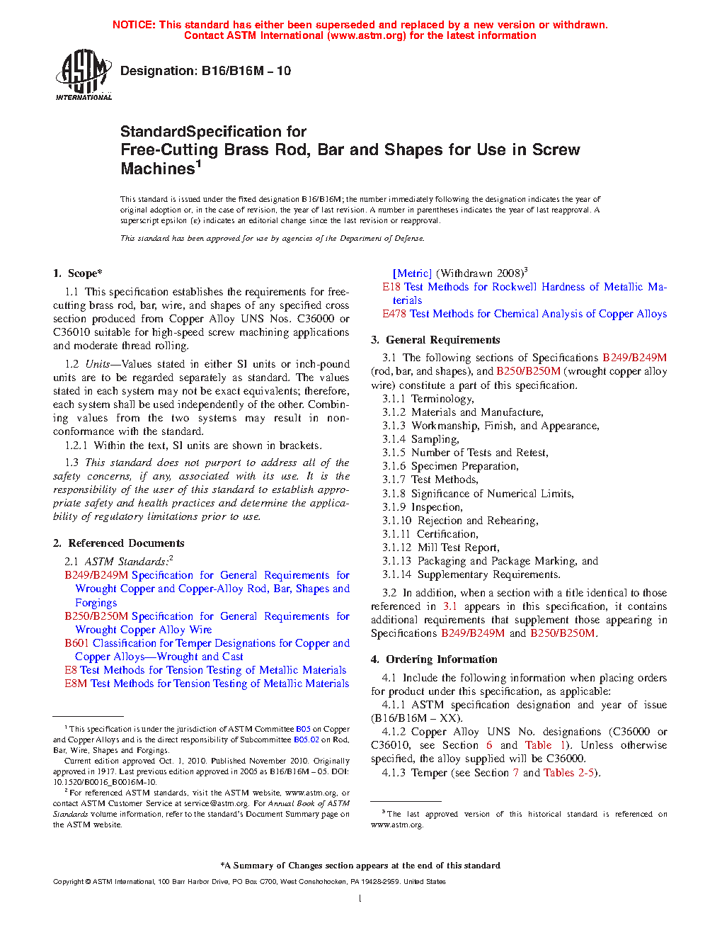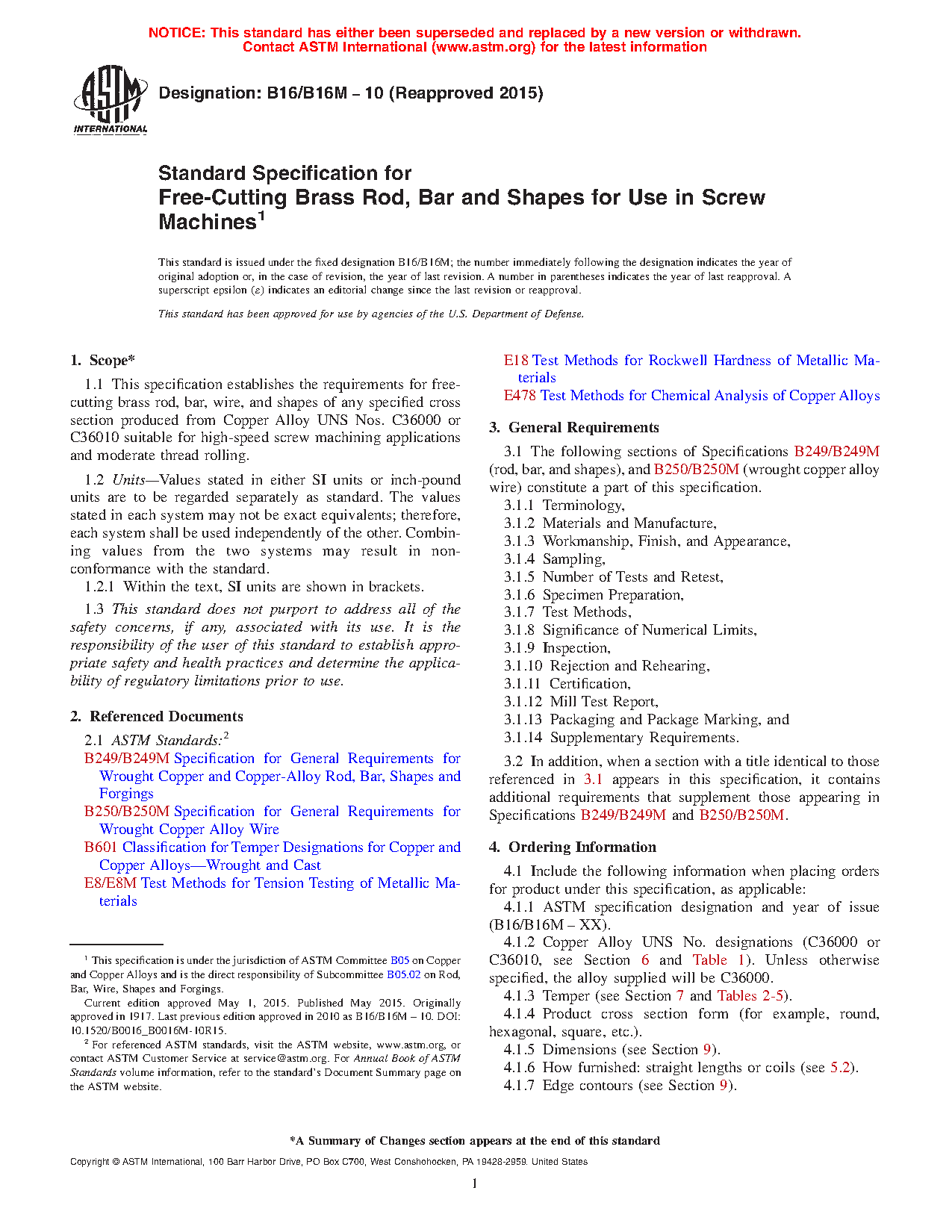 1.1 This specification establishes the requirements for free-cutting brass rod, bar, wire, and shapes of any specified cross section produced from Copper Alloy UNS Nos. C36000 or C36010 suitable for high-speed screw machining applications and moderate thread rolling.