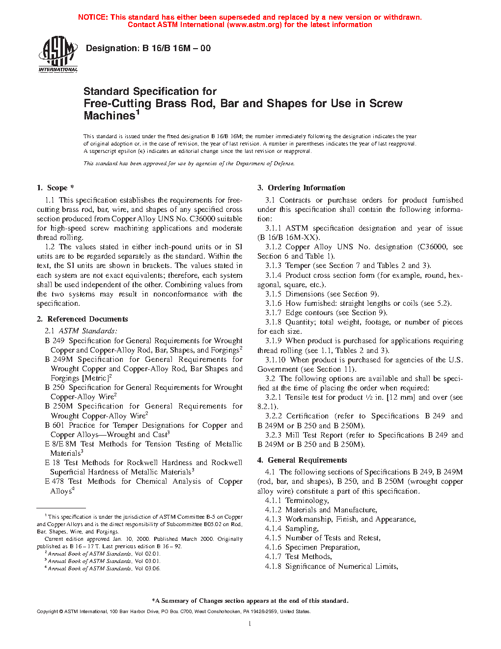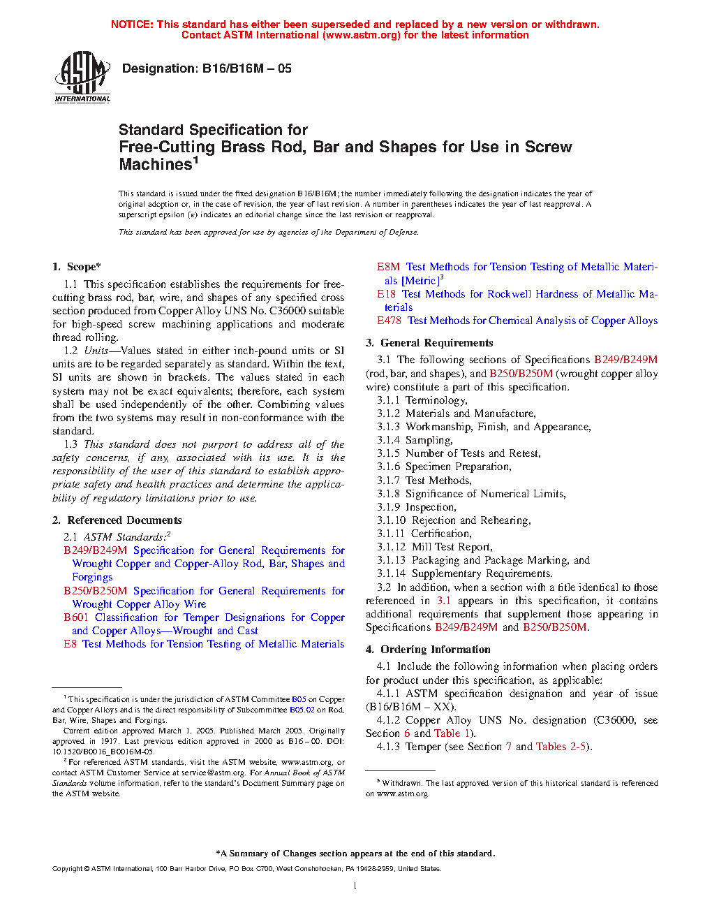 This specification establishes the requirements for free-cutting brass rod, bar, wire, and shapes of any specified cross-section produced from Copper Alloy UNS No. C36000 suitable for high-speed screw machining applications and moderate thread rolling. The chemical composition, temper, tensile, Rockwell hardness, and shape requirements are detailed.