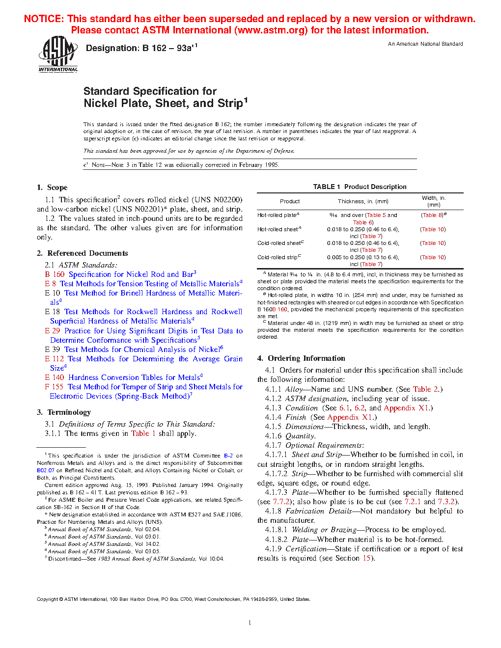Standard Specification for Nickel Plate, Sheet, and Strip