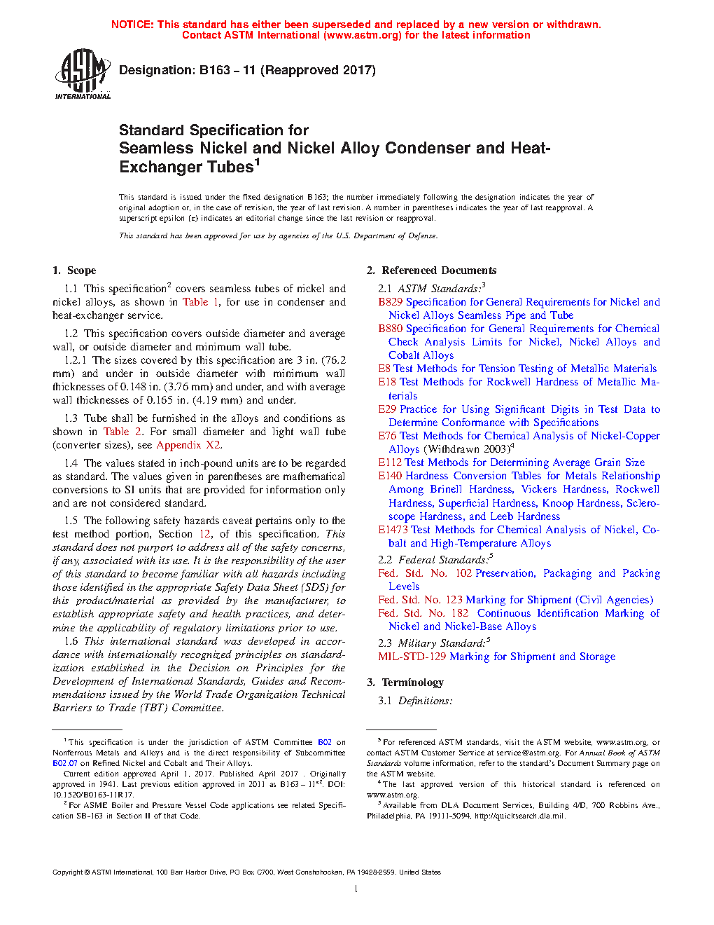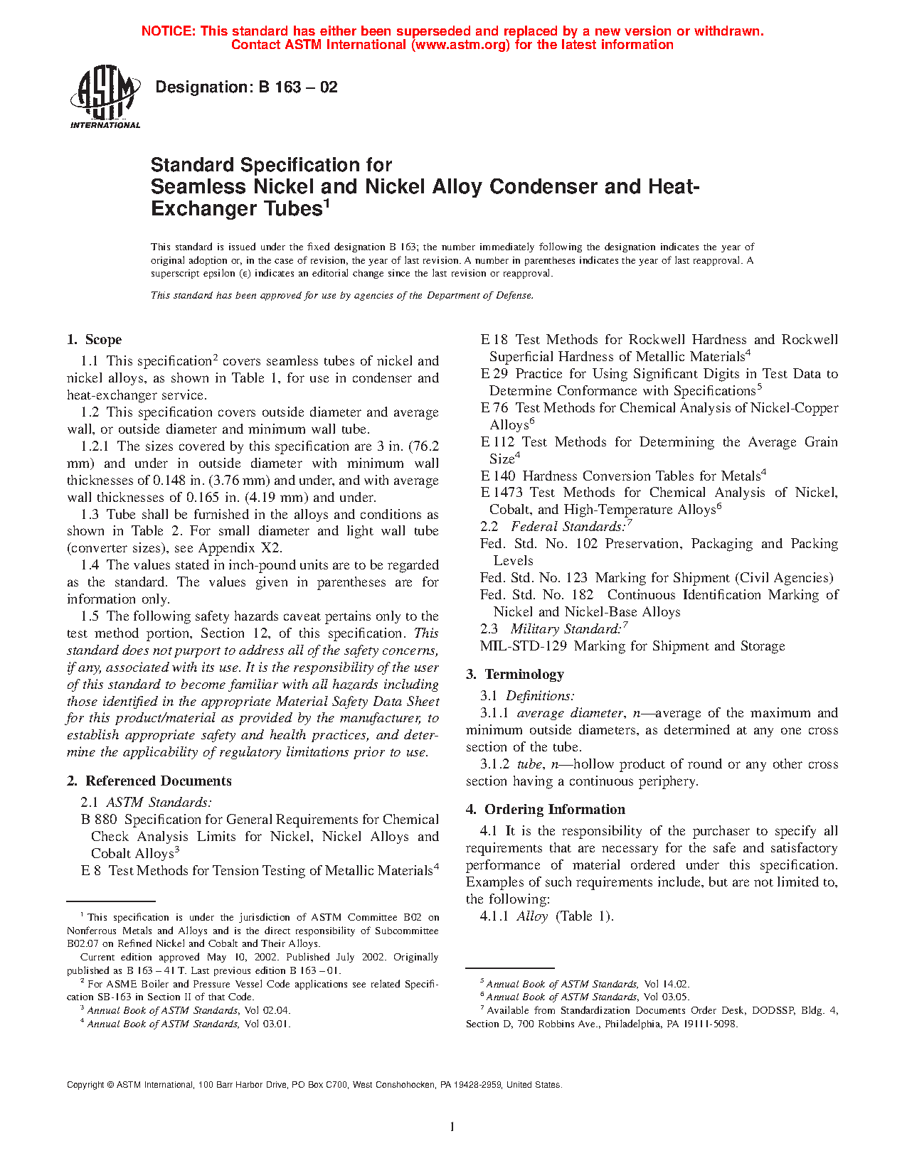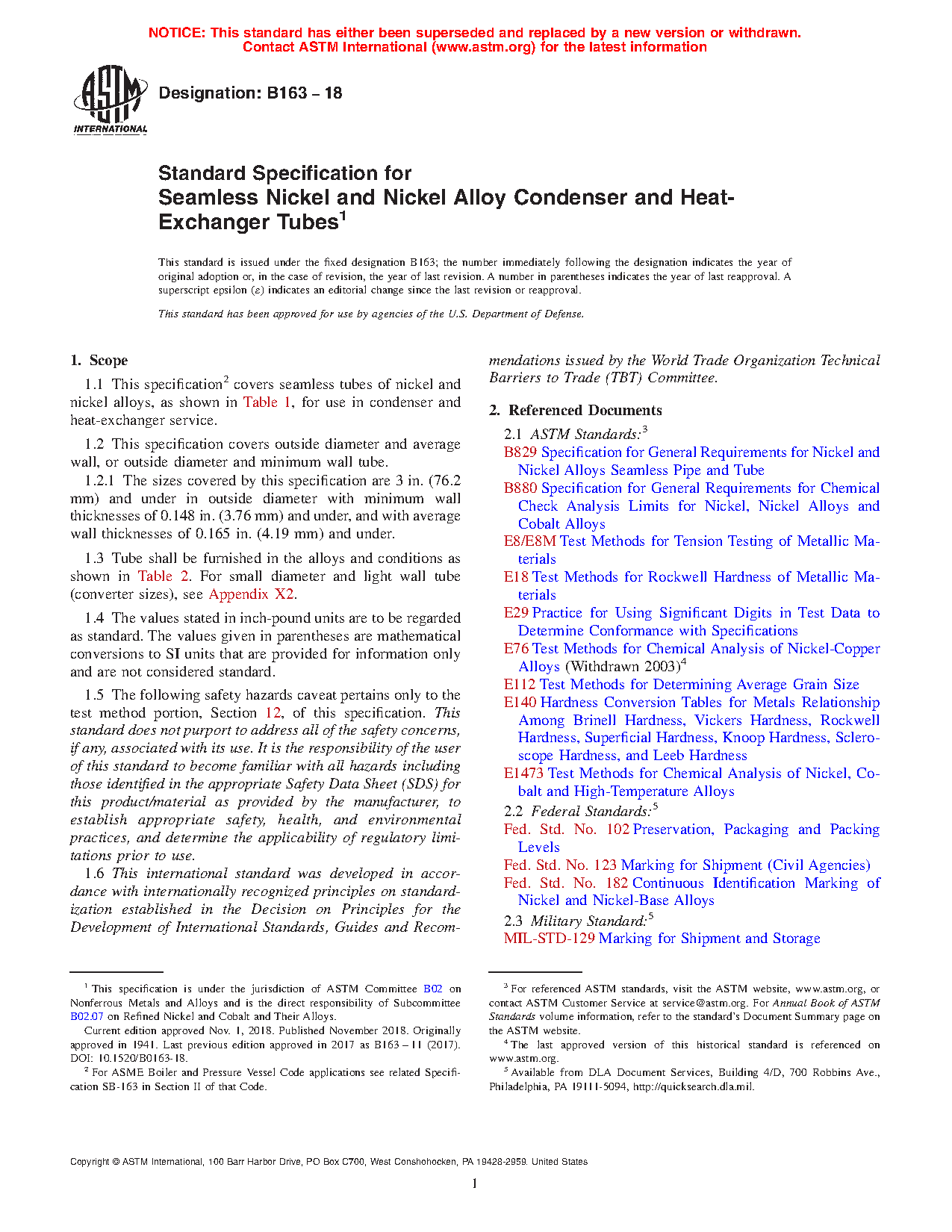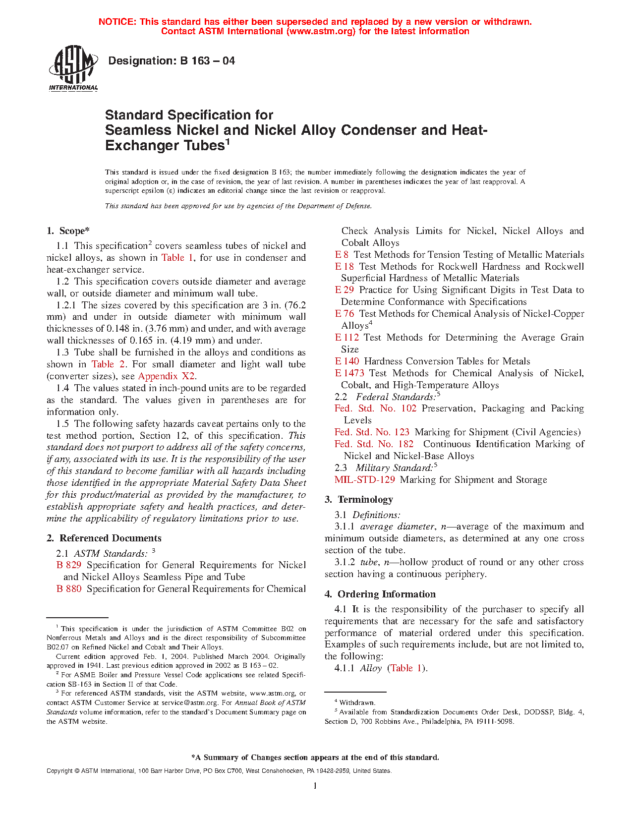 1.1 This specification2 covers seamless tubes of nickel and nickel alloys, as shown in Table 1, for use in condenser and heat-exchanger service.