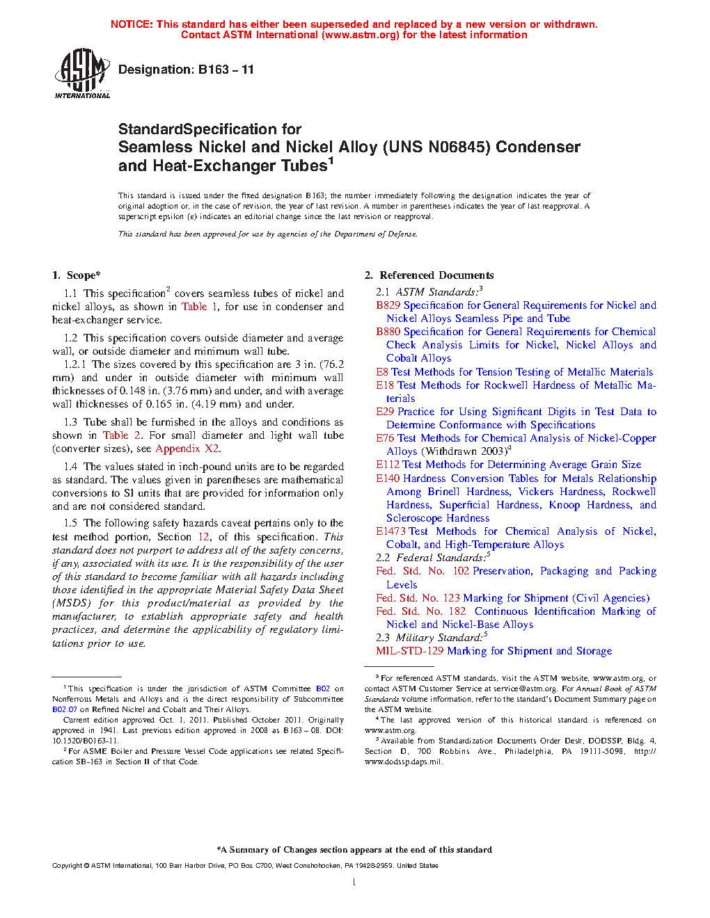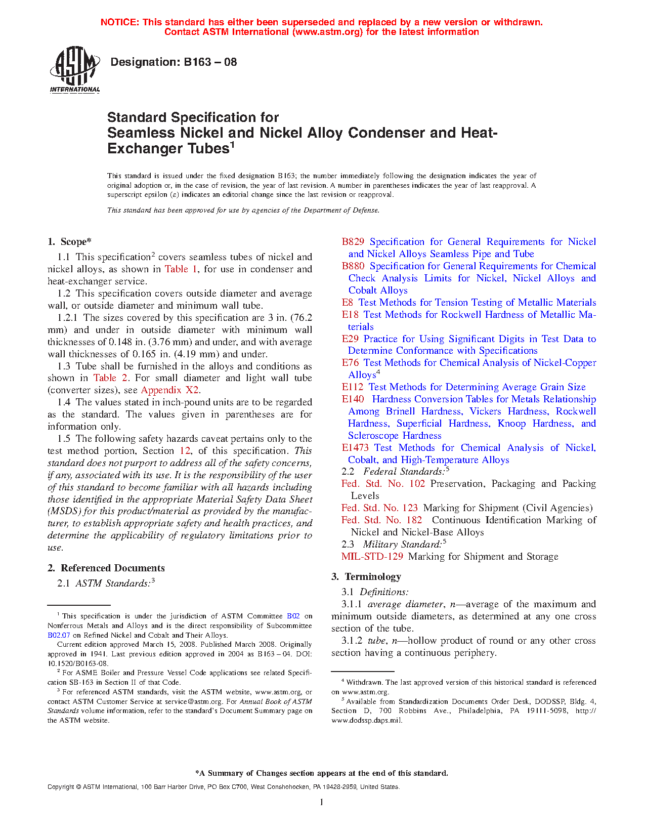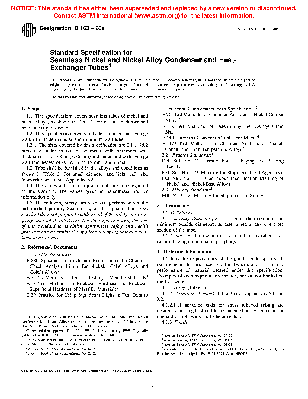 1.1 This specification2 covers seamless tubes of nickel and nickel alloys, as shown in Table 1, for use in condenser and heat-exchanger service.