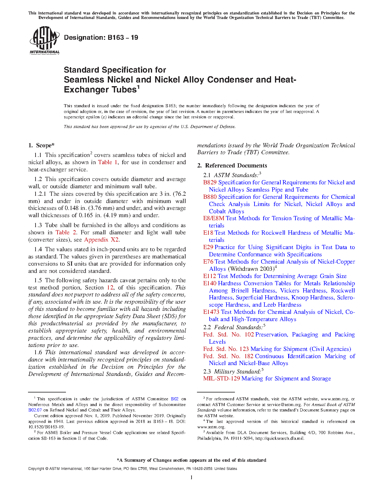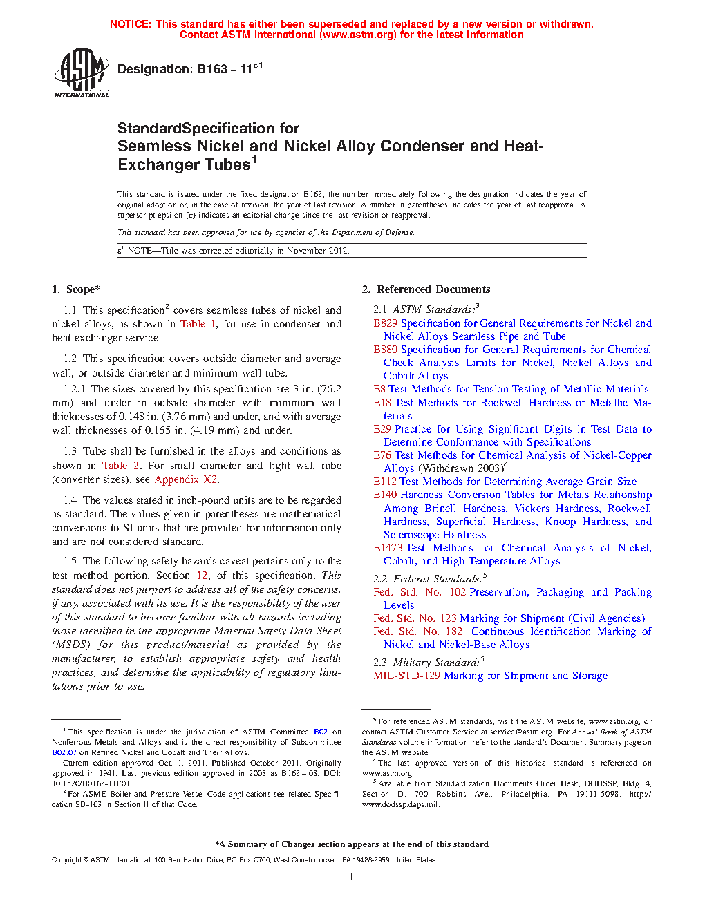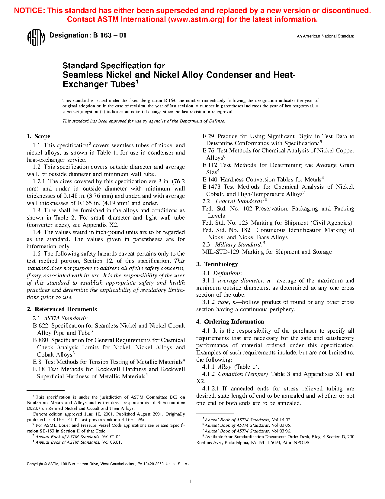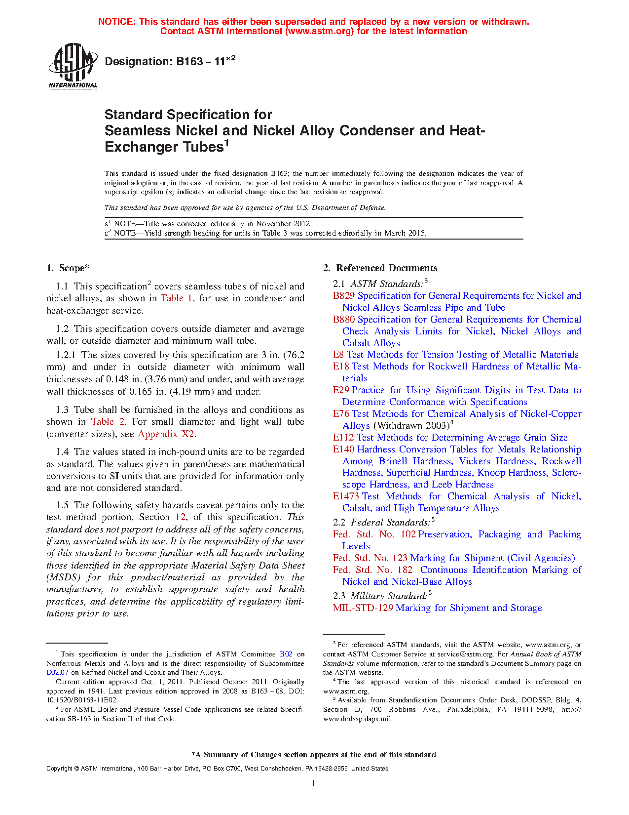 1.1 This specification2 covers seamless tubes of nickel and nickel alloys, as shown in Table 1, for use in condenser and heat-exchanger service.