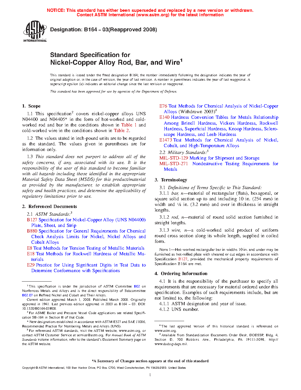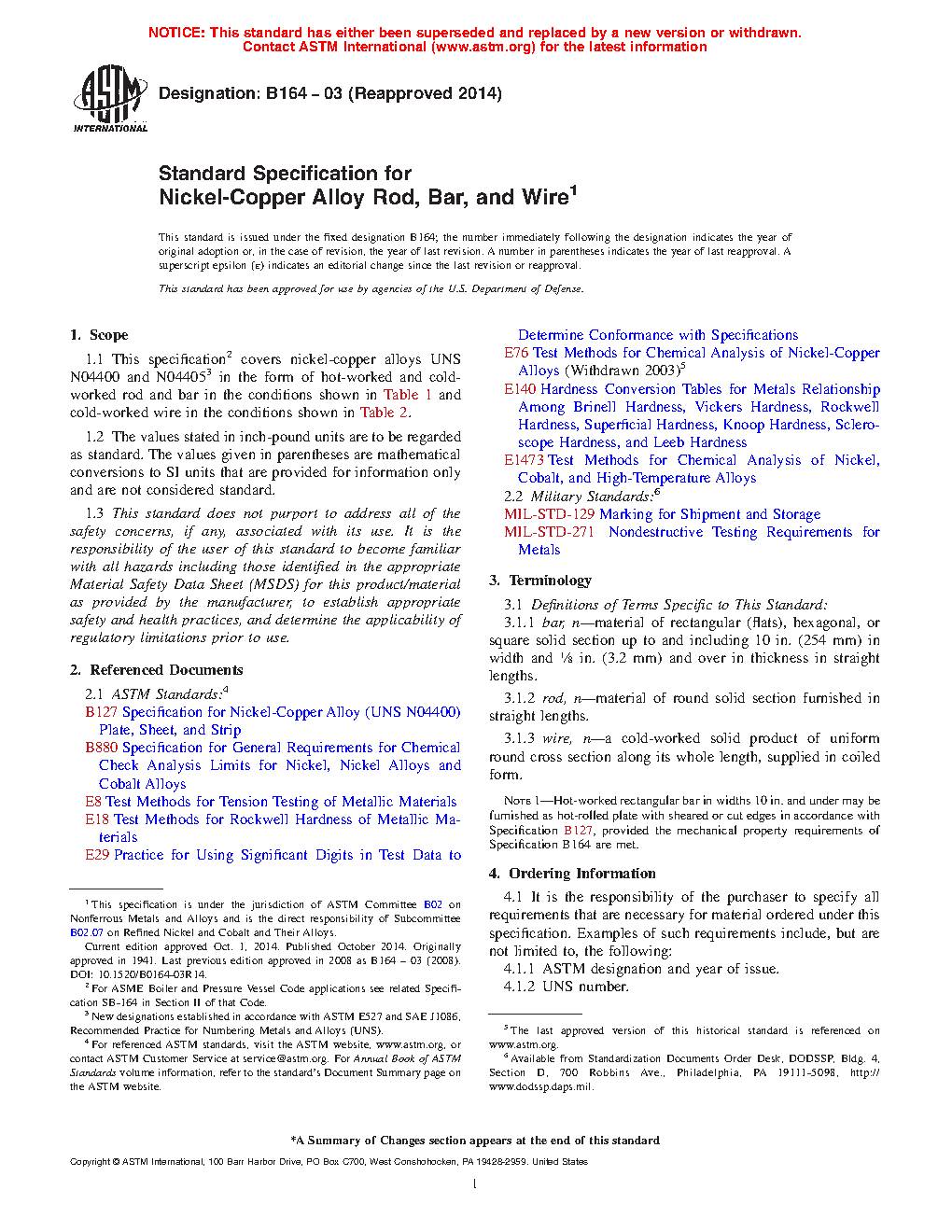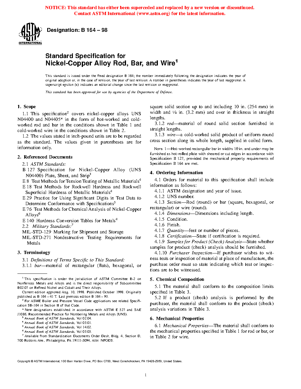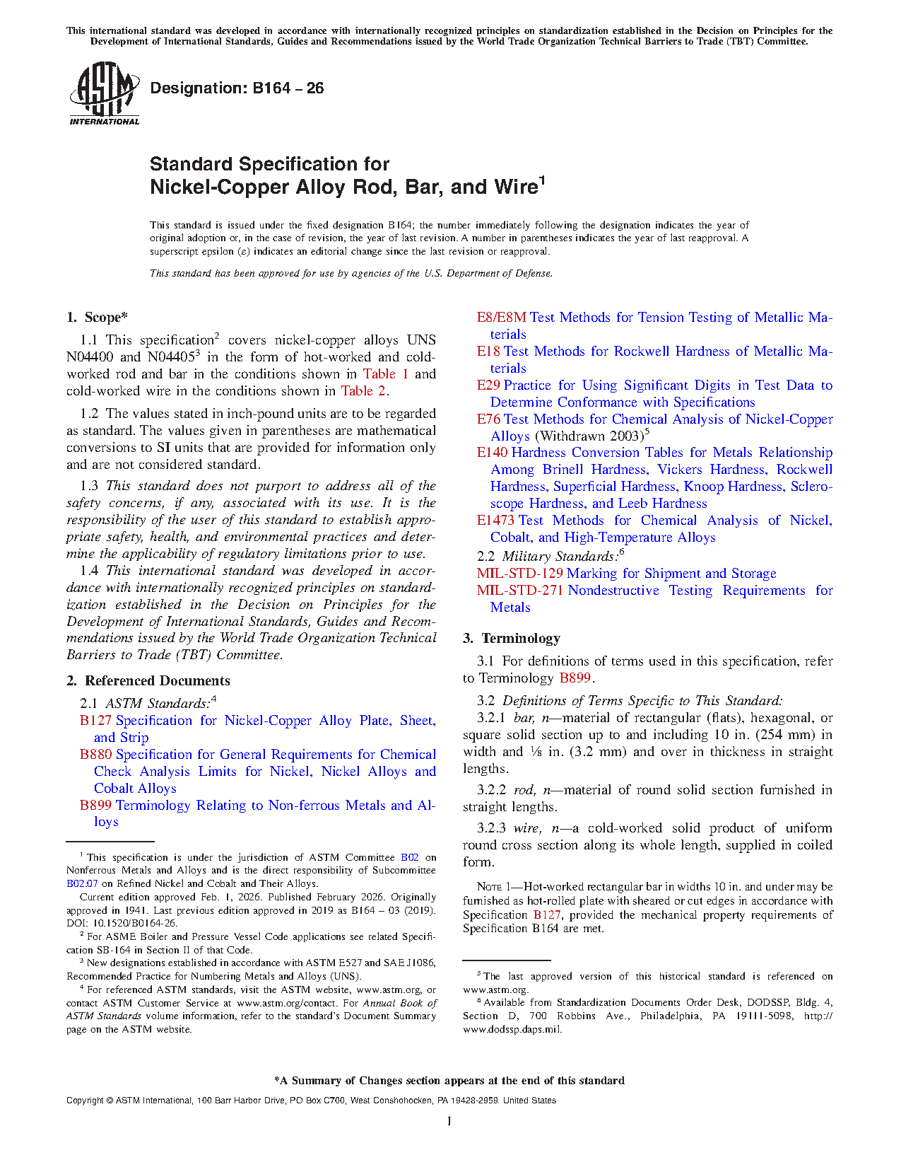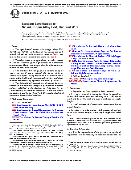 1.1 This specification covers nickel-copper alloys UNS N04400 and N04405* in the form of hot-worked and cold-worked rod and bar in the conditions shown in Table 2 and cold-worked wire in the conditions shown in Table 3.