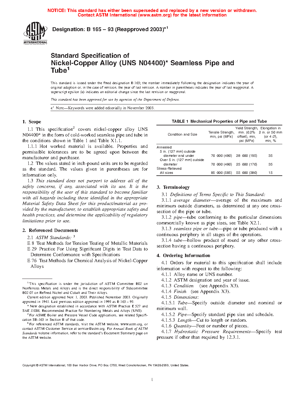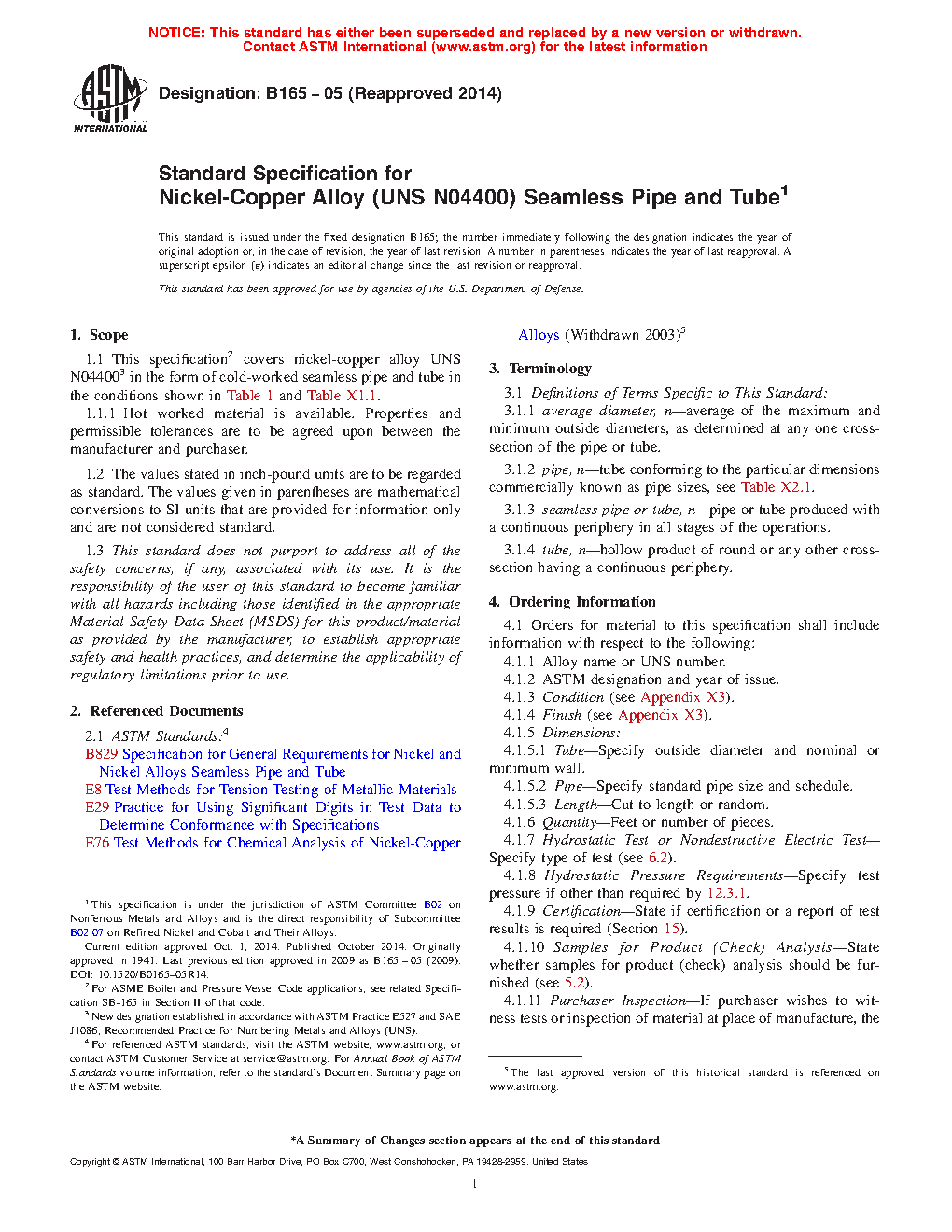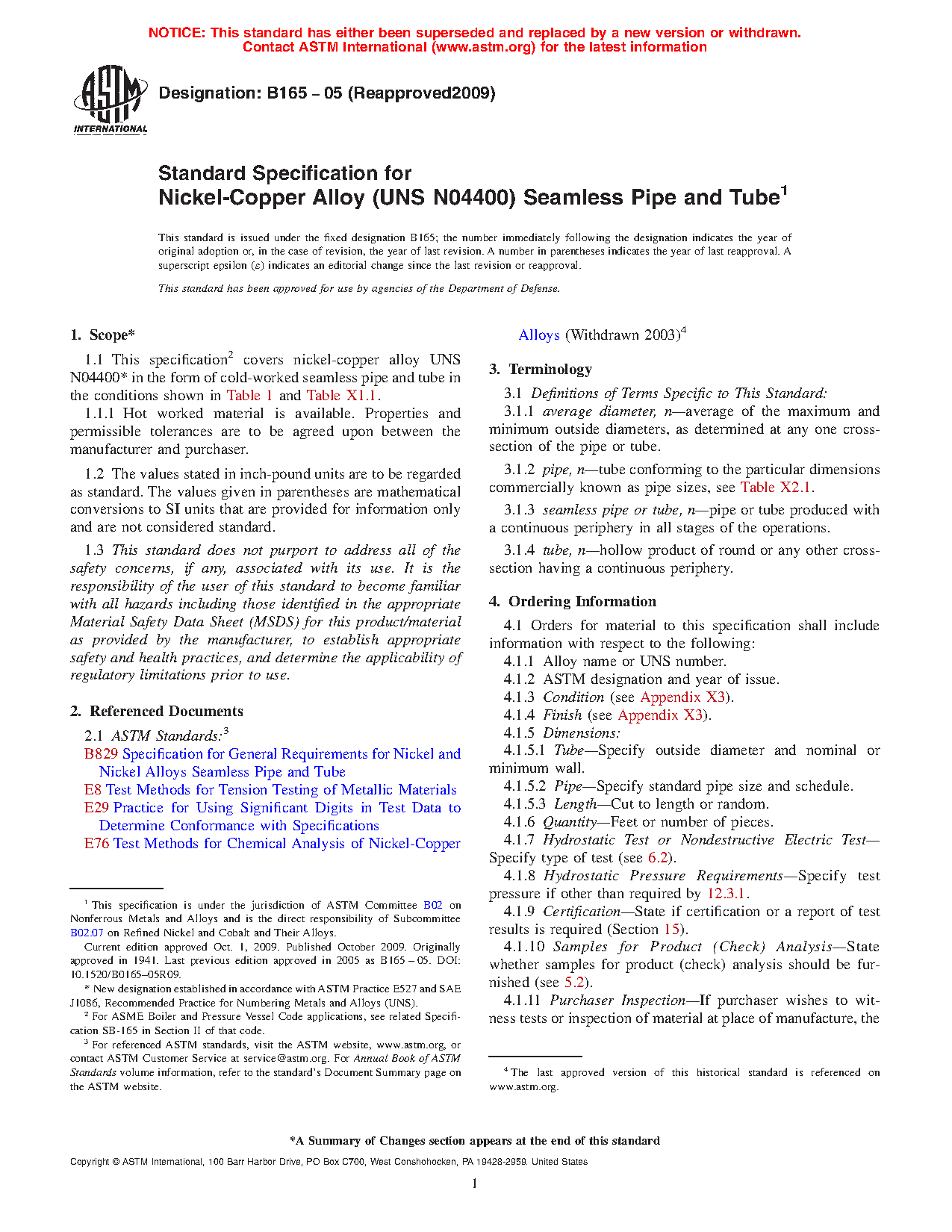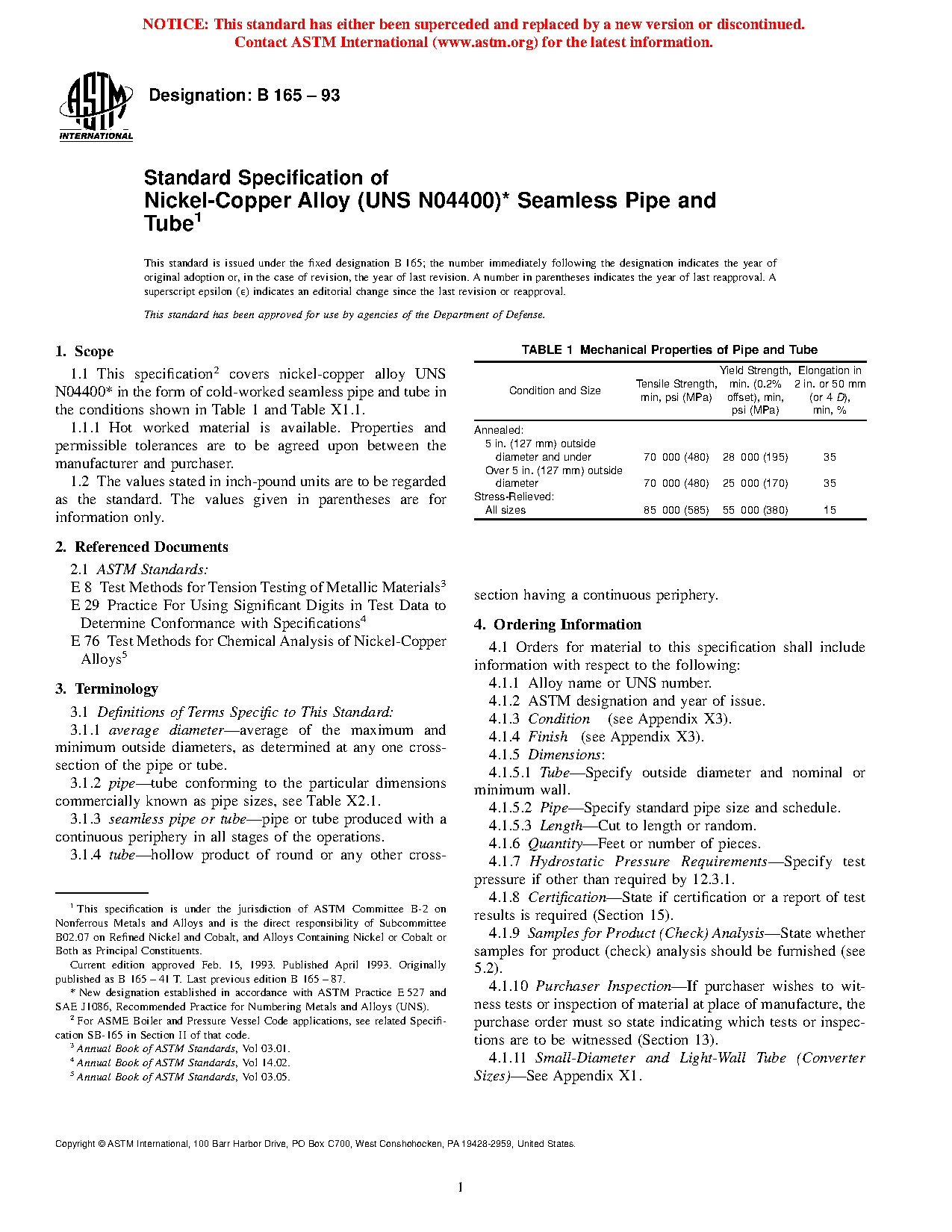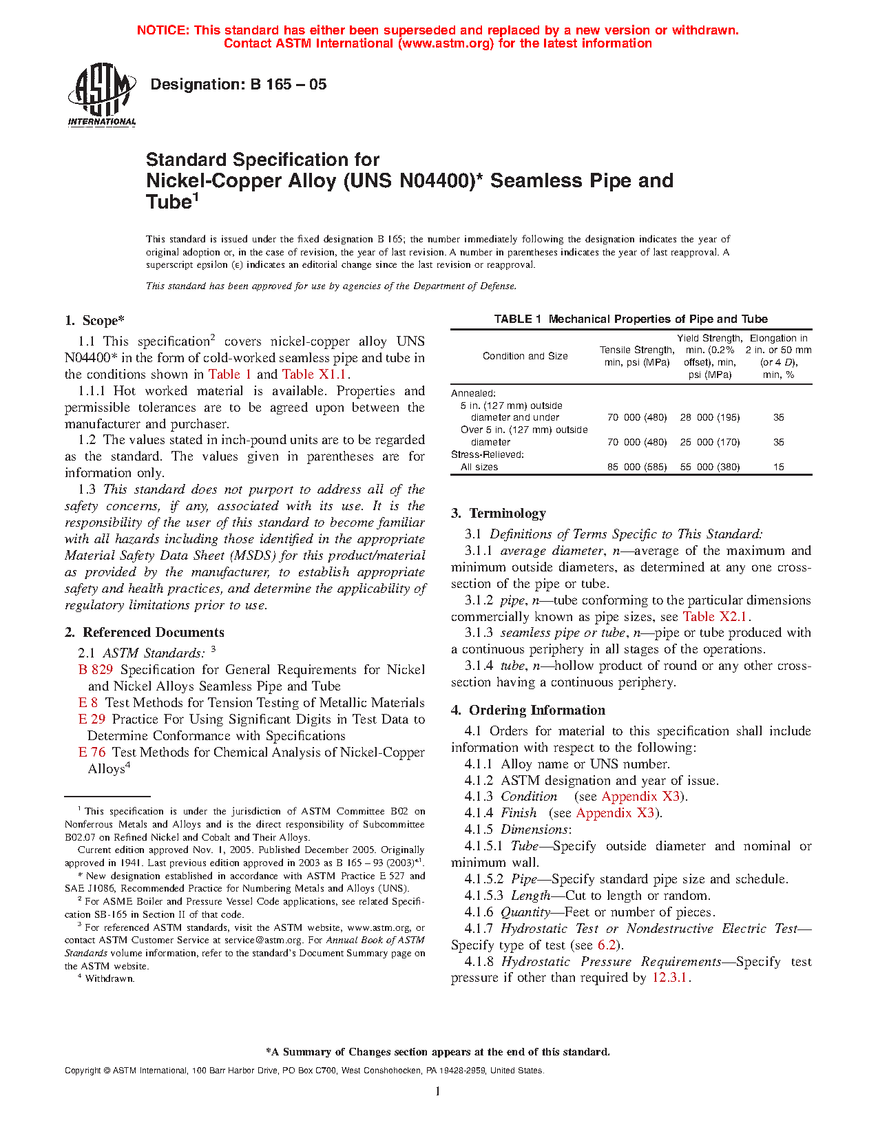 1.1 This specification2 covers nickel-copper alloy UNS N044003 in the form of cold-worked seamless pipe and tube in the conditions shown in Table 1 and Table X1.1.