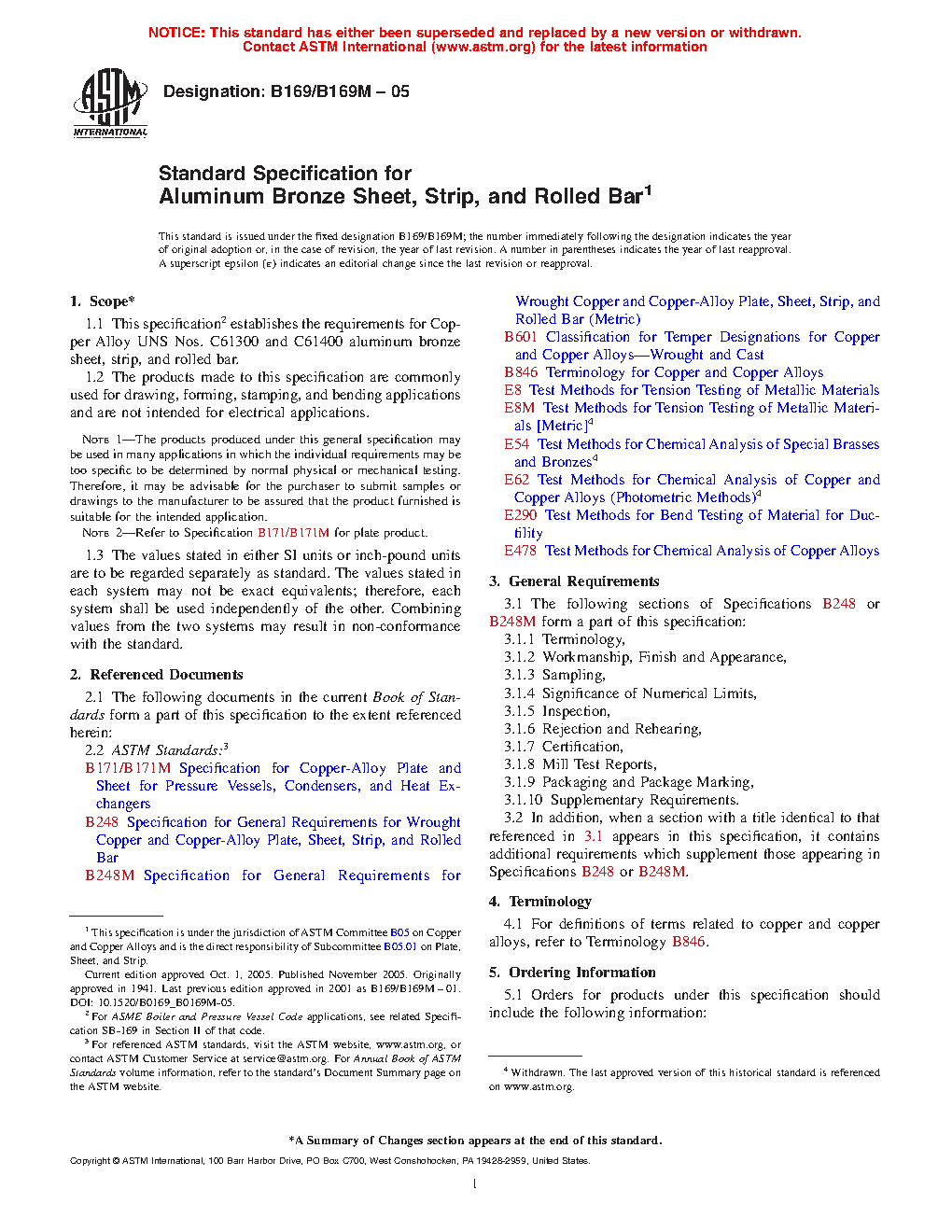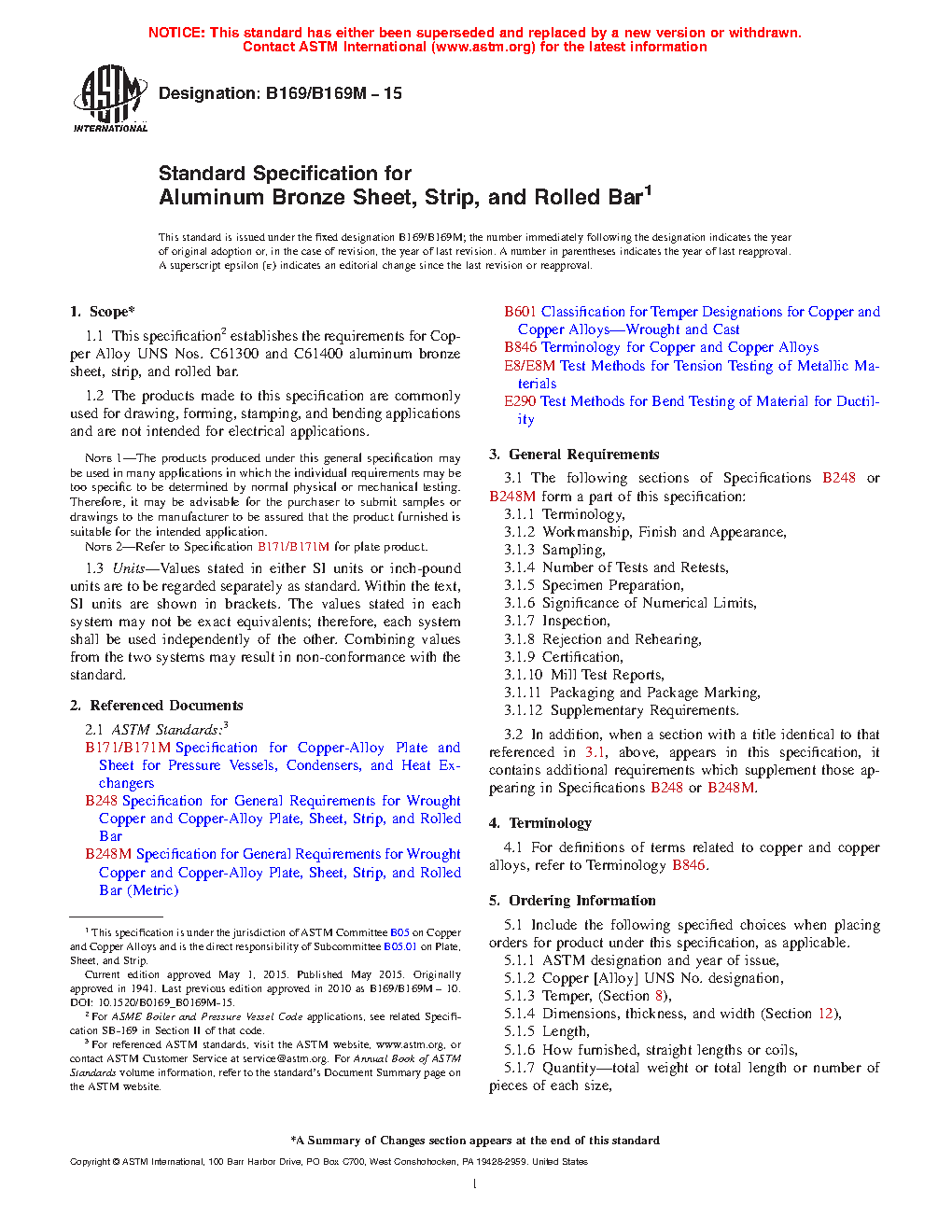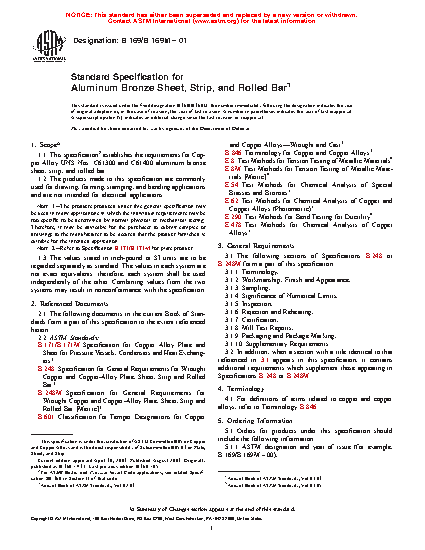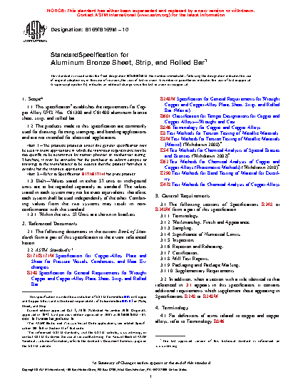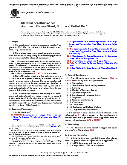 1.1 This specification2 establishes the requirements for Copper Alloy UNS Nos. C61300 and C61400 aluminum bronze sheet, strip, and rolled bar.