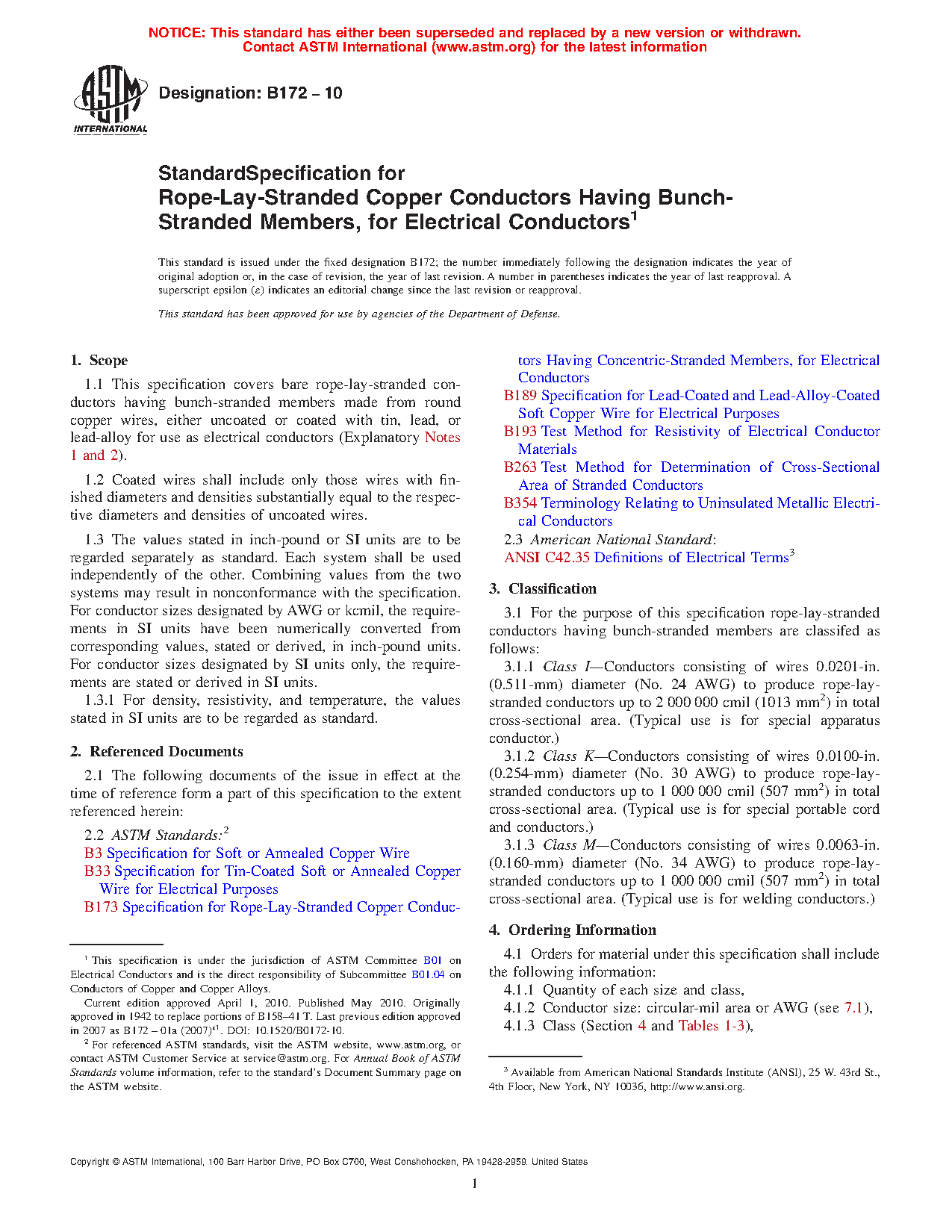 1.1 This specification covers bare rope-lay-stranded conductors having bunch-stranded members made from round copper wires, either uncoated or coated with tin, lead, or lead-alloy for use as electrical conductors (Explanatory Notes 1 and 2).