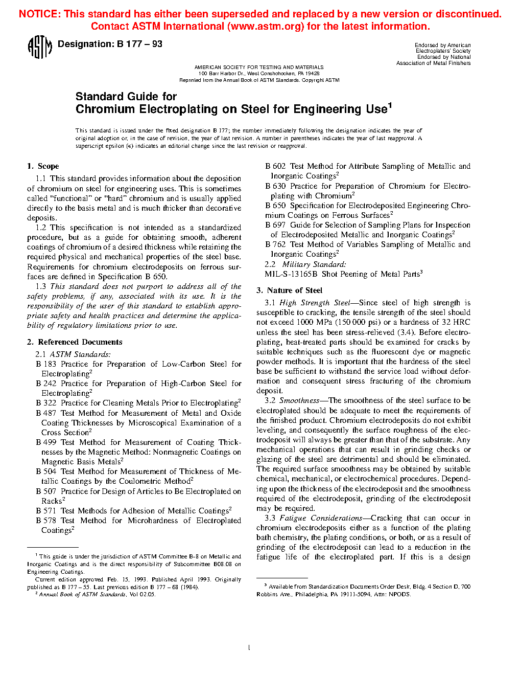 1.2 This guide is not intended as a standardized procedure, but as a guide for obtaining smooth, adherent coatings of chromium of a desired thickness while retaining the required physical and mechanical properties of the base metals. Specified chromium electrodeposits on ferrous surfaces are defined in Specification B 650.