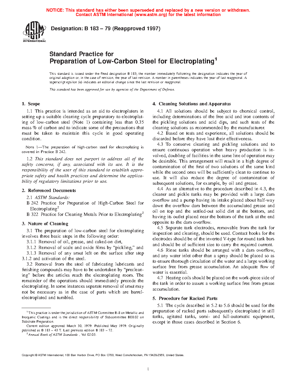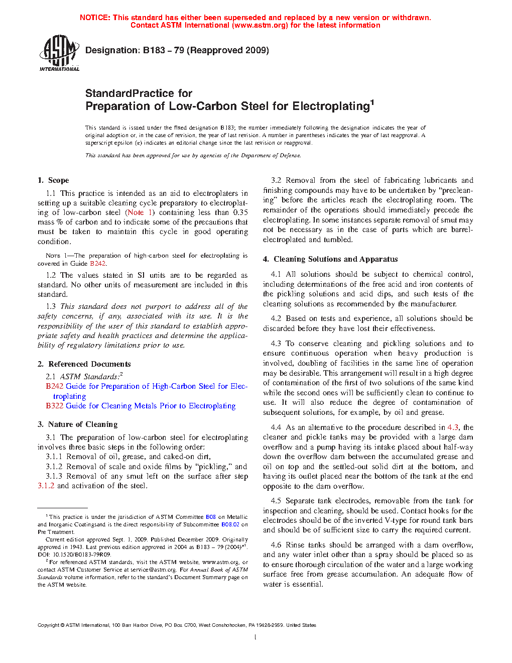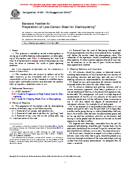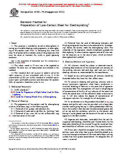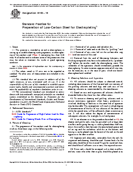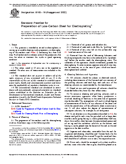 1.1 This practice is intended as an aid to electroplaters in setting up a suitable cleaning cycle preparatory to electroplating of low-carbon steel (Note 1) containing less than 0.35 mass % of carbon and to indicate some of the precautions that must be taken to maintain this cycle in good operating condition.