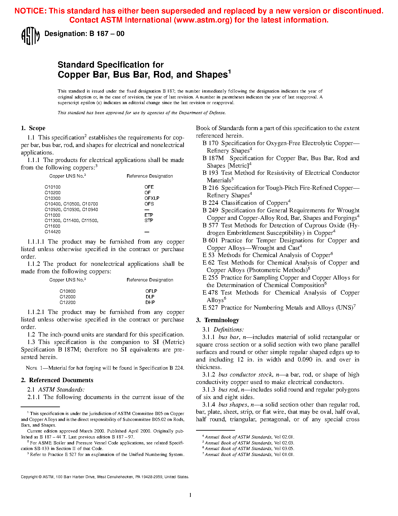 1.3 This specification is the companion to SI (Metric) Specification B 187M; therefore no SI equivalents are presented herein.