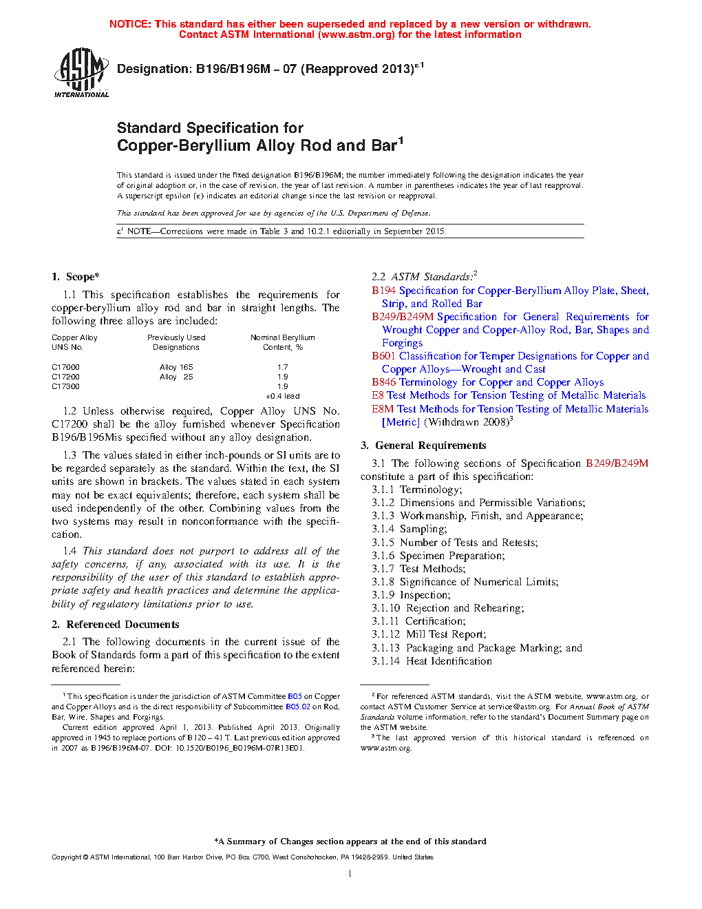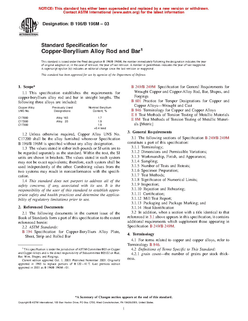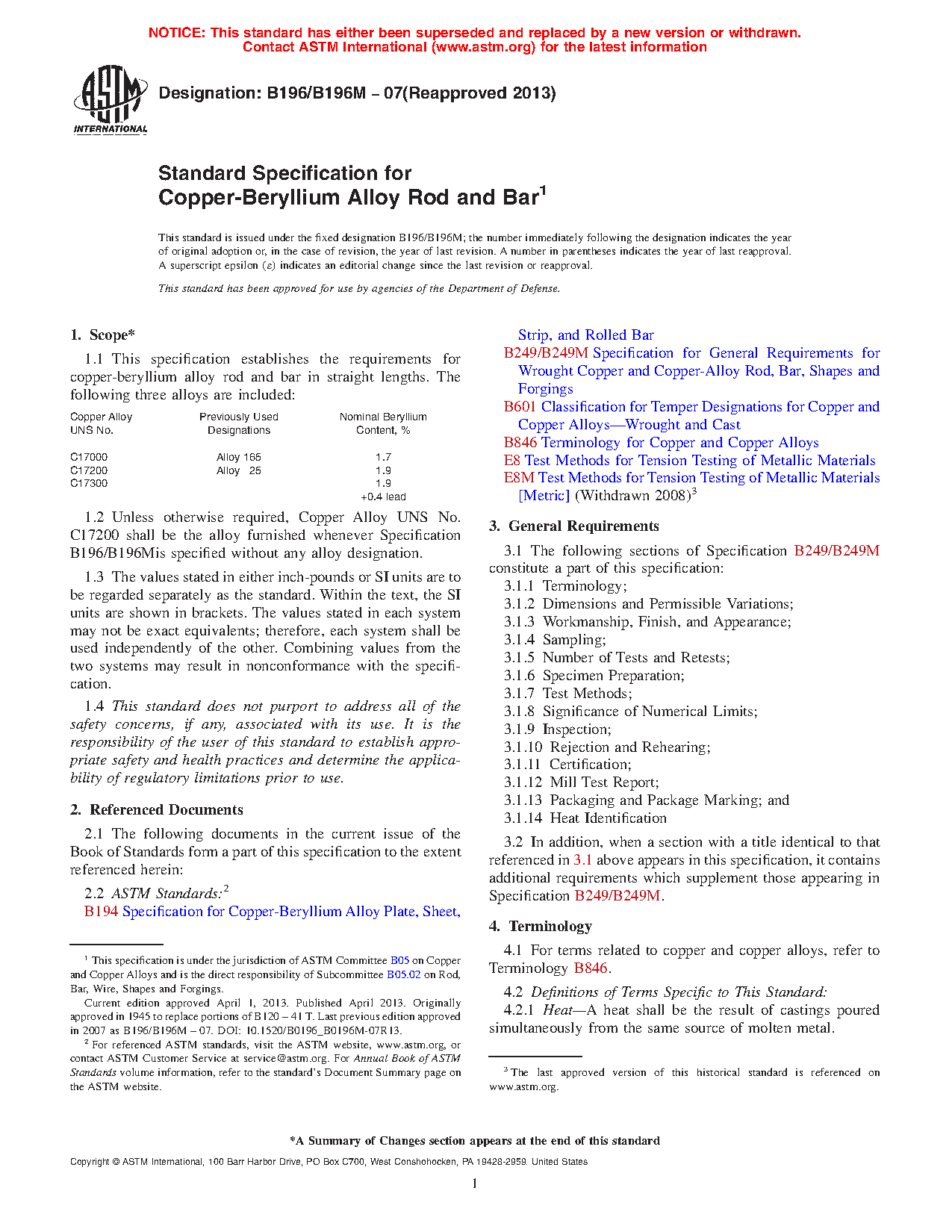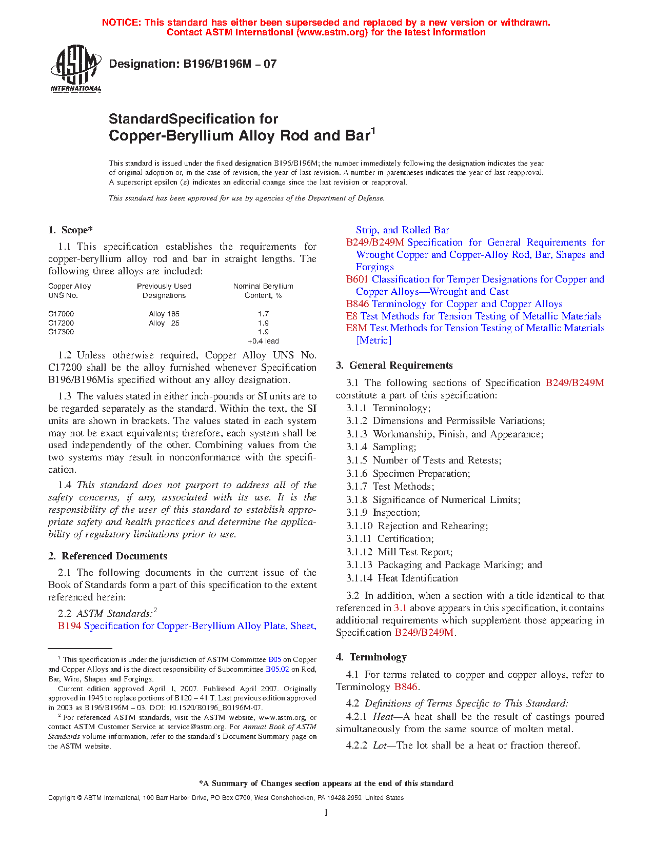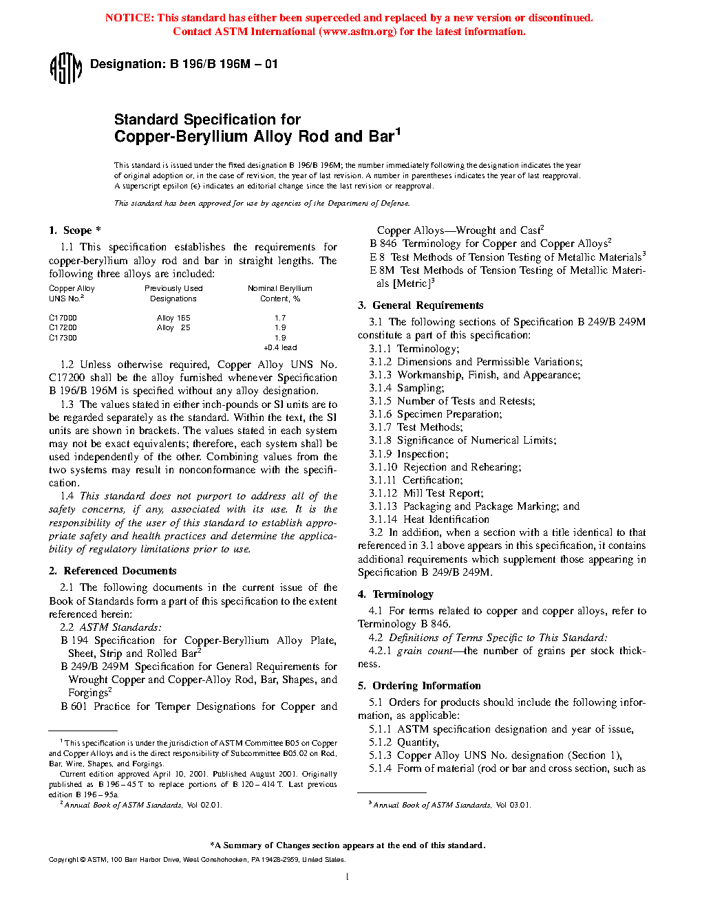 1.2 Unless otherwise required, Copper Alloy UNS No. C17200 shall be the alloy furnished whenever Specification B196/B196M is specified without any alloy designation.