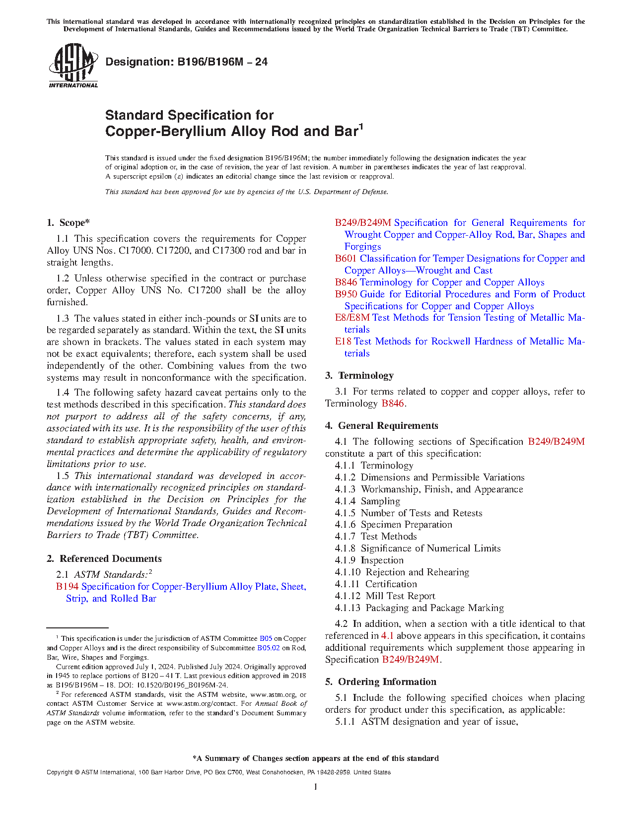 1.1 This specification establishes the requirements for copper-beryllium alloy rod and bar in straight lengths. The following three alloys are included: