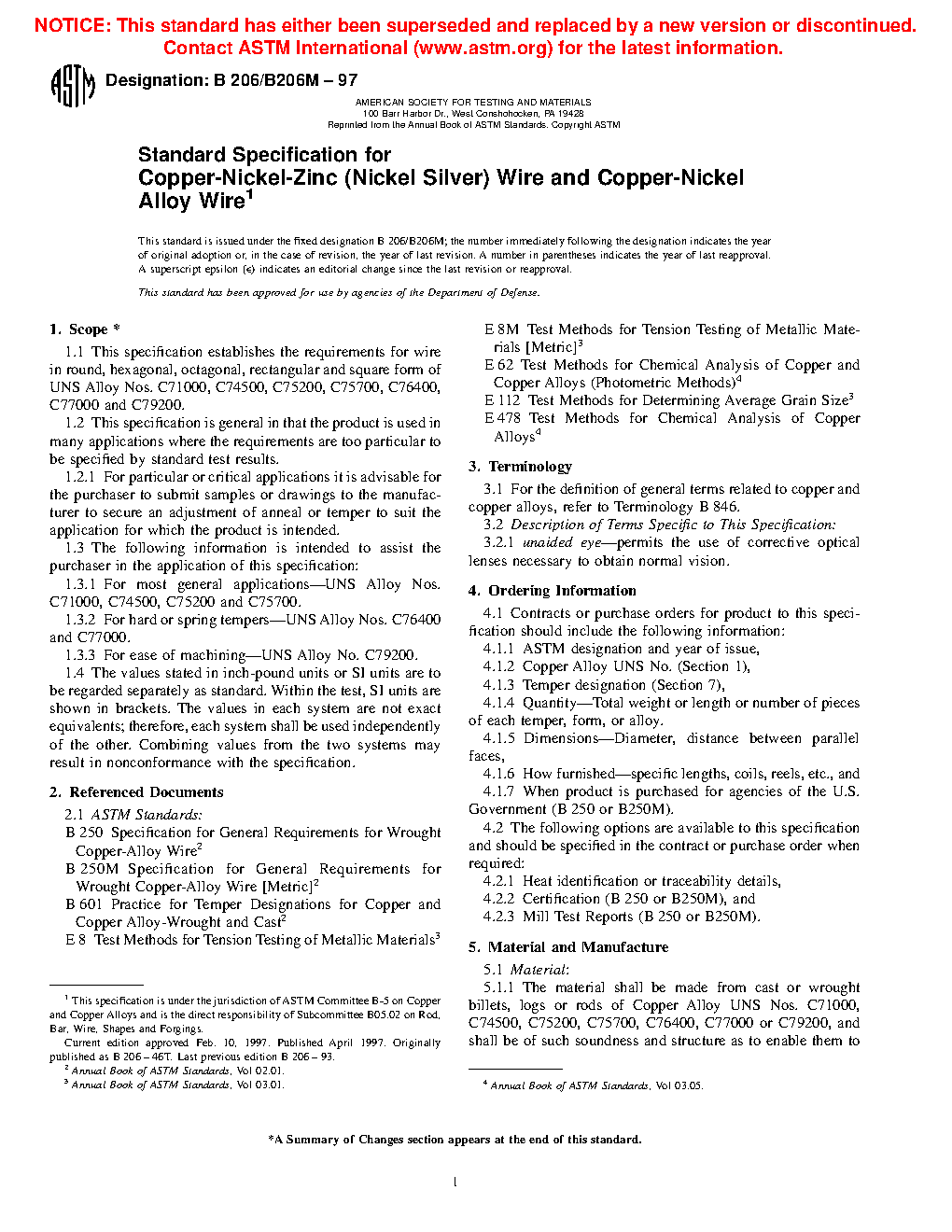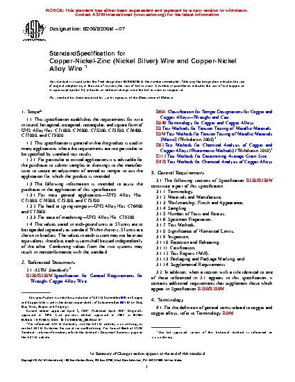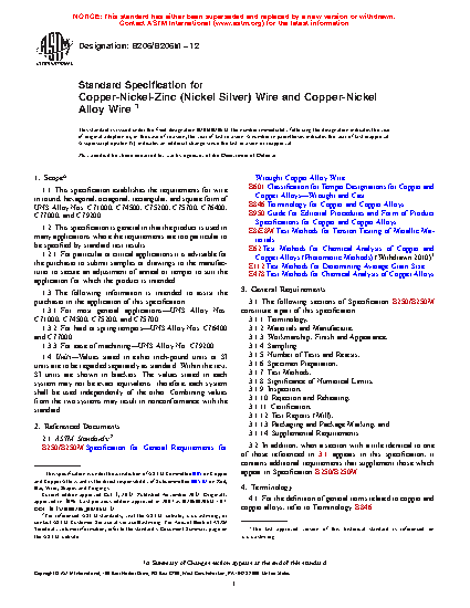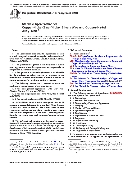 This specification establishes the requirements for wire in round, hexagonal, octagonal, rectangular, and square form of UNS Alloy Nos. C71000, C74500, C75200, C75700, C76400, C77000, and C79200. The chemical composition, temper, annealed wire grain size, tensile strength, and bending requirements are detailed.