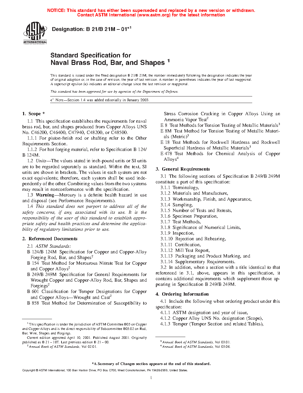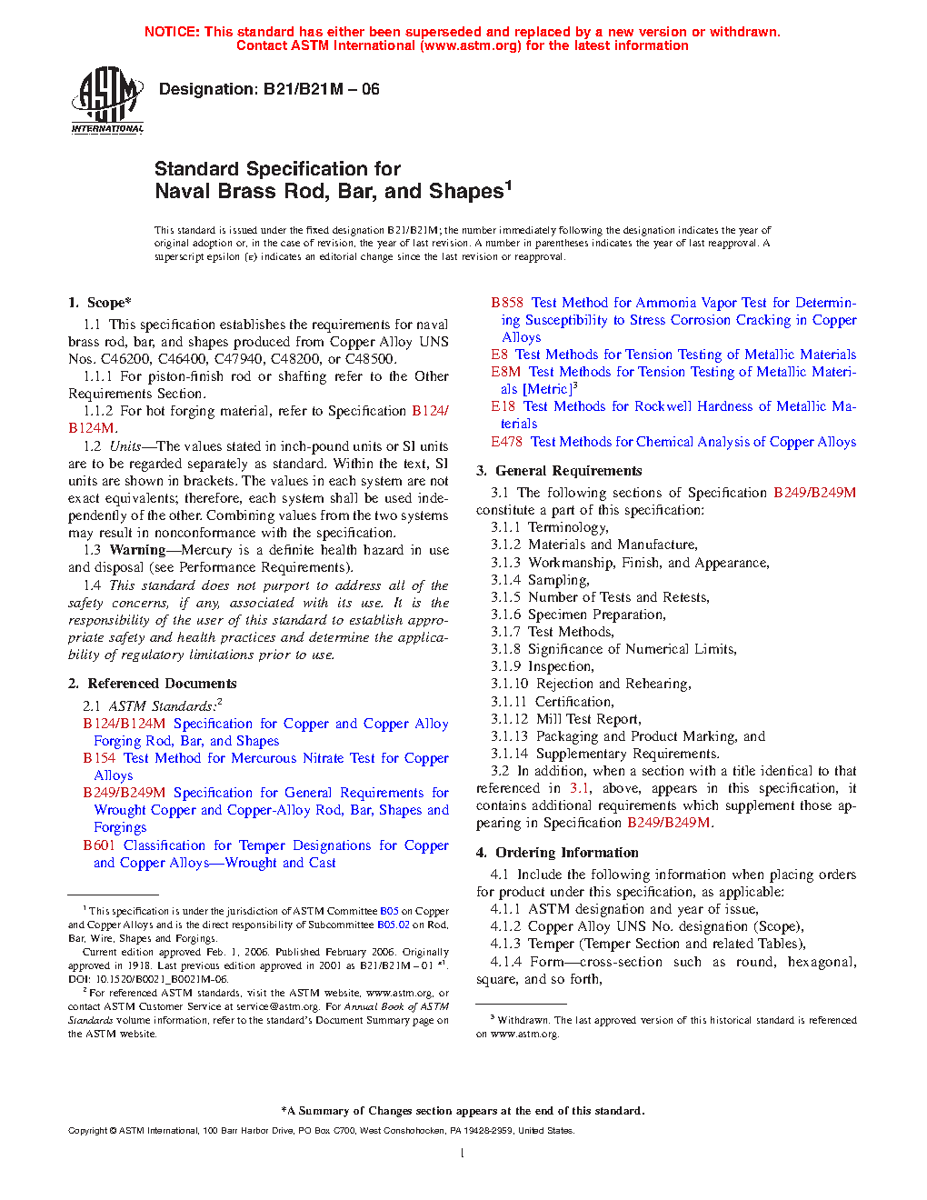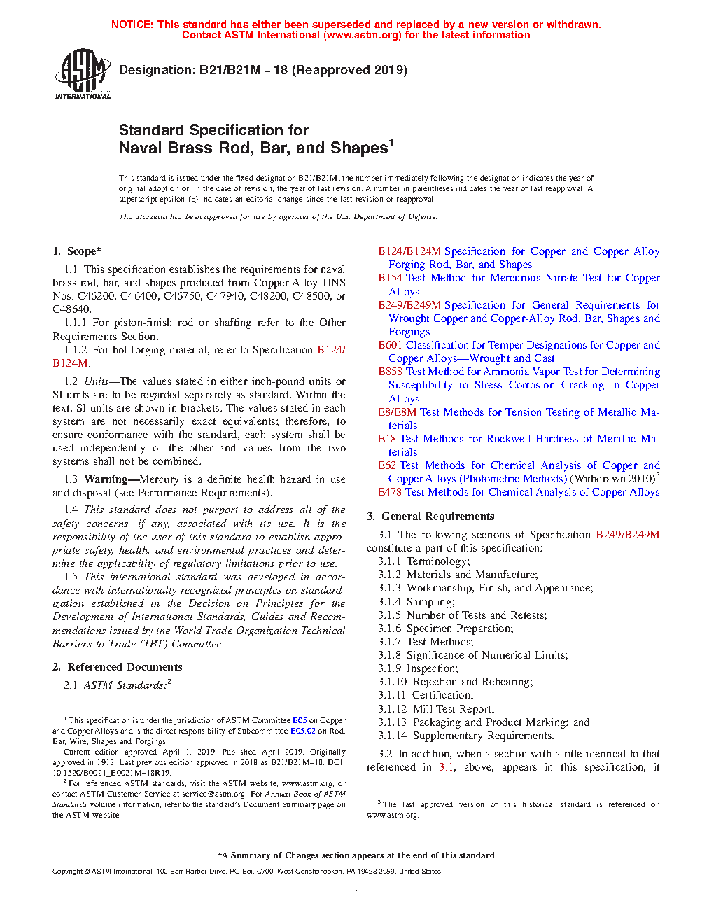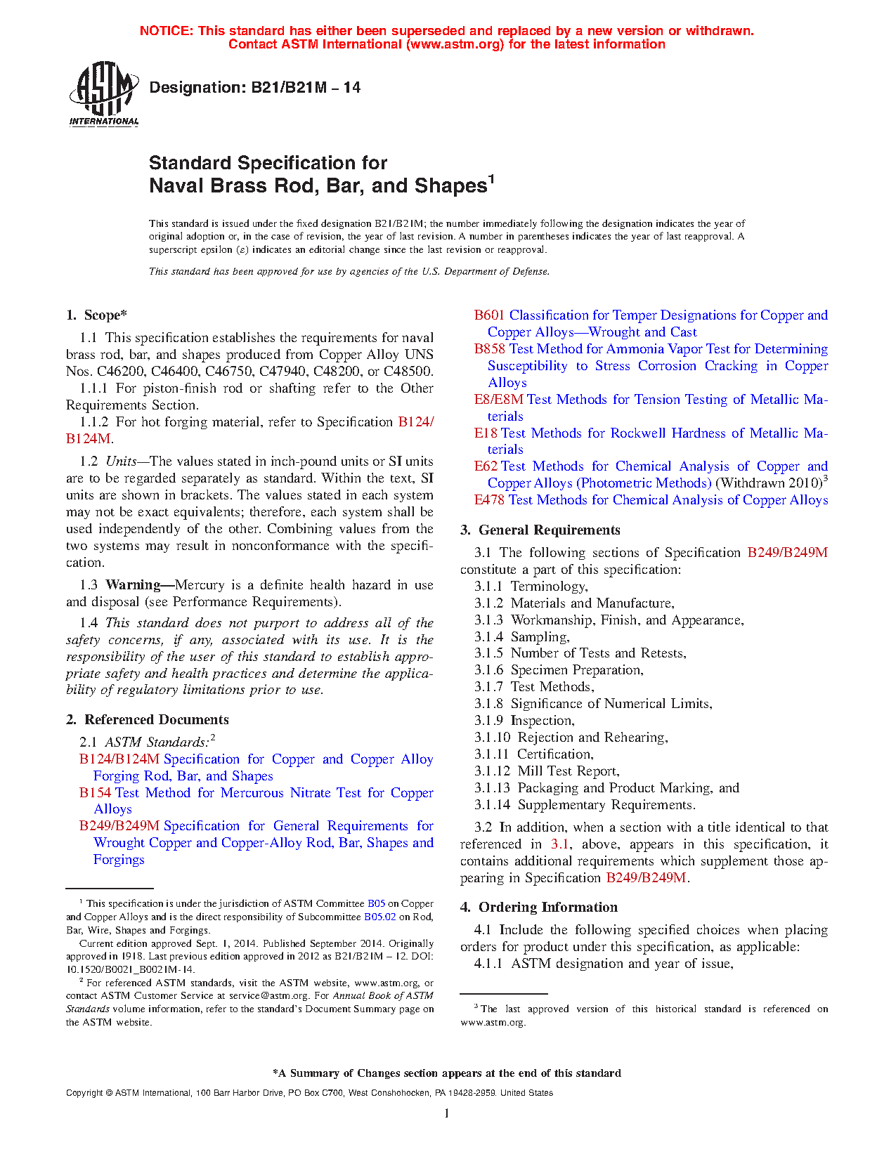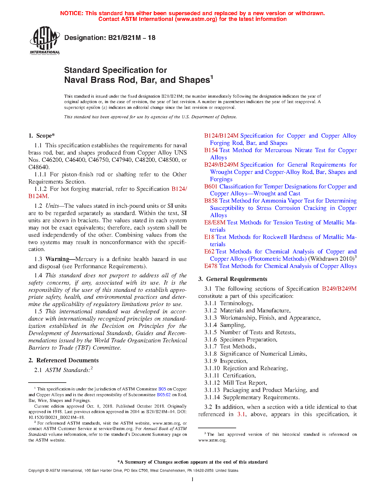 1.1 This specification establishes the requirements for naval brass rod, bar, and shapes produced from Copper Alloy UNS Nos. C46200, C46400, C46750, C47940, C48200, C48500, C48640, or C48645.