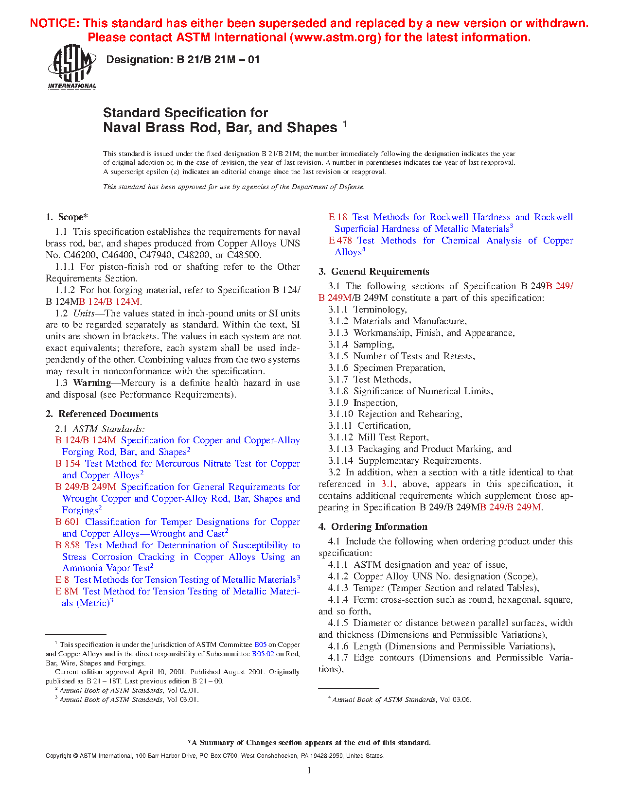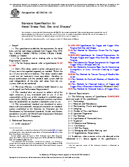 This specification establishes the requirements for rods, bars, and shapes of naval brass with Copper Alloy UNS Nos. C46200, C46400, C47940, C48200, and C48500. Tempers available under this specification are M30 (as-hot extruded), O60 (soft annealed), O50 (light annealed), H60 (cold headed and formed), H02 (½ hard), and H04 (hard). Products shall be tested and shall adhere to dimensional (diameter, shape, length, straightness, and edge contour), mechanical (tensile and yield strength, Rockwell hardness, and elongation), and chemical composition requirements. Products shall also meet piston-finish rod and shafting, and U.S. Government purchase requirements.