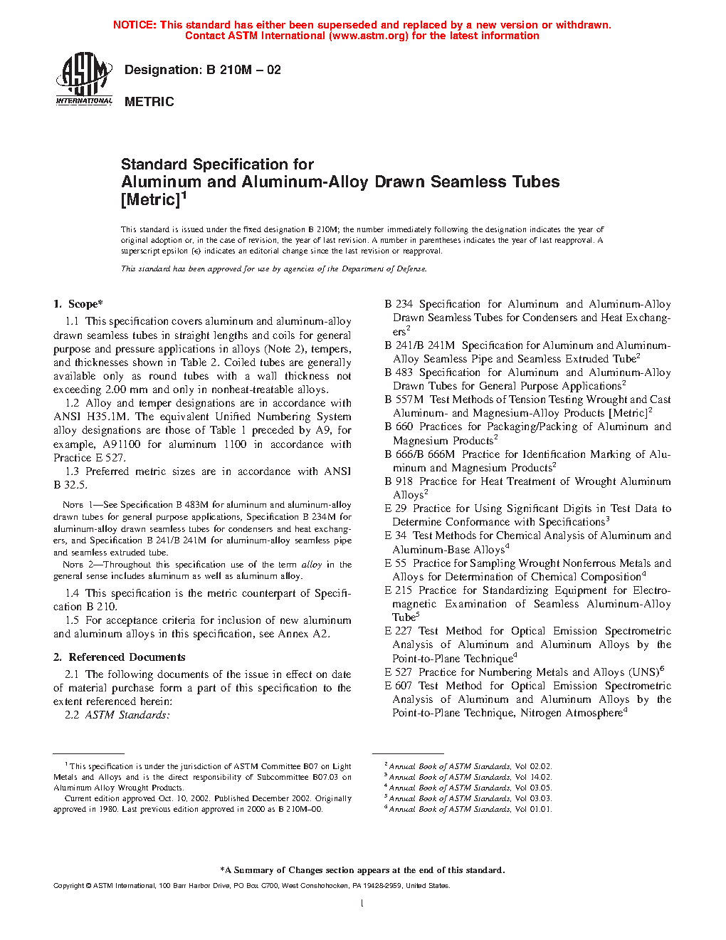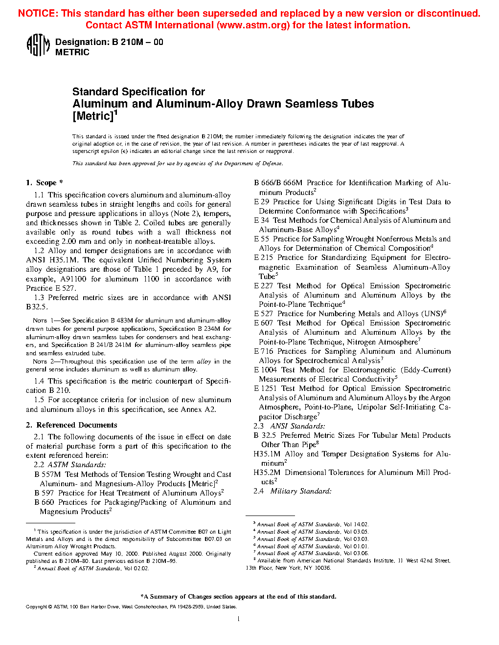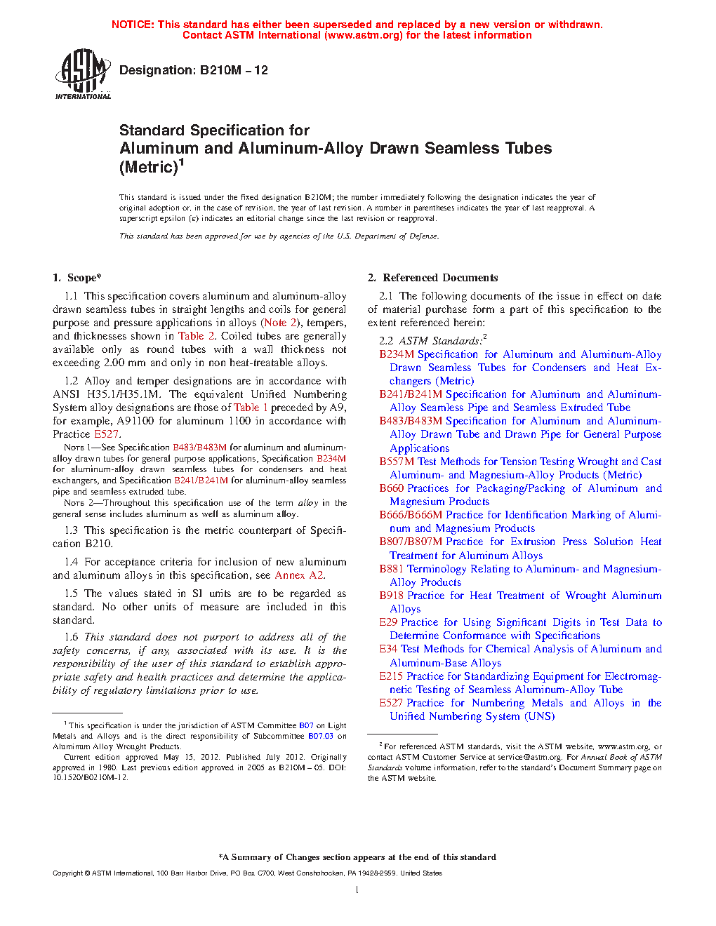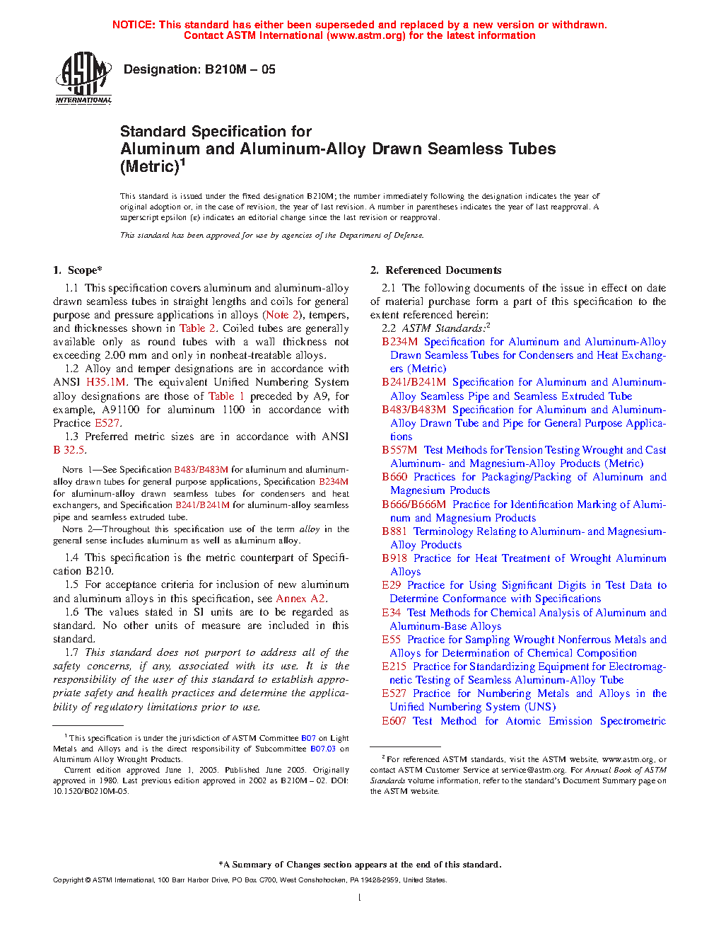 Note 1—See Specification B 483M for aluminum and aluminum-alloy drawn tubes for general purpose applications, Specification B 234M for aluminum-alloy drawn seamless tubes for condensers and heat exchangers, and Specification B 241/B 241M for aluminum-alloy seamless pipe and seamless extruded tube.