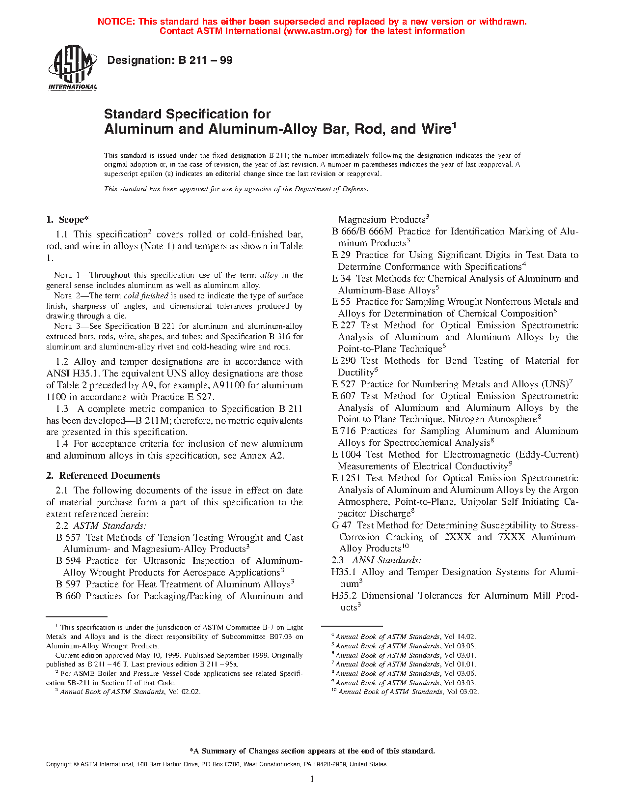 Note 3—See Specification B221 for aluminum and aluminum-alloy extruded bars, rods, wire, shapes, and tubes; and Specification B316/B316M for aluminum and aluminum-alloy rivet and cold-heading wire and rods.