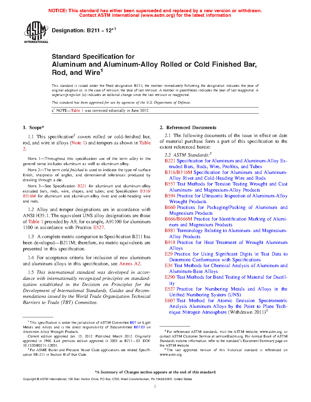 Note 3: See Specification B221 [B221M] for aluminum and aluminum-alloy extruded bars, rods, wire, shapes, and tubes; and Specification B316/B316M for aluminum and aluminum-alloy rivet and cold-heading wire and rods.